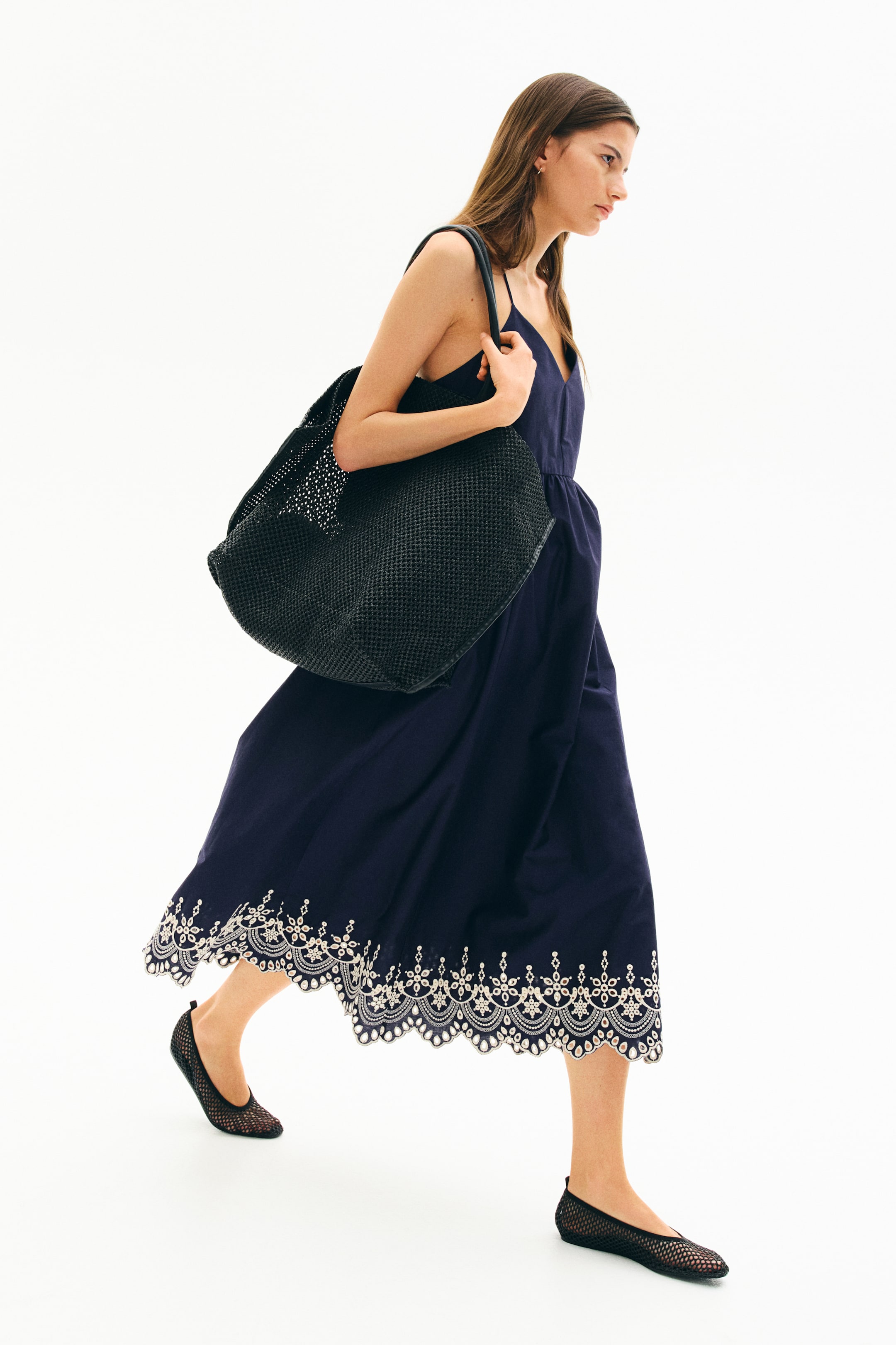 Calf-length dress in a cotton weave with adjustable spaghetti straps that cross at the back. Fitted bodice with a V-neckline and a concealed zip at the back. Seam at the waist and a flared, loose-fit skirt featuring a scalloped hem with broderie anglaise. Lined at the top.