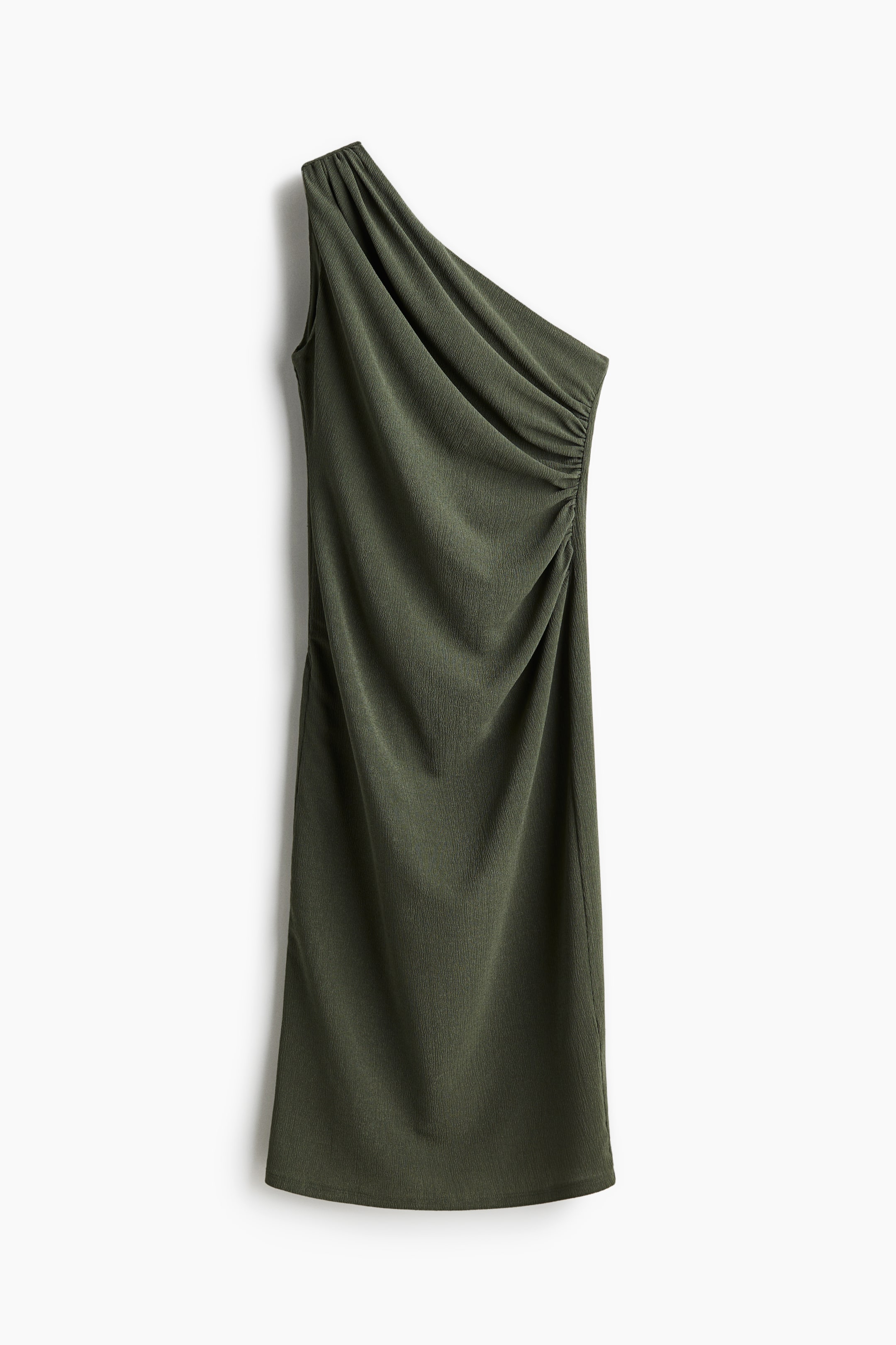 Calf-length one-shoulder dress in textured jersey with gathers on the shoulder and at the opposite side seam for a draped effect.
