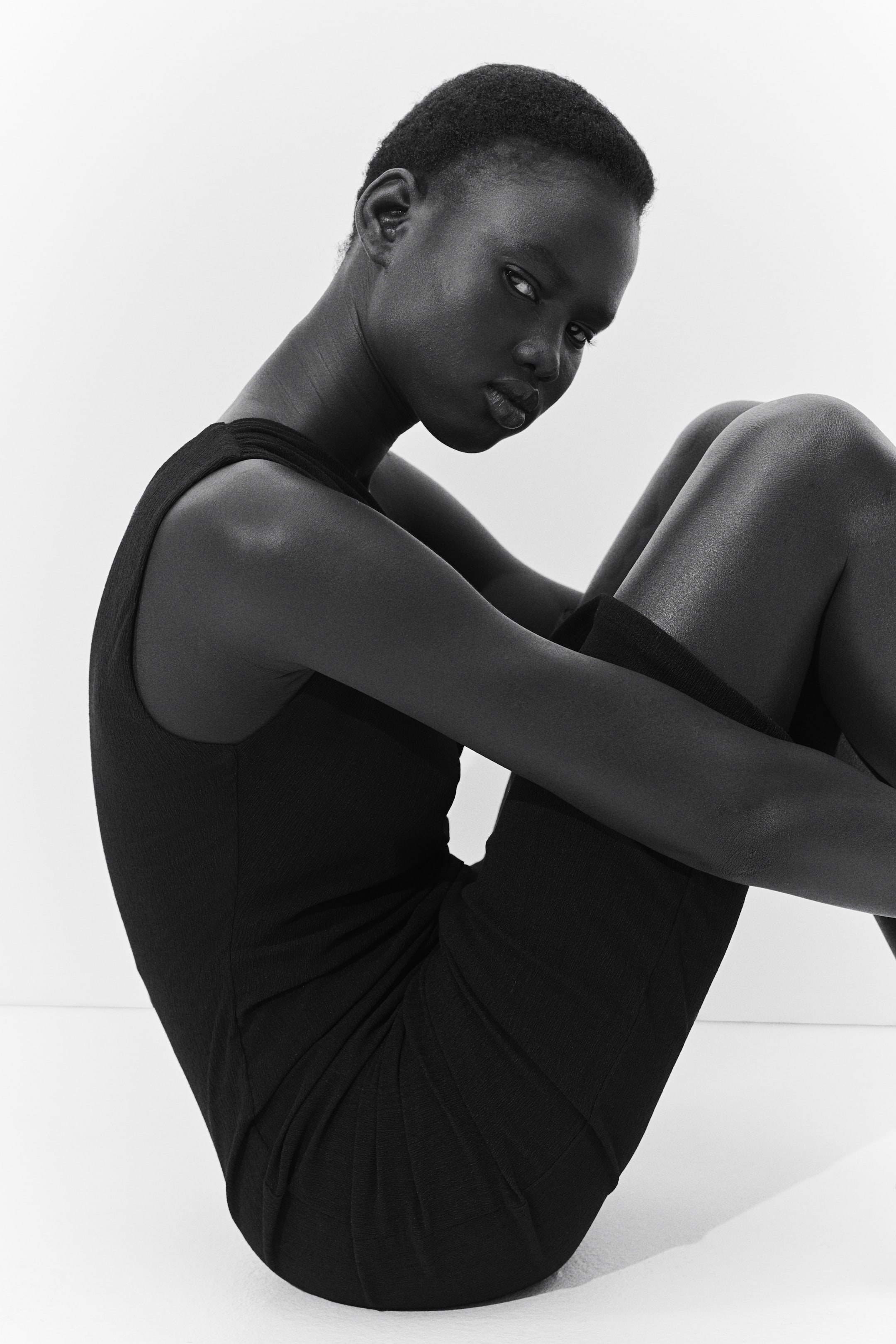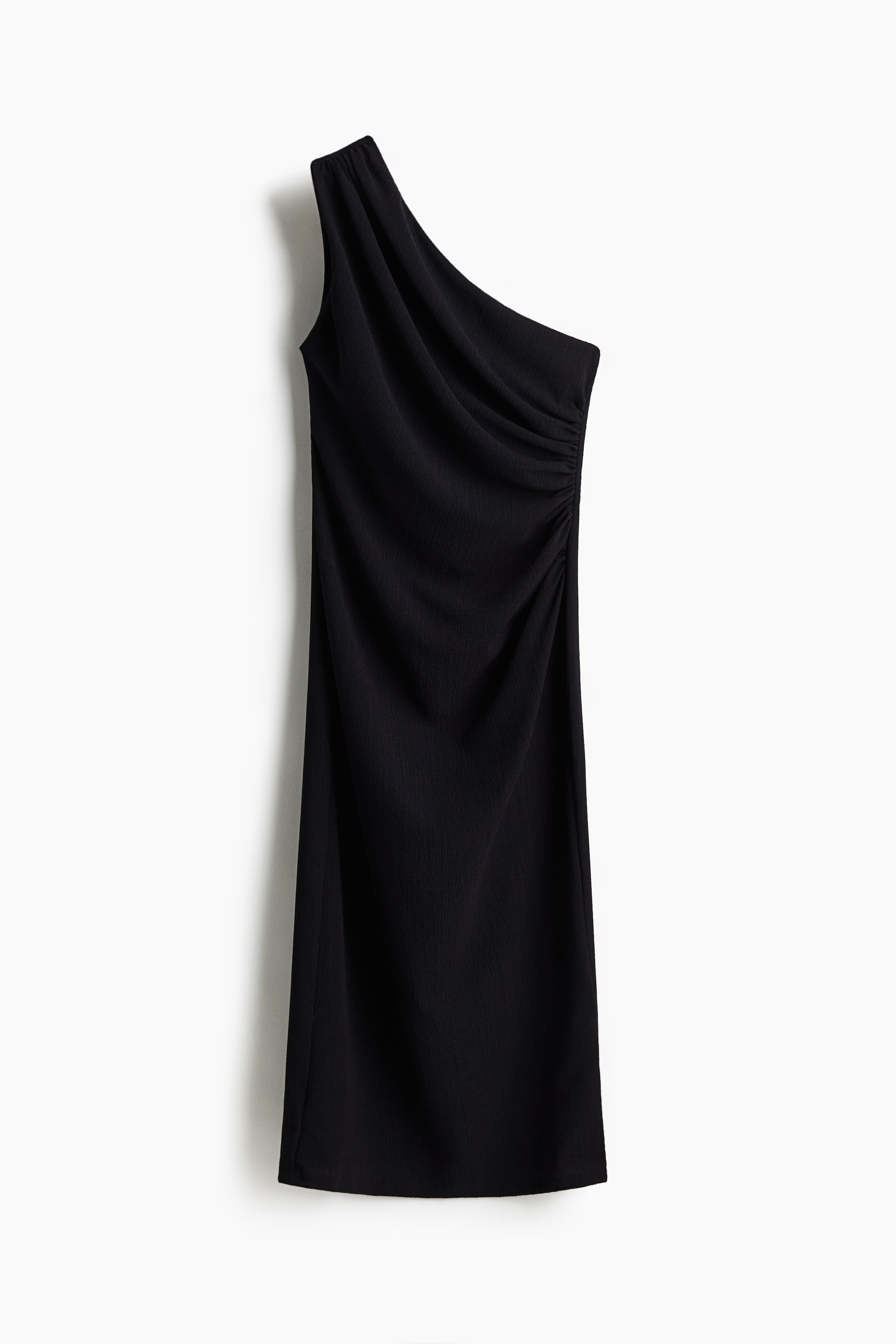 Calf-length one-shoulder dress in textured jersey with gathers on the shoulder and at the opposite side seam for a draped effect.