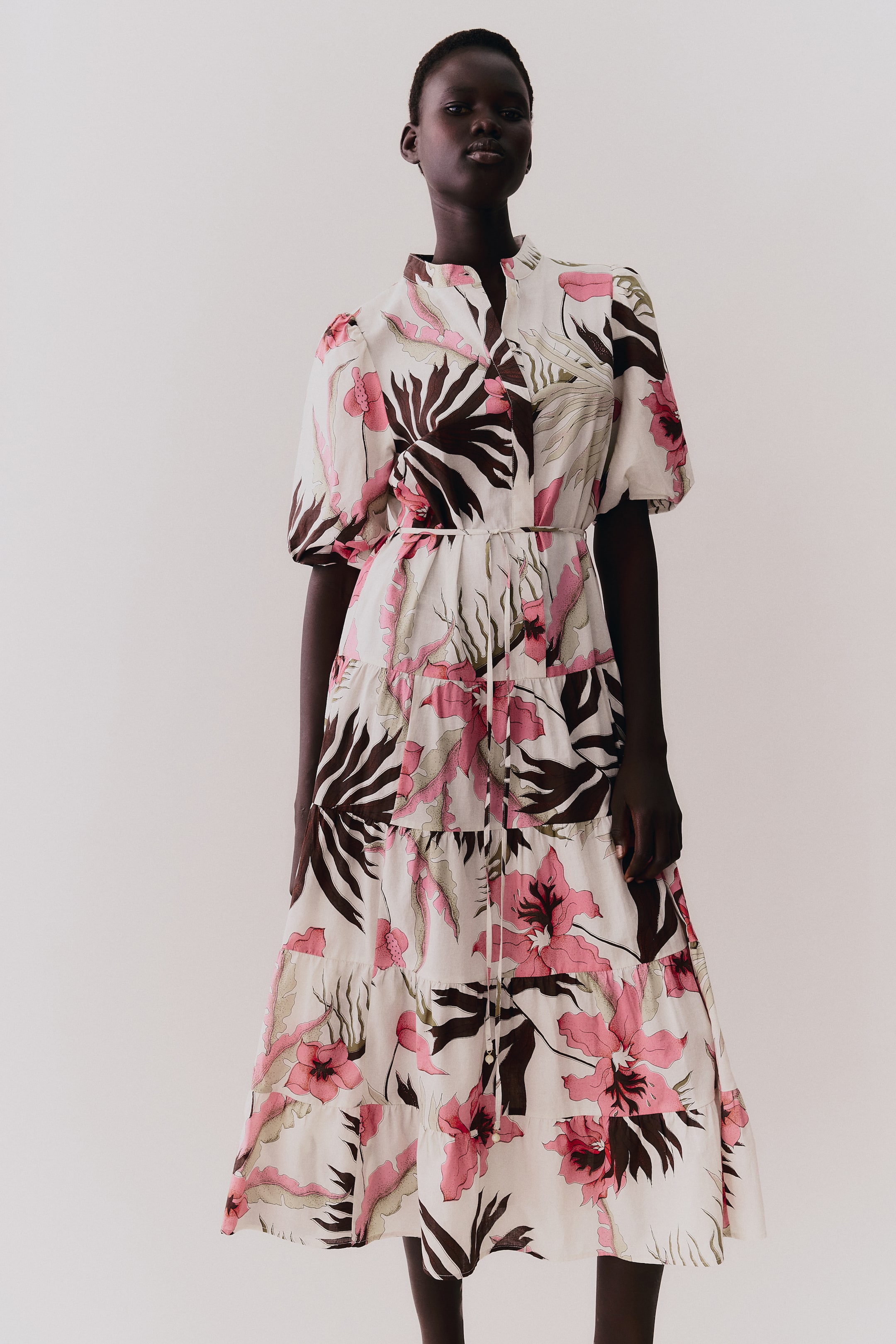 Ankle-length dress in an airy cotton weave with a band collar and concealed buttons at the top. Short balloon sleeves and a narrow, detachable tie belt at the waist. Flared skirt with gathered tiers for added volume. Unlined.
