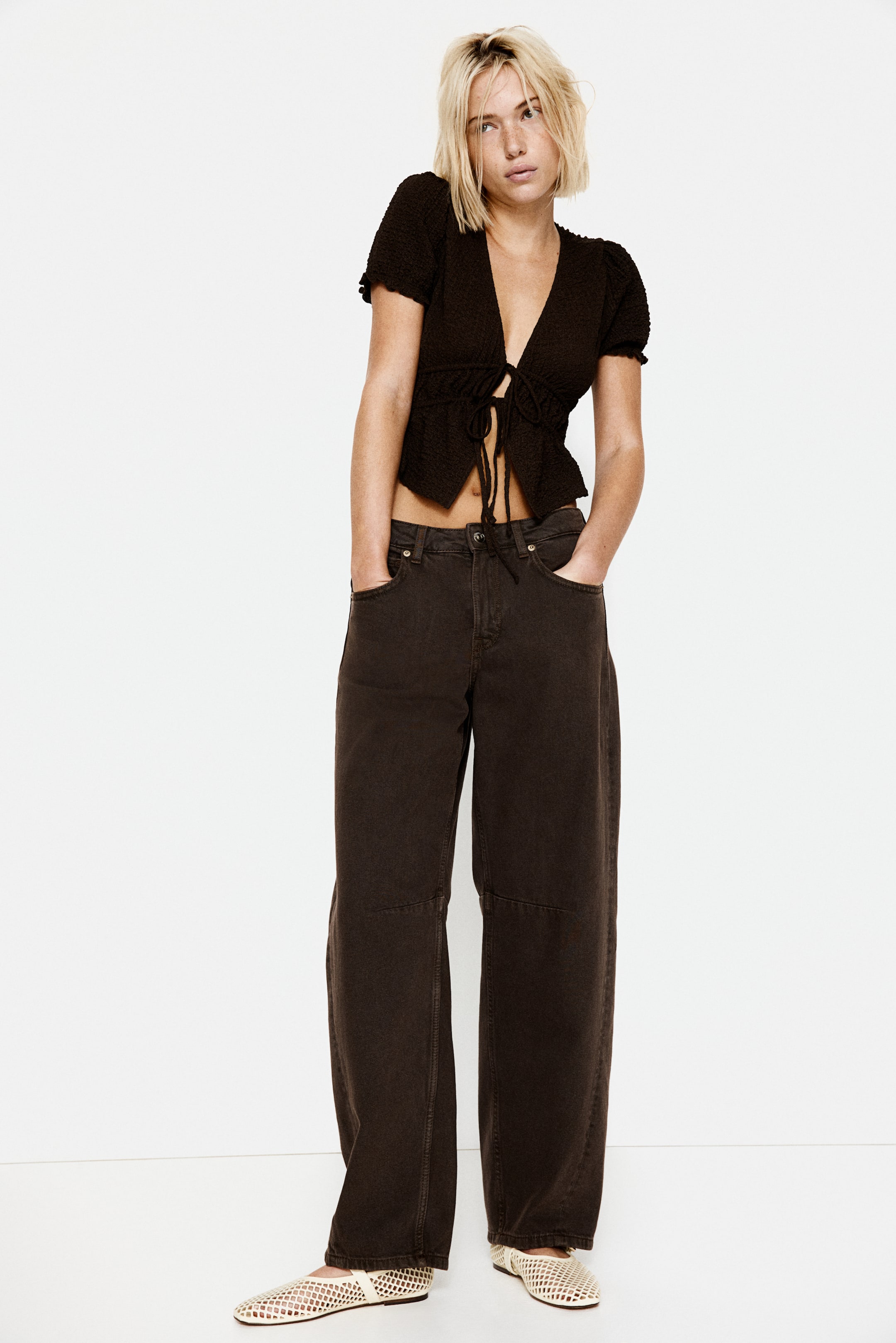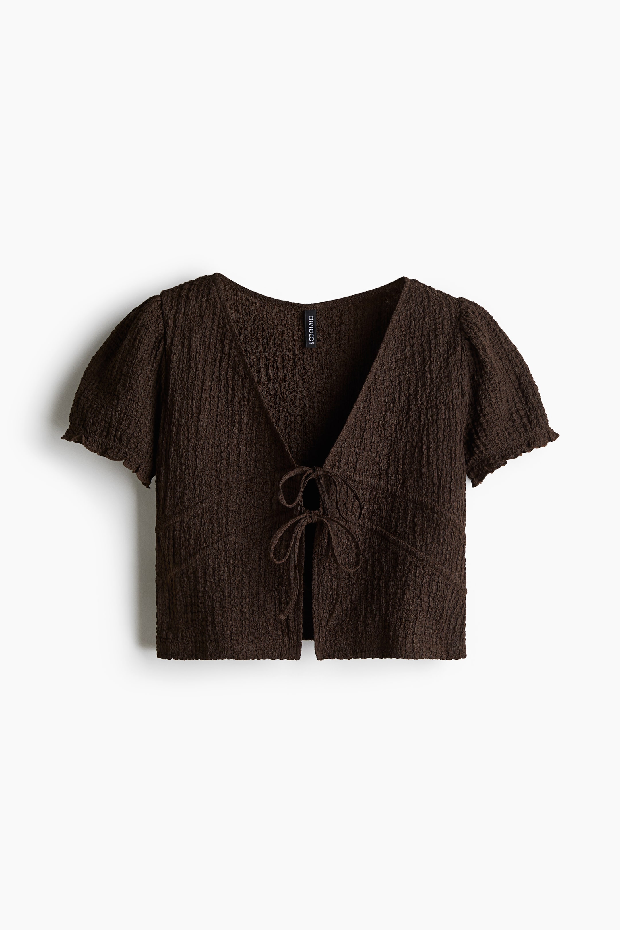 Top in crinkled jersey with a V-shaped opening, an open front and two pairs of drawstring ties that tunnel through the fabric at waist height and fasten at the front. Short puff sleeves with narrow elastication and a small frill trim at the cuffs. Overlocked edges at the cuffs and hem.