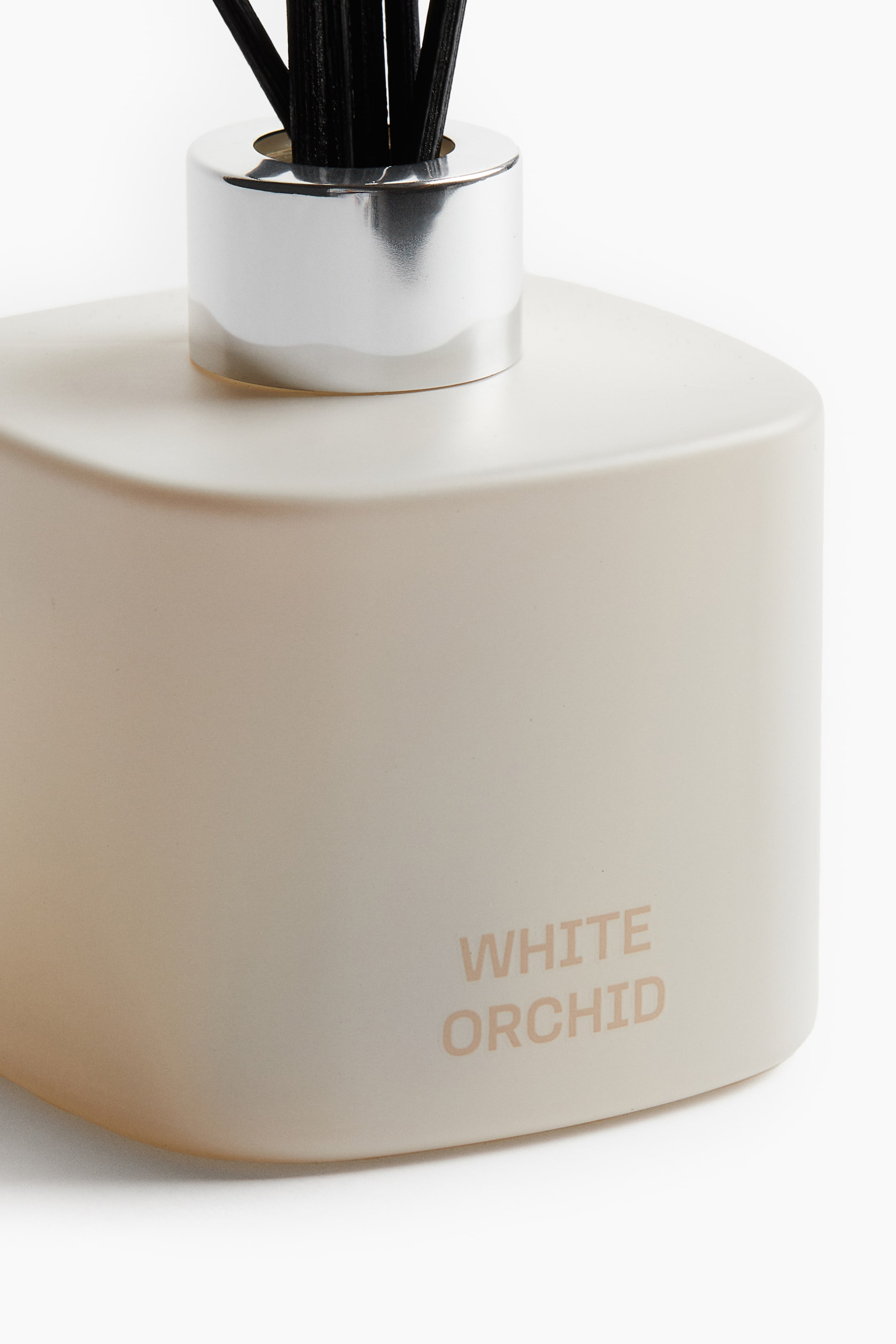 Glass bottle with diffuser sticks featuring a luxurious satin finish. The sticks absorb the scented oil and gently disperse a pleasant fragrance throughout the room.