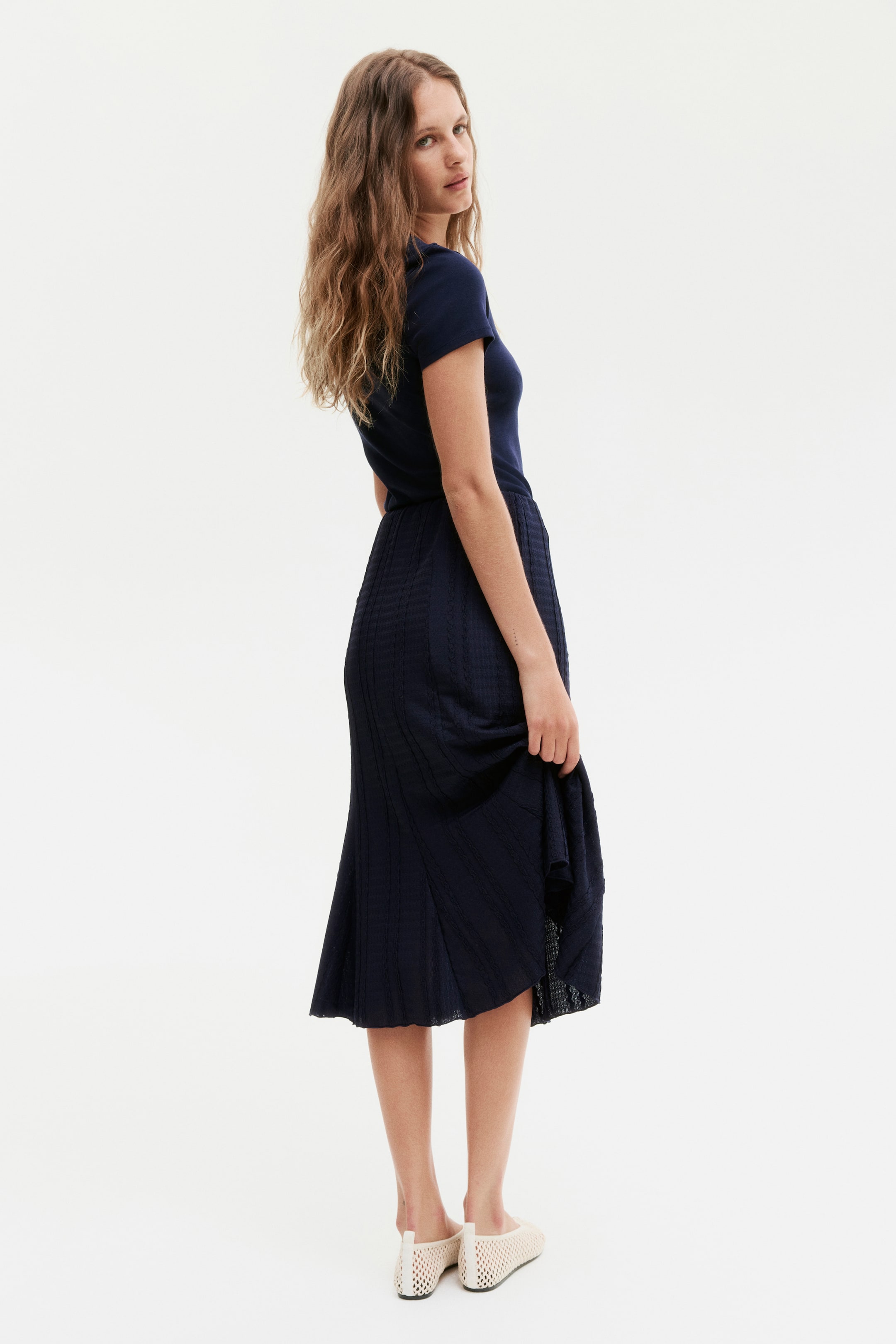 Calf-length skirt in soft jersey with a textured pattern. Features an elasticated waist and godet pleats at the hem for added volume.