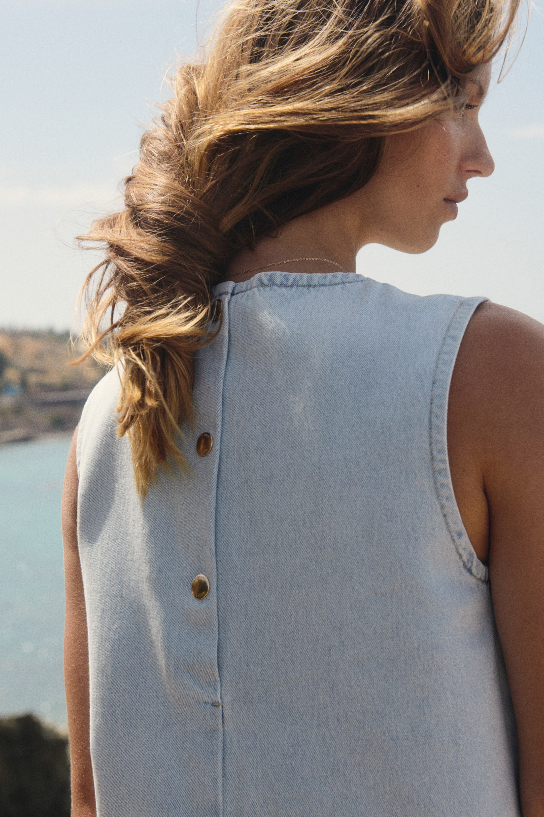 Short, sleeveless dress in cotton denim with a round neckline, bust darts and press-studs at the back of the neck. Unlined.