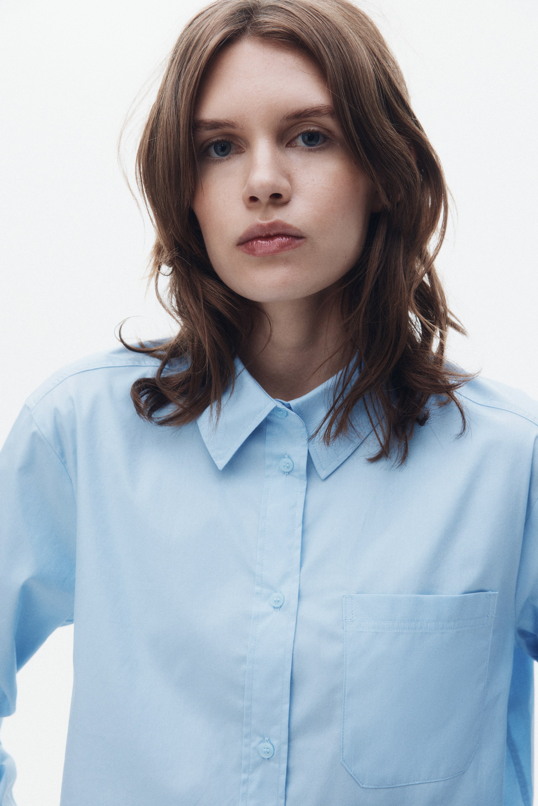 Cropped shirt in a cotton weave featuring a collar, buttons down the front and a yoke with a box pleat at the back. Patch chest pocket, gently dropped shoulders, long sleeves with buttoned cuffs and a gently rounded hem.