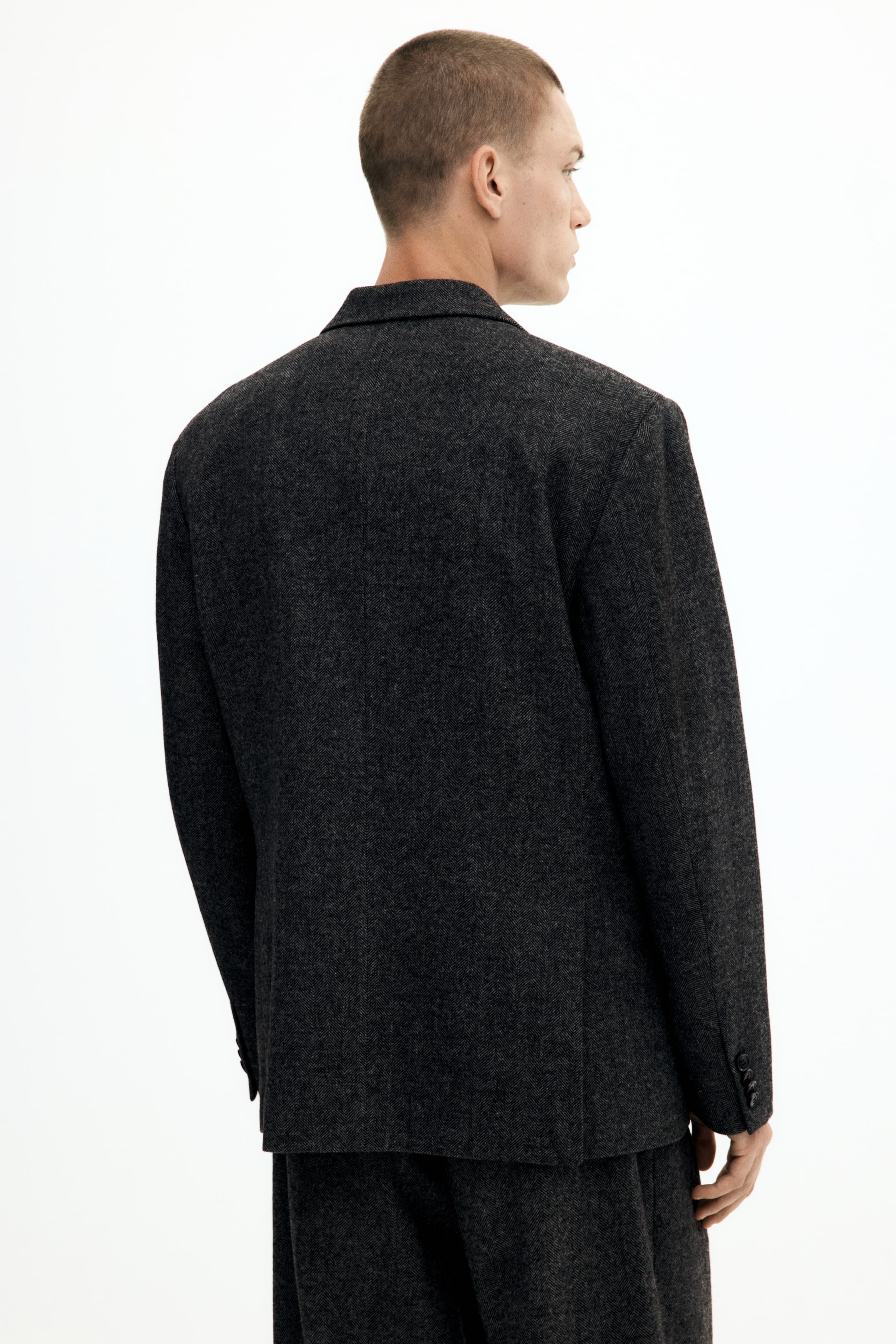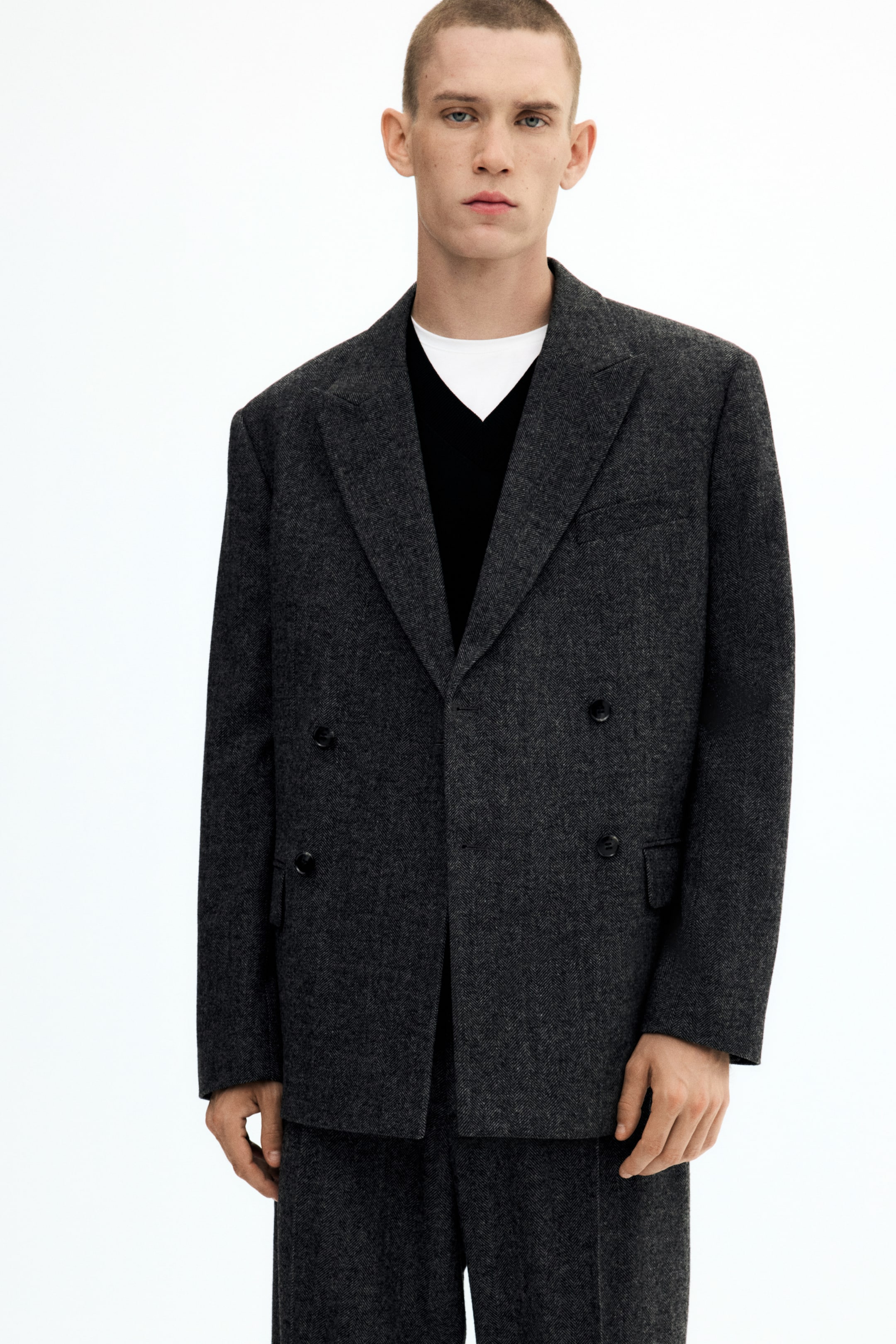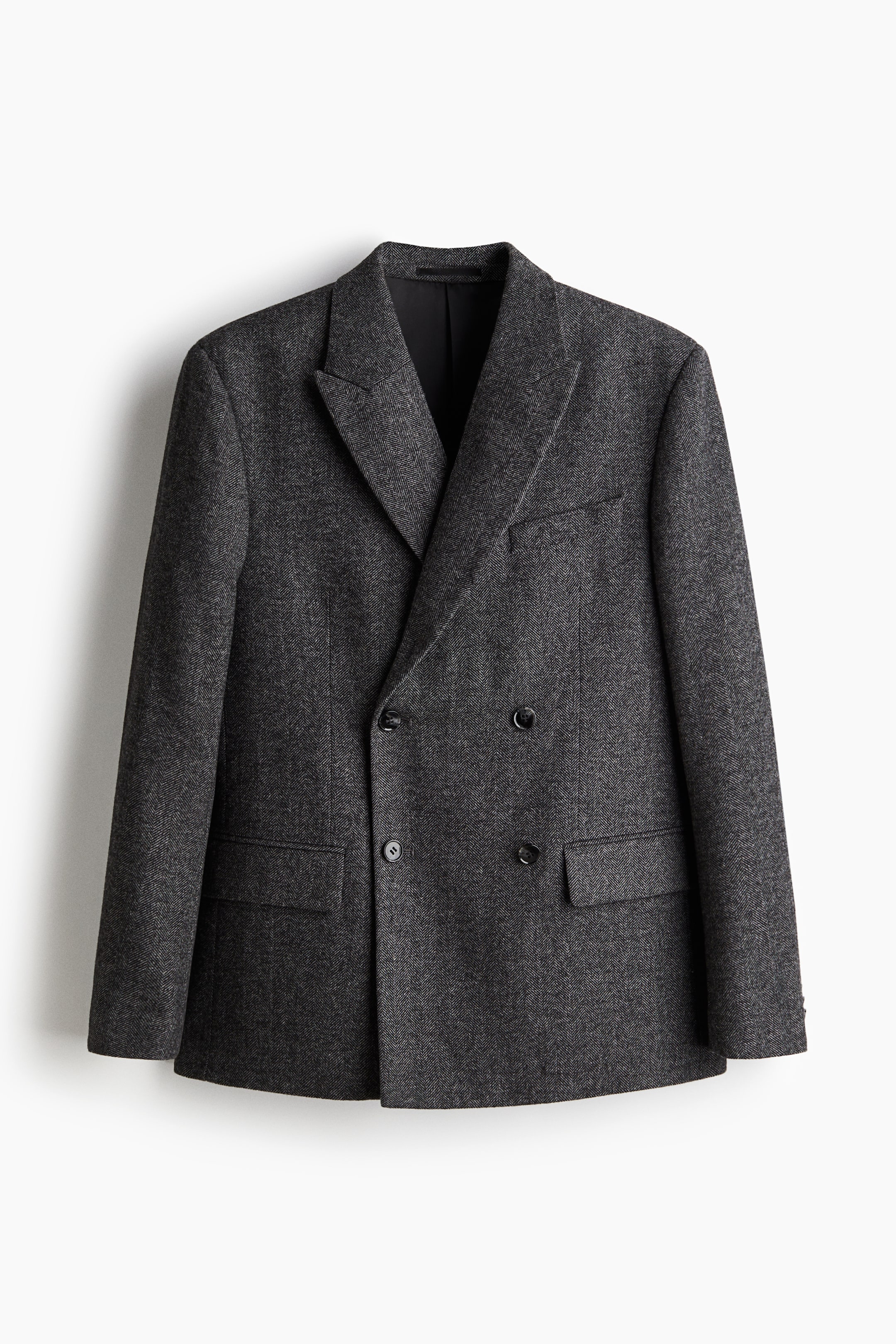 Double-breasted jacket in felted fabric containing some wool. Peak lapels with a decorative buttonhole, a chest pocket, jetted front pockets with a flap, and three inner pockets. Decorative buttons at the cuffs and a double back vent. Relaxed fit for a casual but not oversized silhouette. Lined.