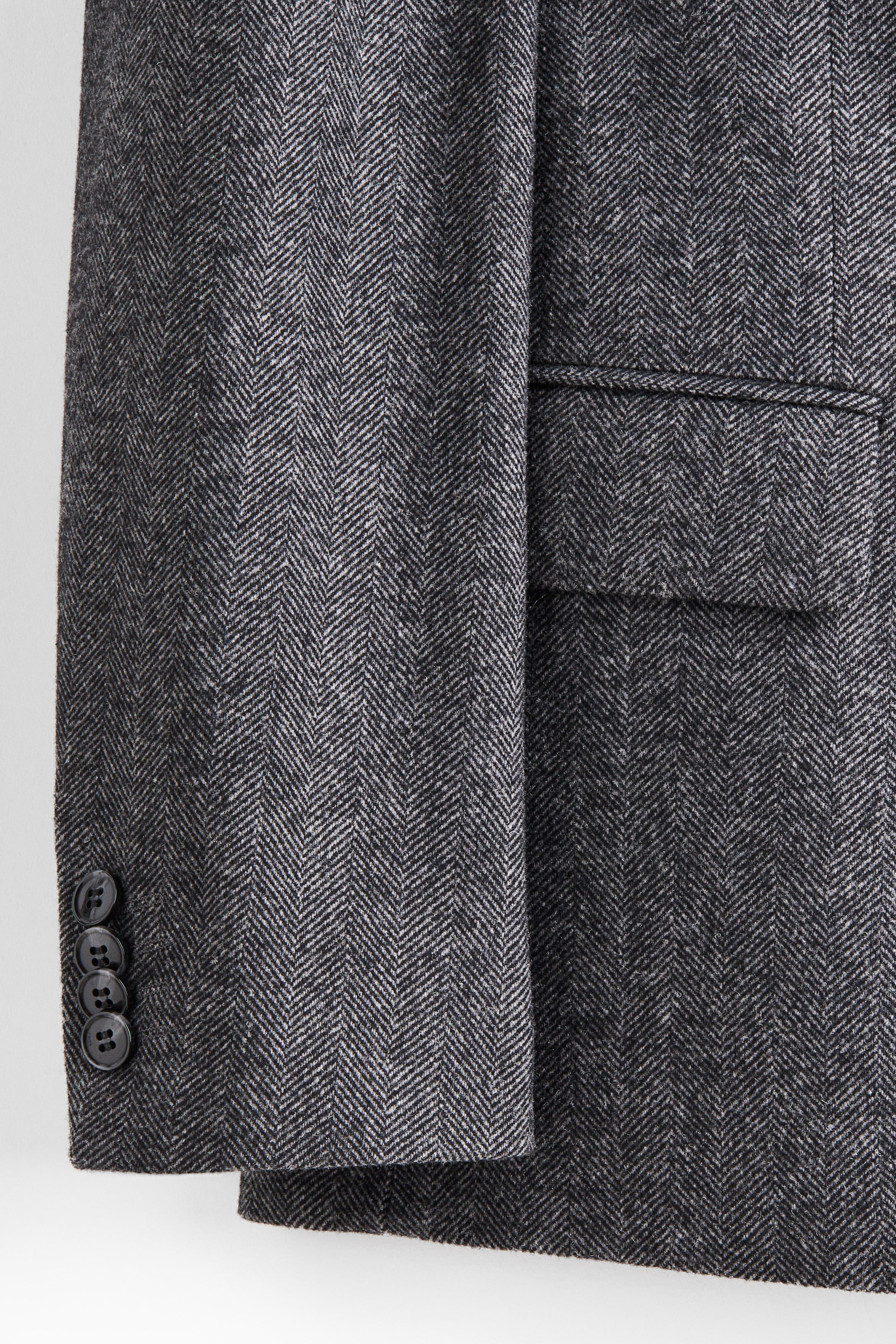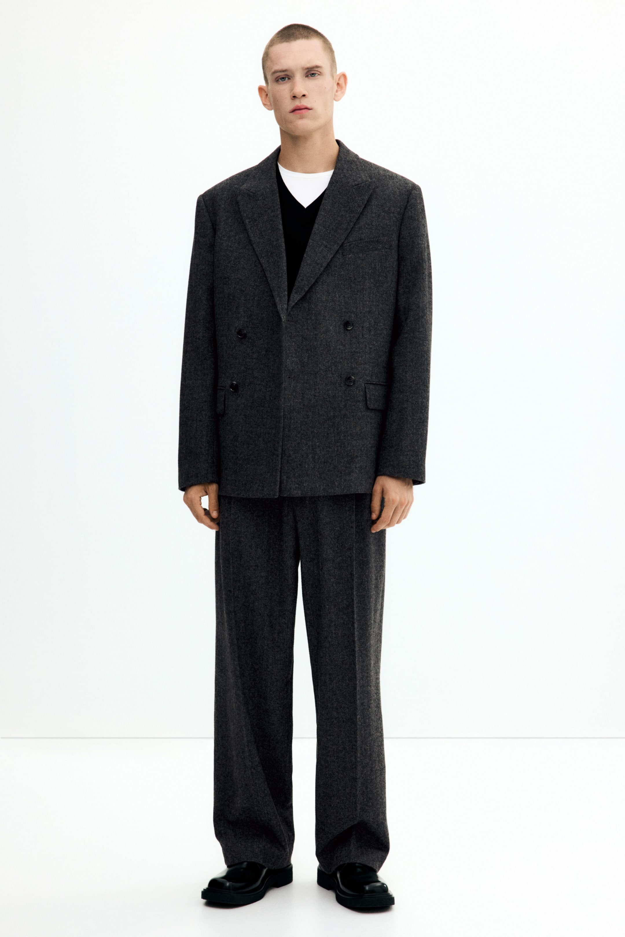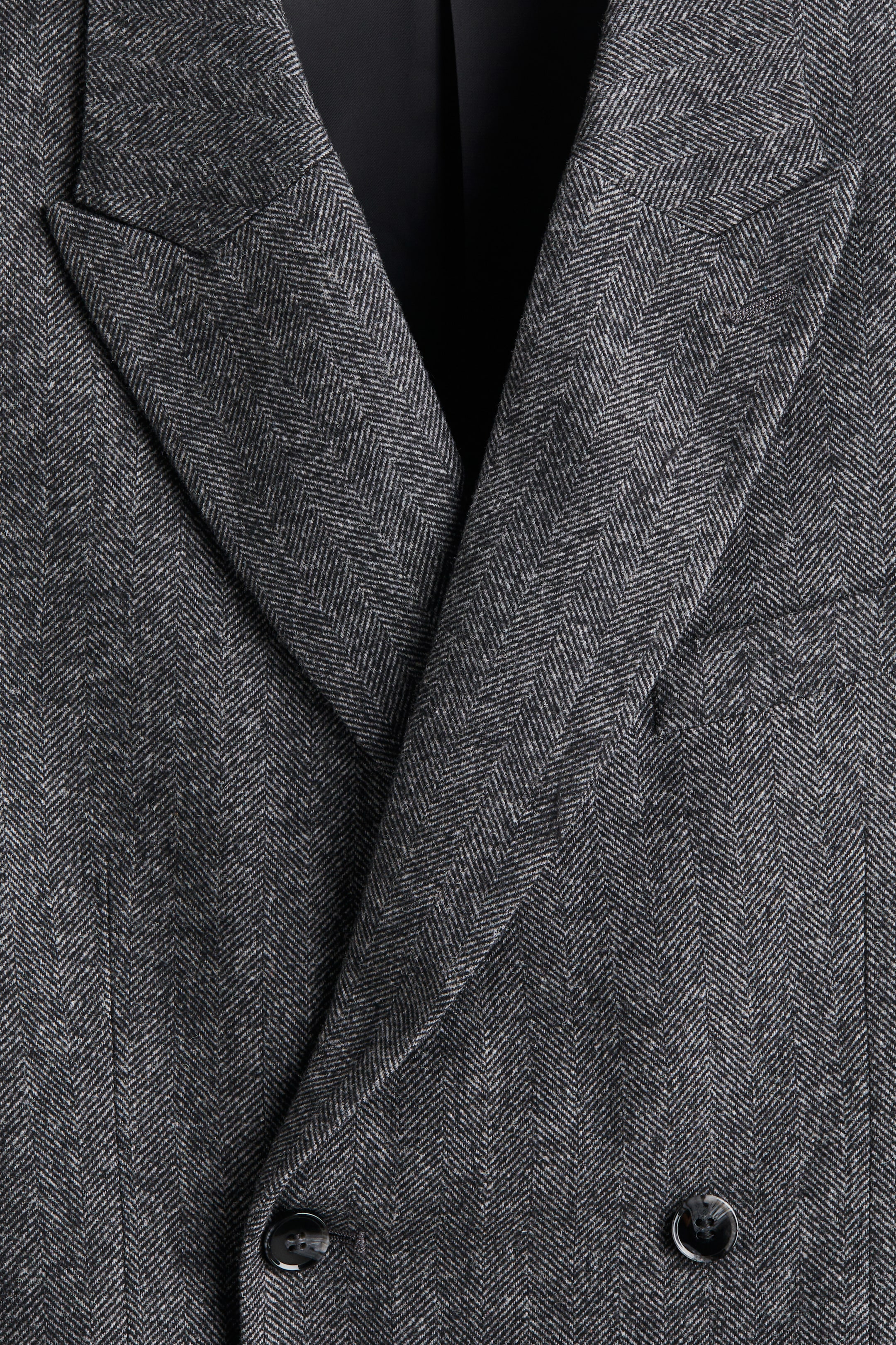 Double-breasted jacket in felted fabric containing some wool. Peak lapels with a decorative buttonhole, a chest pocket, jetted front pockets with a flap, and three inner pockets. Decorative buttons at the cuffs and a double back vent. Relaxed fit for a casual but not oversized silhouette. Lined.