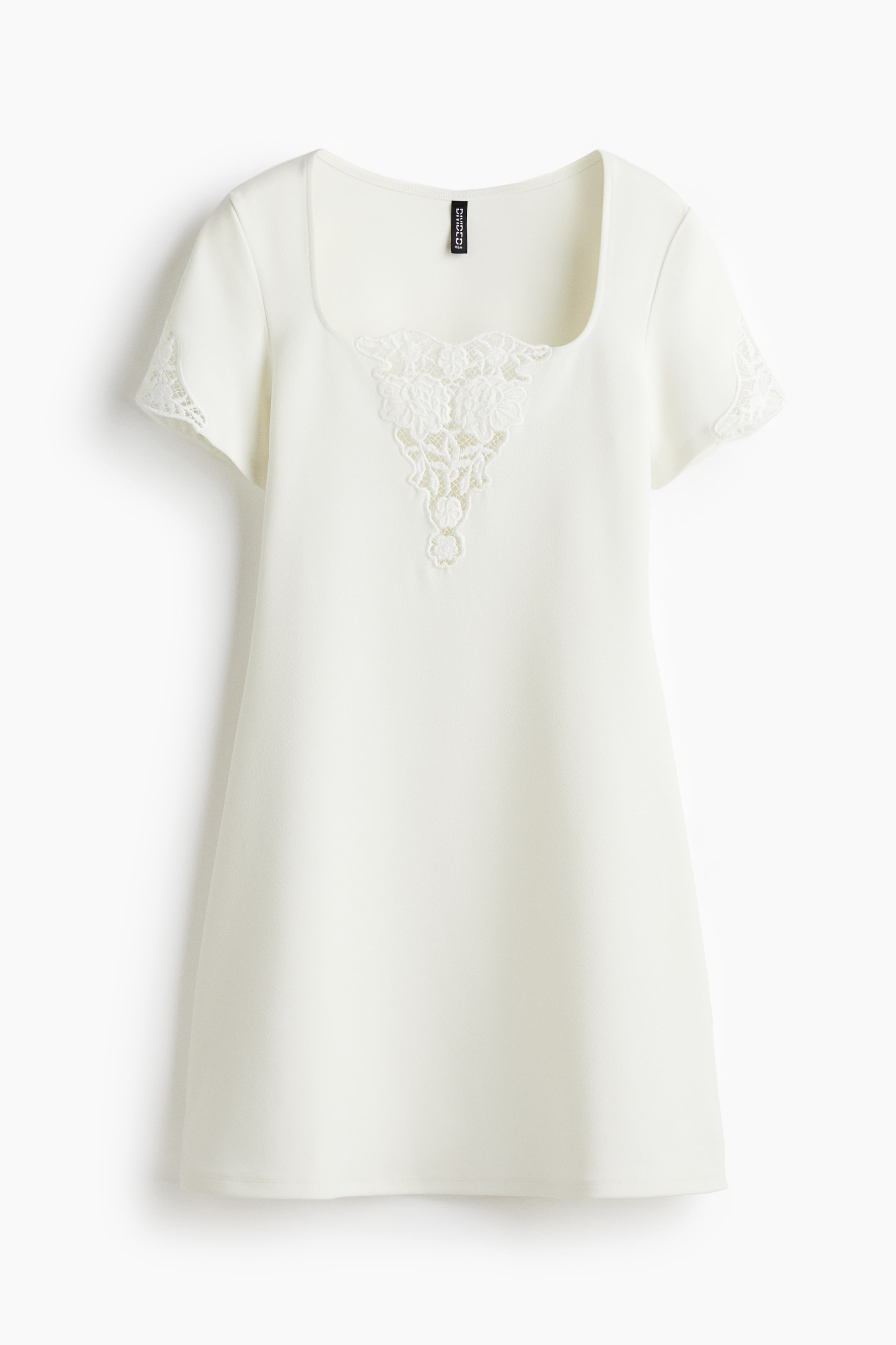Short, fitted dress in heavy interlock jersey detailed with an embroidered inset at the centre of the bust and on the sleeves. It features a deep, square neckline, short sleeves and a gently flared skirt.