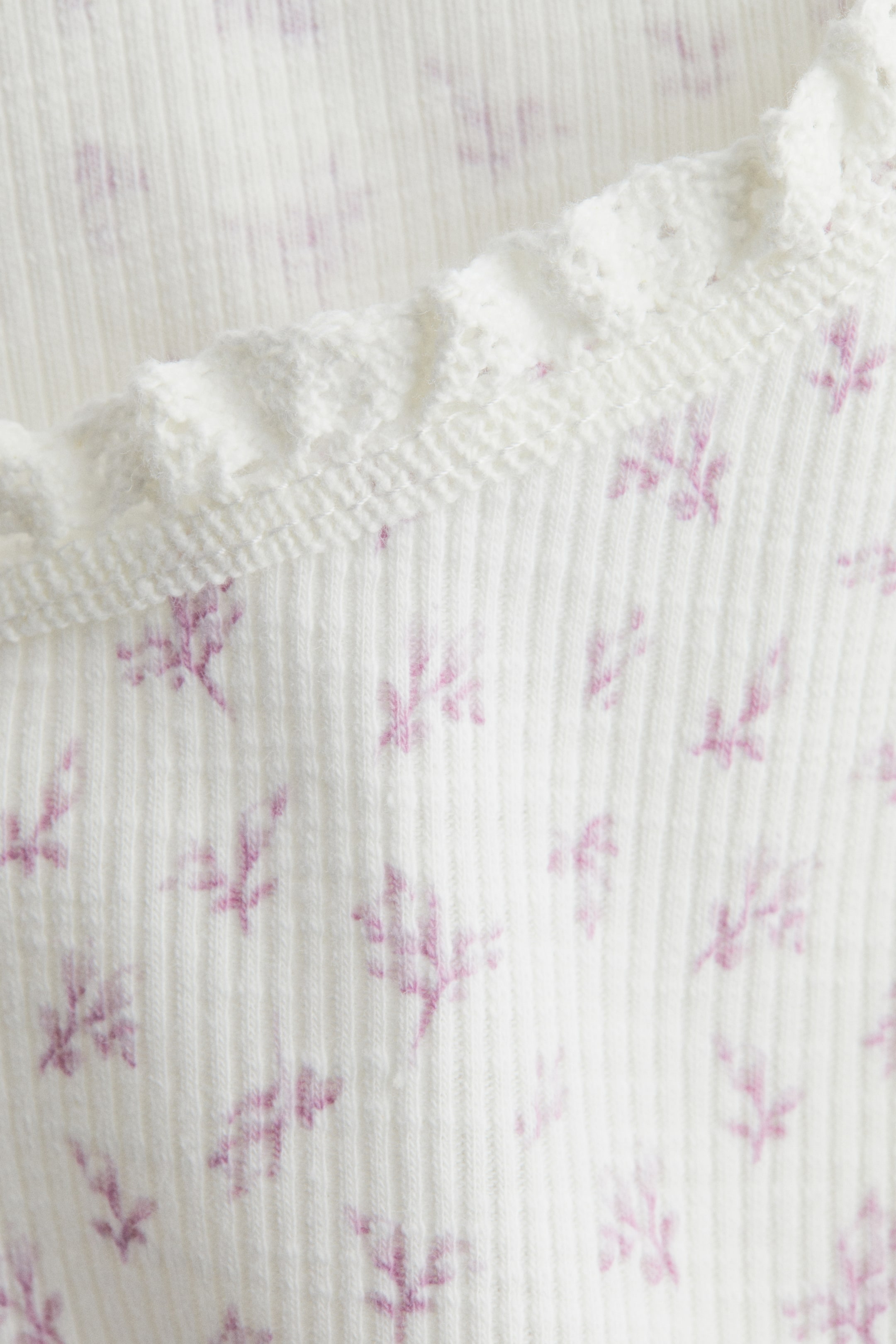 Short, fitted top in soft, ribbed jersey with a round, lace-trimmed neckline. Short sleeves with lace-trimmed cuffs and an overlocked edge at the hem.