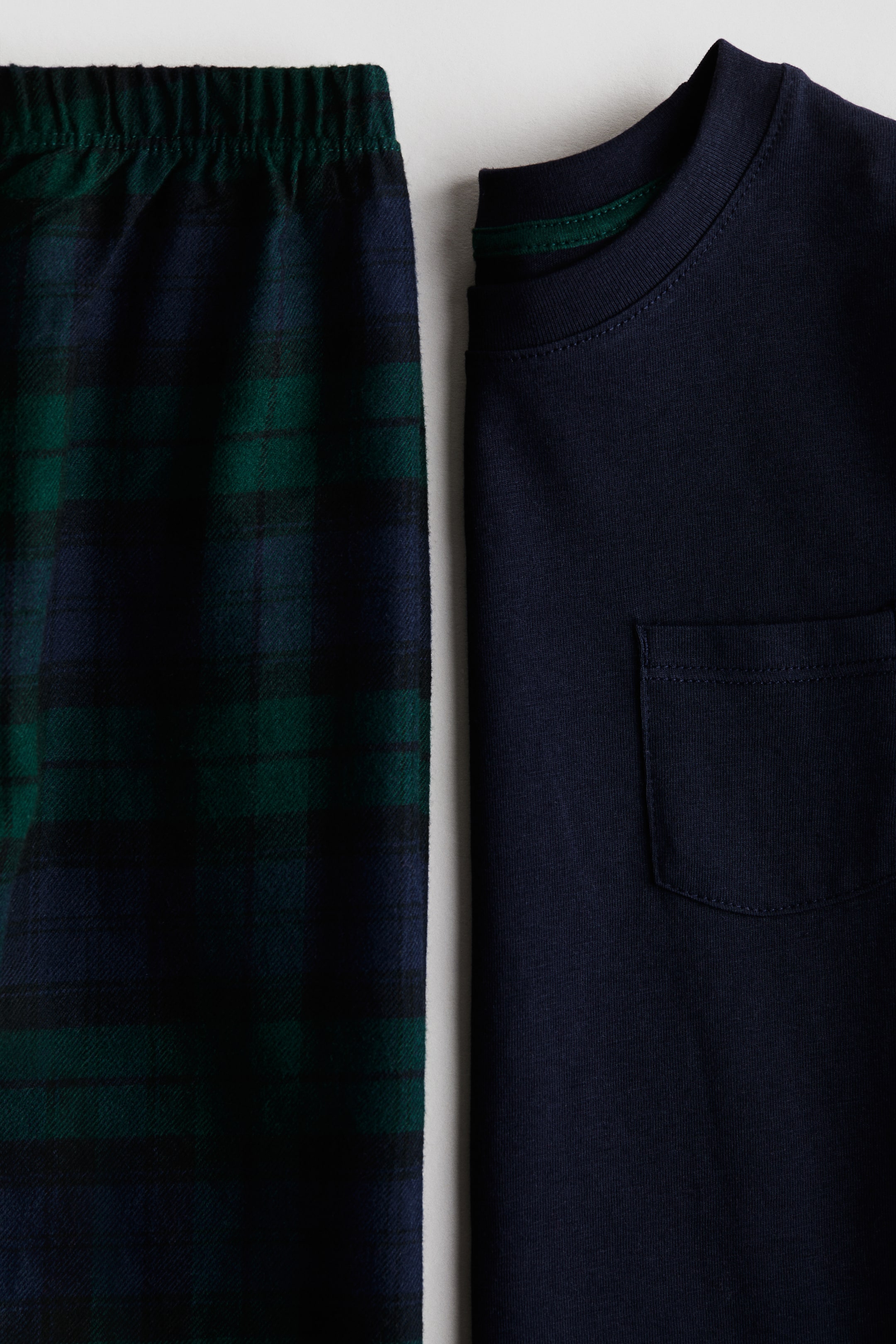 Pyjamas with a top in soft jersey and bottoms in patterned flannel, both made from cotton. Long-sleeved top with a round neckline and bottoms with covered elastication at the waist.