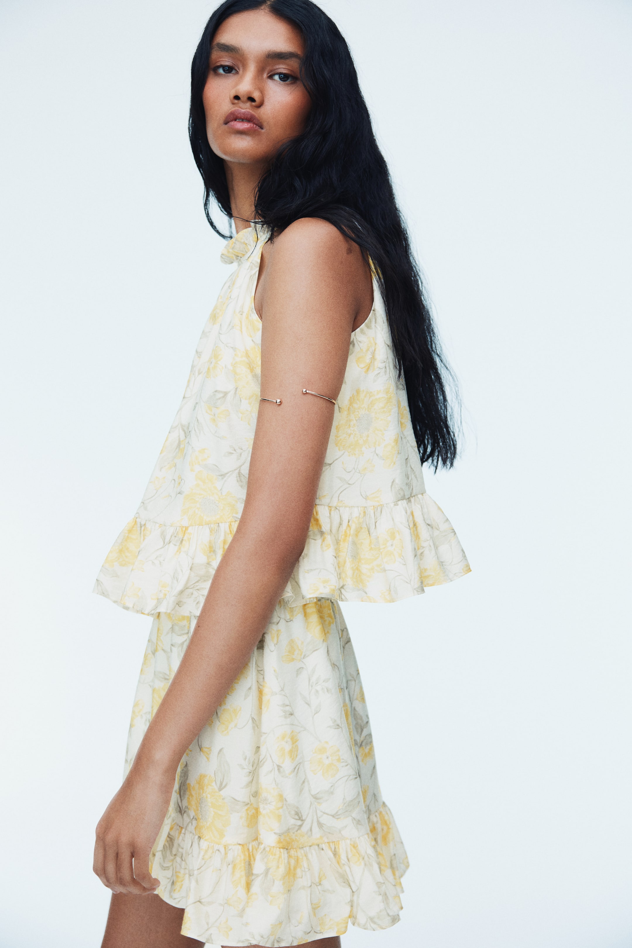 Short, sleeveless top in an airy weave made from a viscose blend. It features a narrow-cut, round neckline with gathers and a frill trim at the front and back and a keyhole opening with narrow ties at the back. Gathered seam above the hem for added volume. Lined.