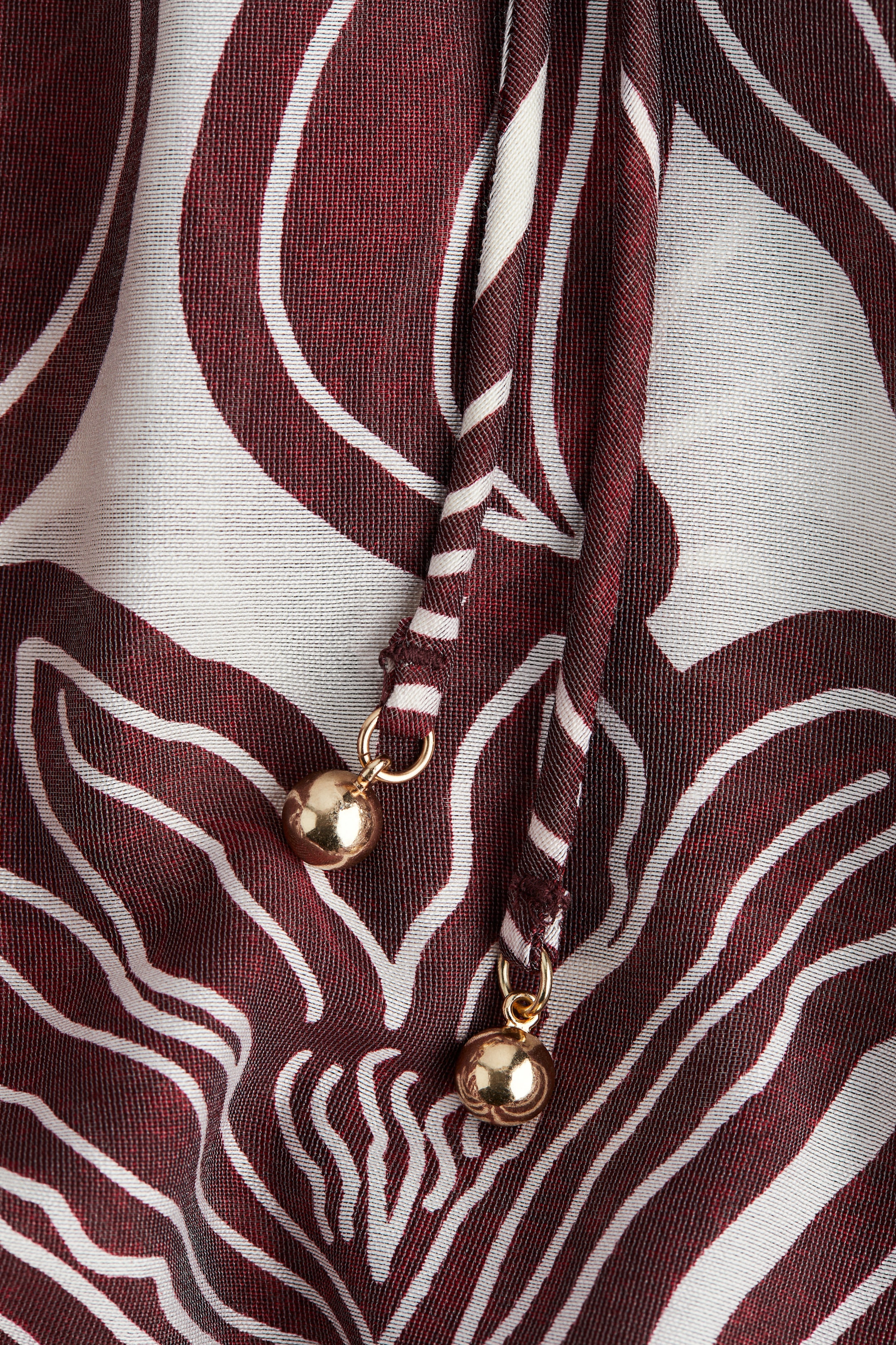 Ankle-length, oversized dress in a viscose-blend weave with a slight sheen. Round neckline with gathers all around, covered buttons down the front and a narrow, detachable tie belt at the waist with a decorative bead at the ends. Long, raglan balloon sleeves with narrow binding at the cuffs. Gathered seam above the hem for added volume. Unlined.