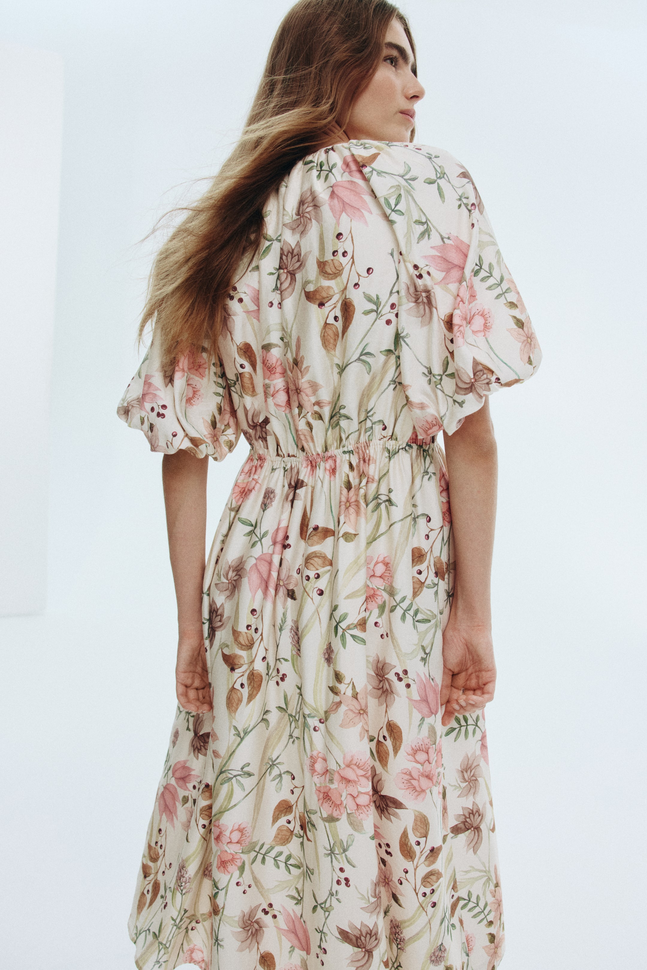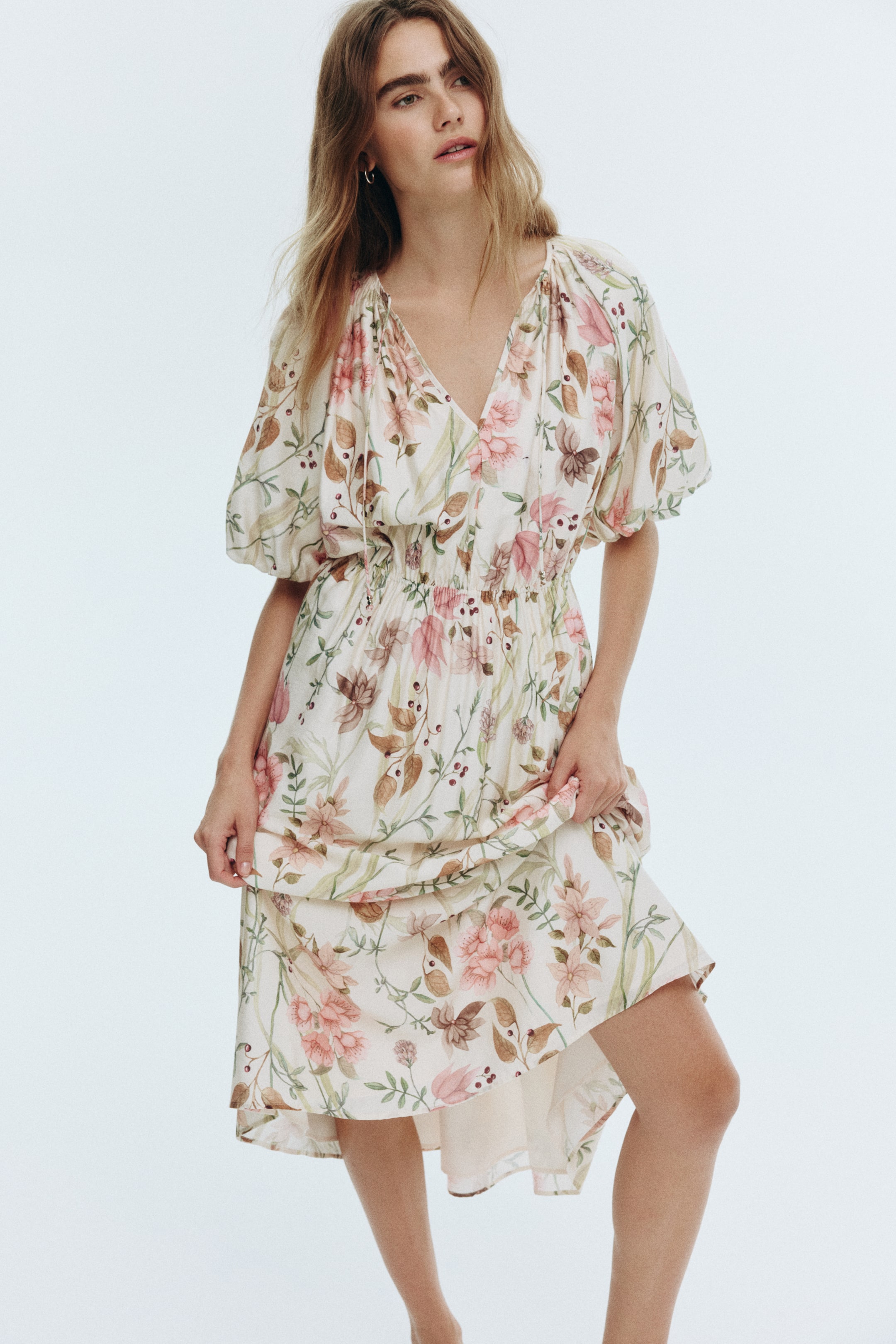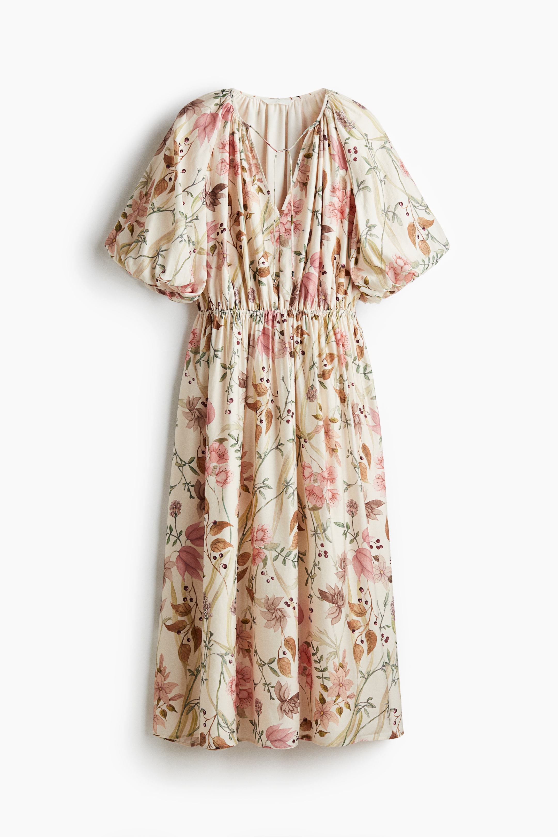 Calf-length dress in woven fabric featuring a round neckline with gathers all around and a V-shaped opening with narrow ties at the front. Narrow elastication at the waist and raglan balloon sleeves that finish just above the elbows. Lined.