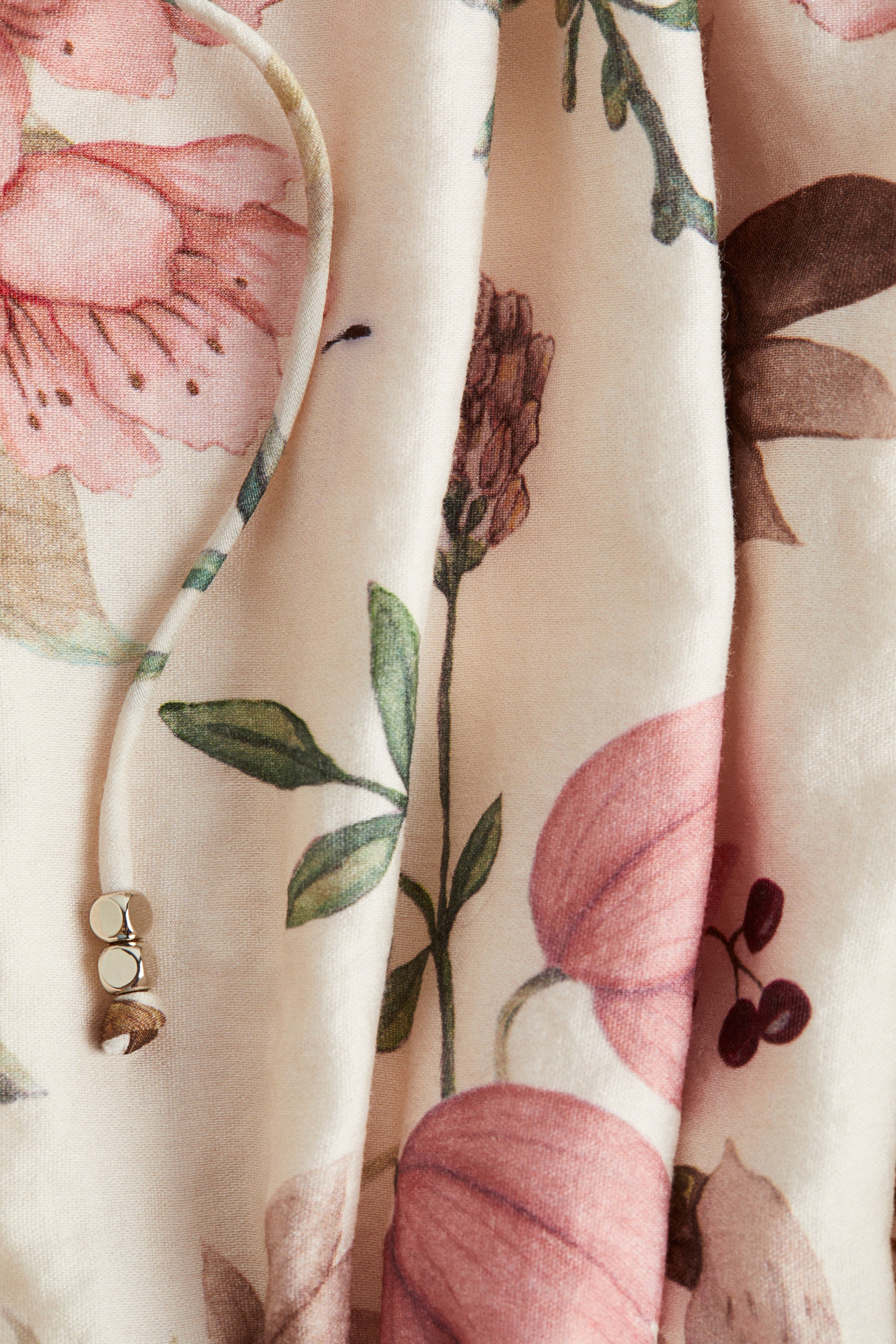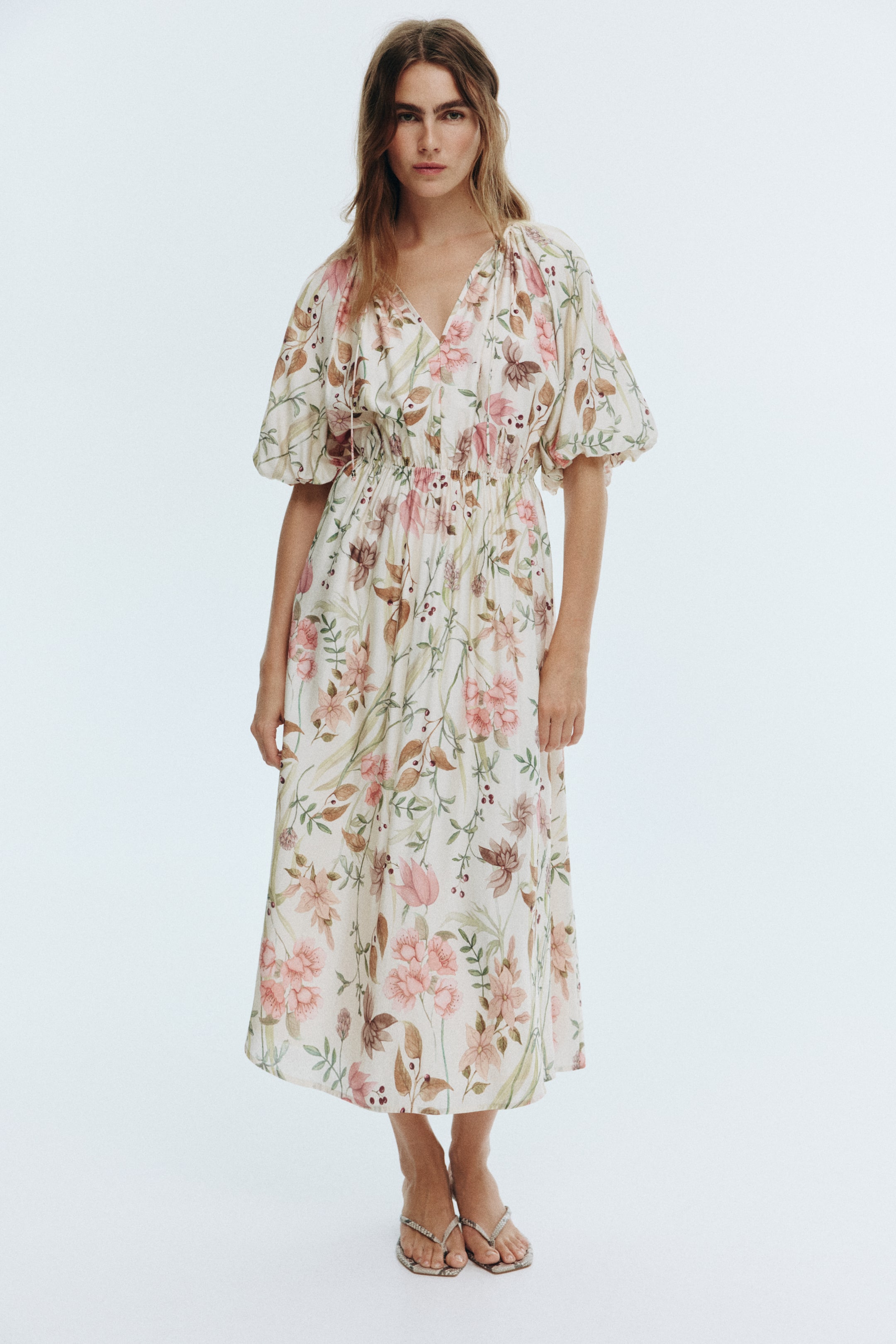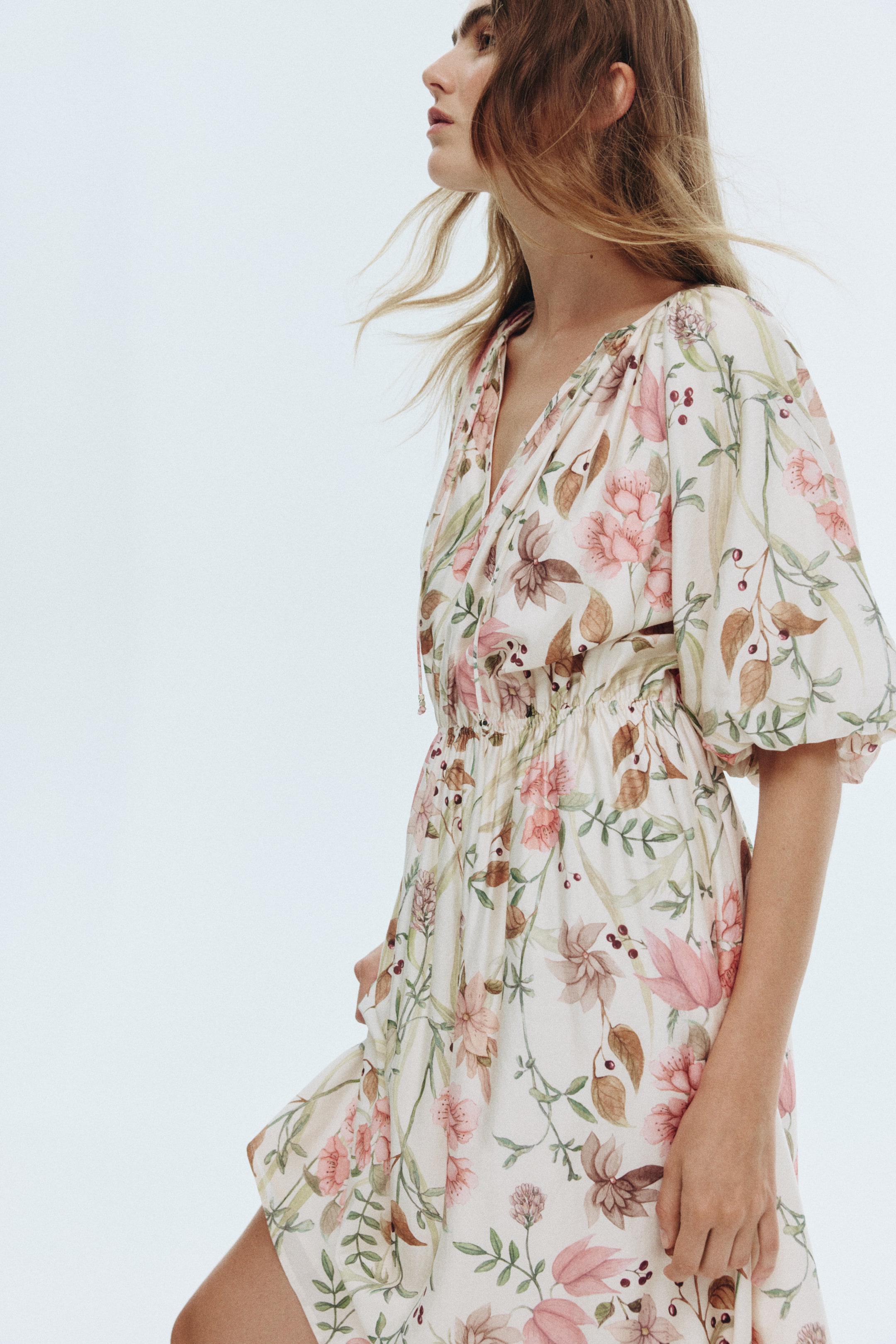 Calf-length dress in woven fabric featuring a round neckline with gathers all around and a V-shaped opening with narrow ties at the front. Narrow elastication at the waist and raglan balloon sleeves that finish just above the elbows. Lined.
