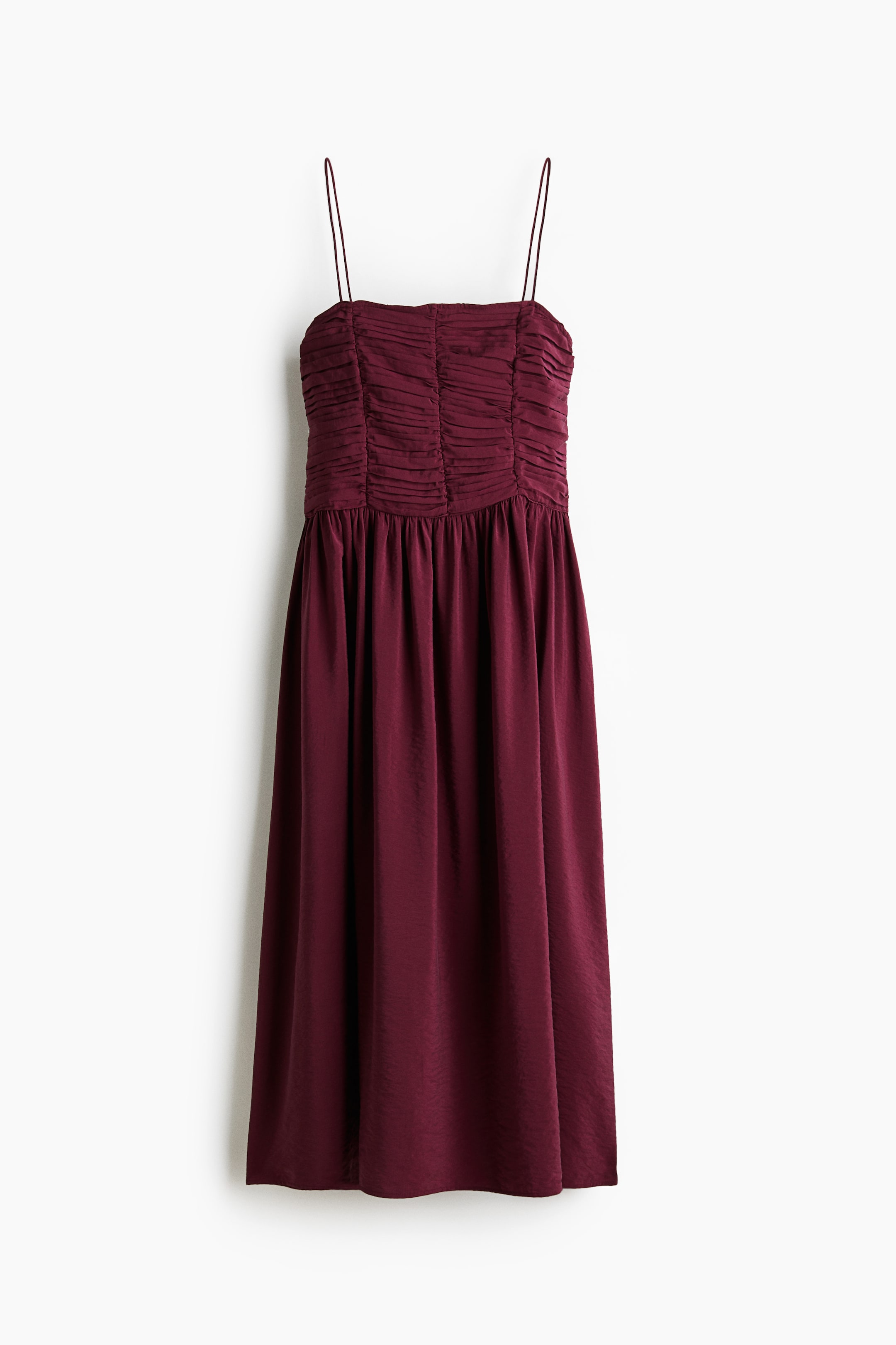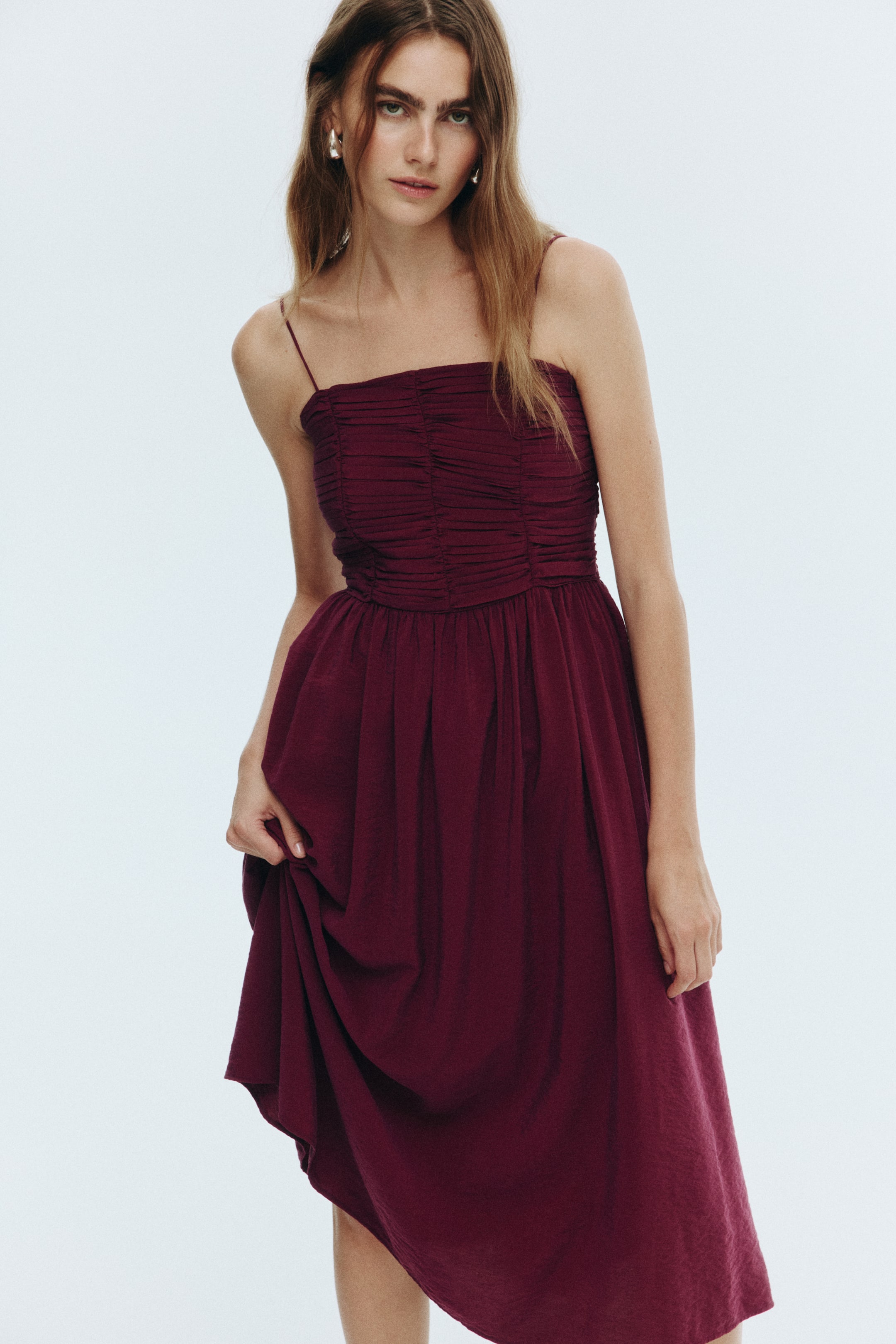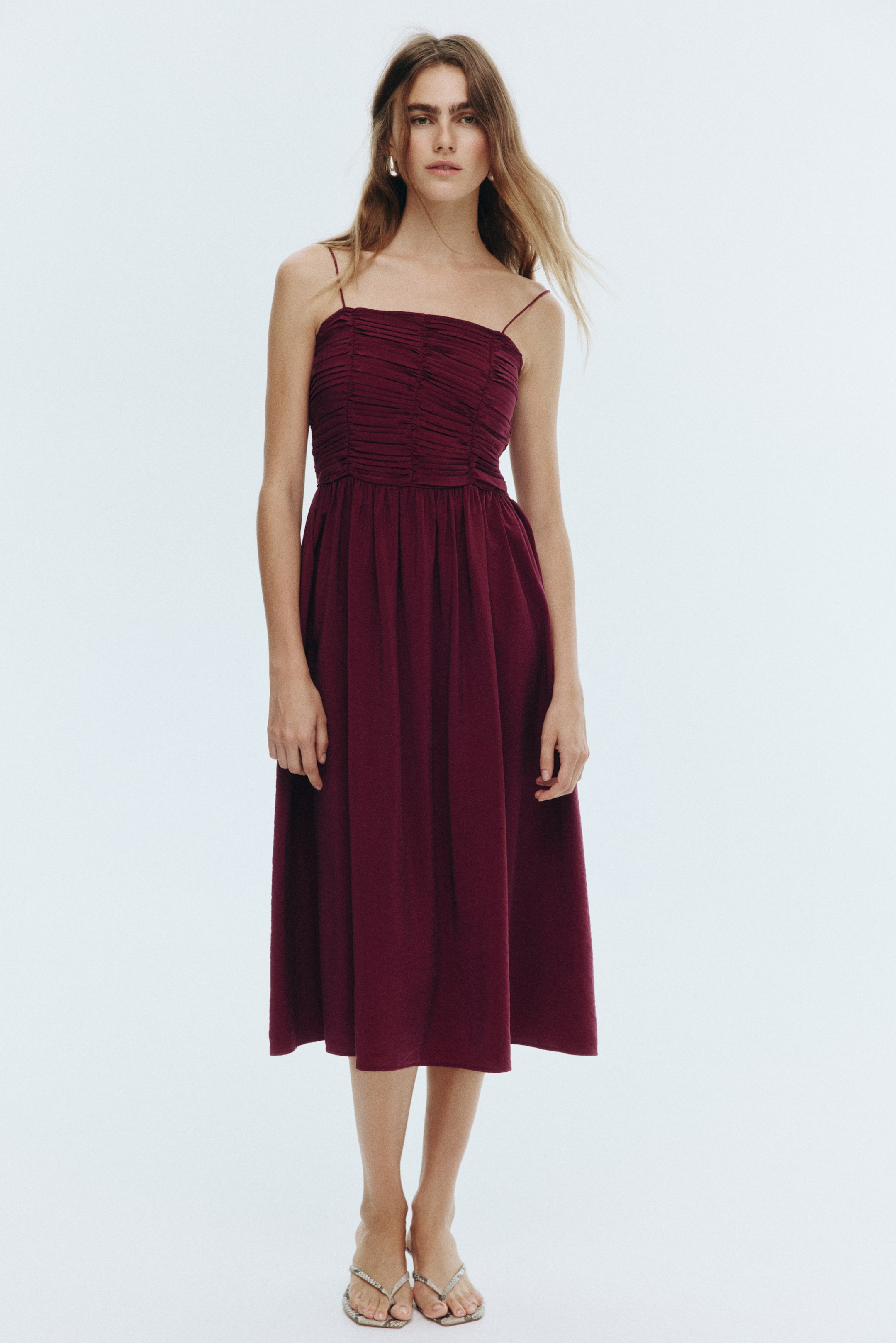 Calf-length dress in woven fabric featuring spaghetti shoulder straps with a fixed bow at the back. Smocked bodice with a straight neckline and a concealed zip and hook-and-eye fastener at one side. Gathered seam at the hips and a flared skirt. Lined bodice.