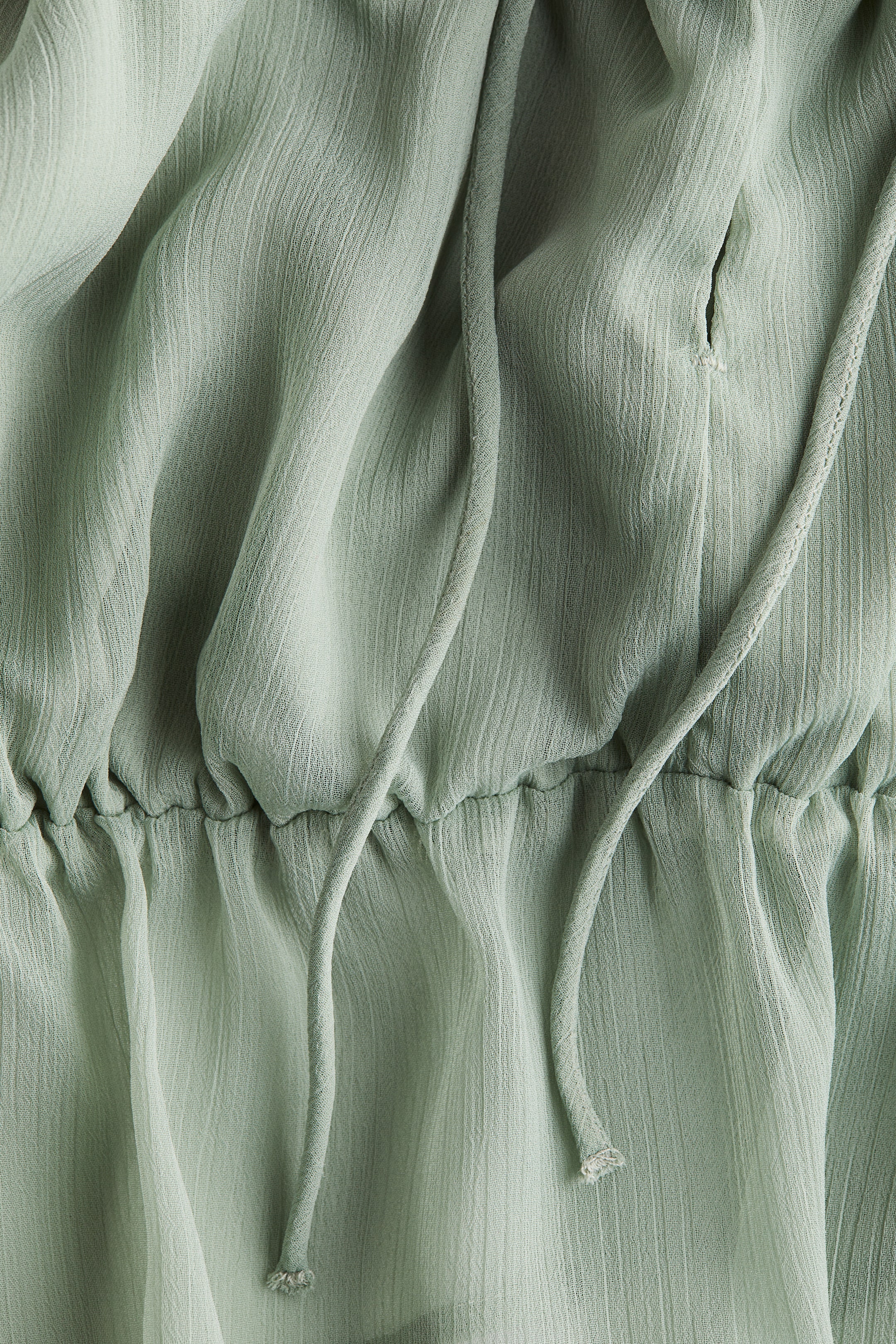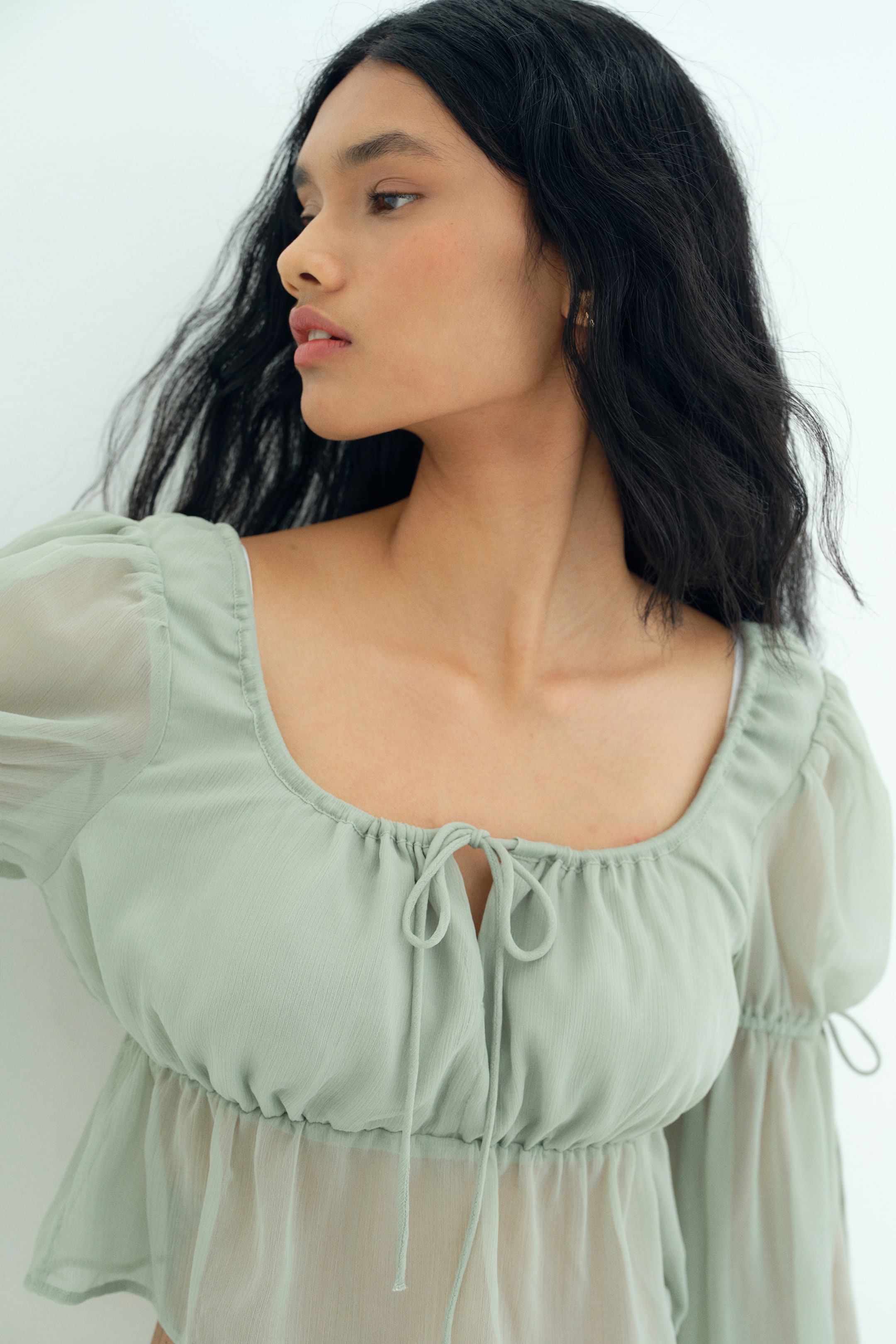Cropped blouse in a sheer, gently crinkled weave featuring a square neckline with covered elastication, a narrow drawstring and a V-shaped opening at the front. Elasticated, gathered seam below the bust and a gently flared hem. Long sleeves with gathers at the top, a gathered seam with an elasticated drawstring above the elbows and flared cuffs. Lined over the bust.