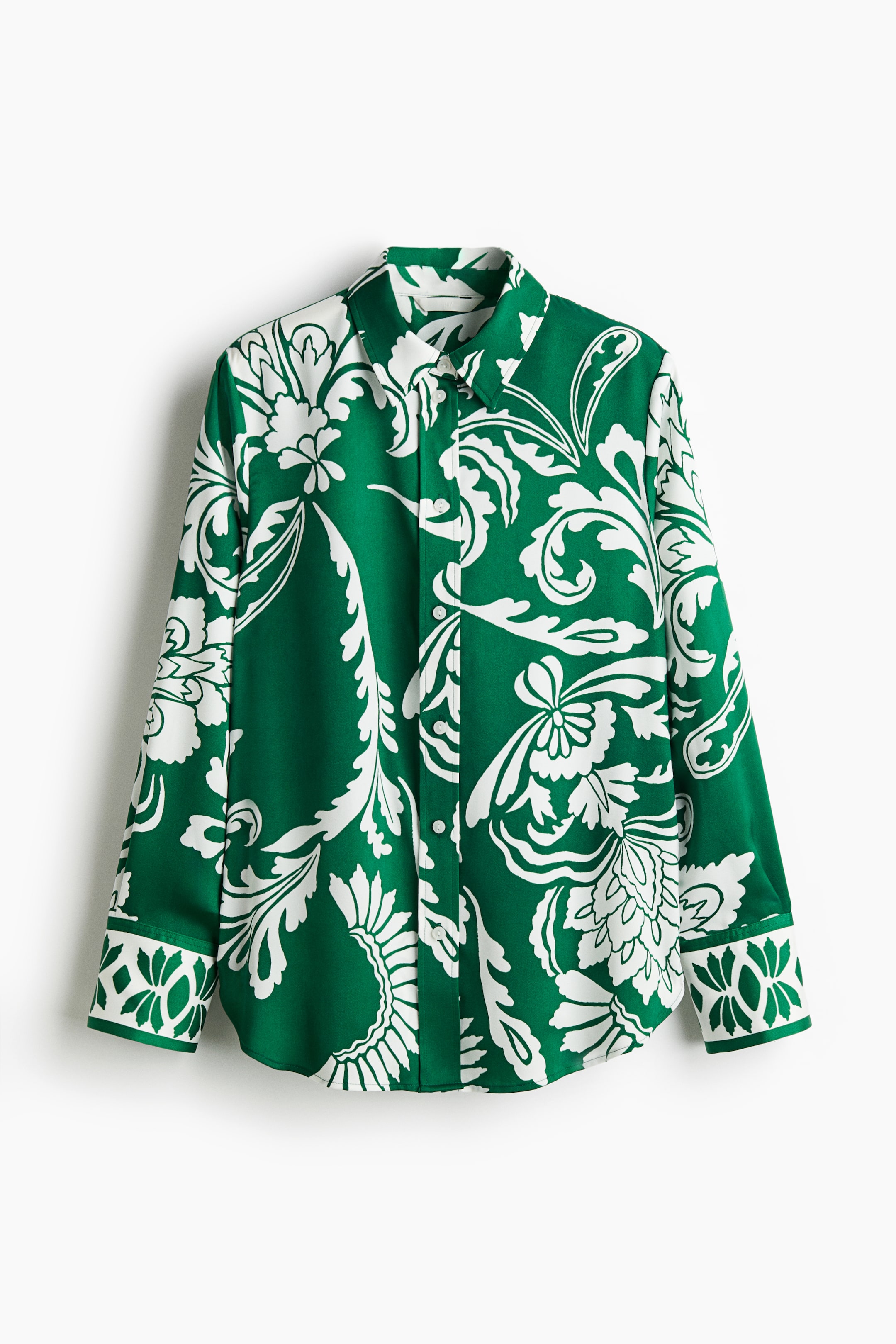 Shirt in woven fabric with a slight sheen and an all-over pattern. Collar, buttons down the front and a yoke with a box pleat at the back. Long sleeves with buttoned cuffs and a sleeve placket with a link button. Rounded hem.