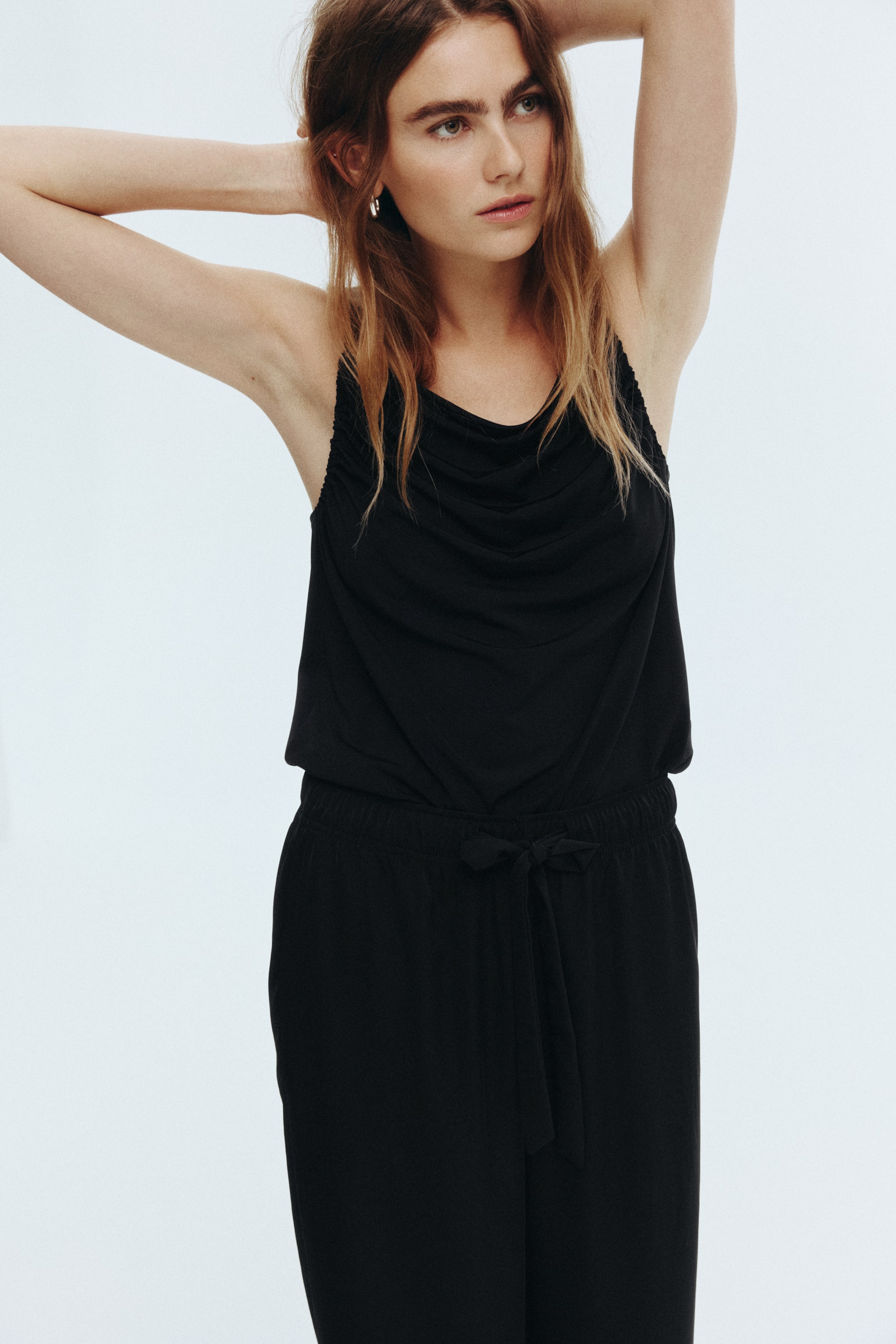 Loose-fit trousers in twill featuring a high waist with covered elastication and a wide drawstring. Discreet side pockets and wide legs.