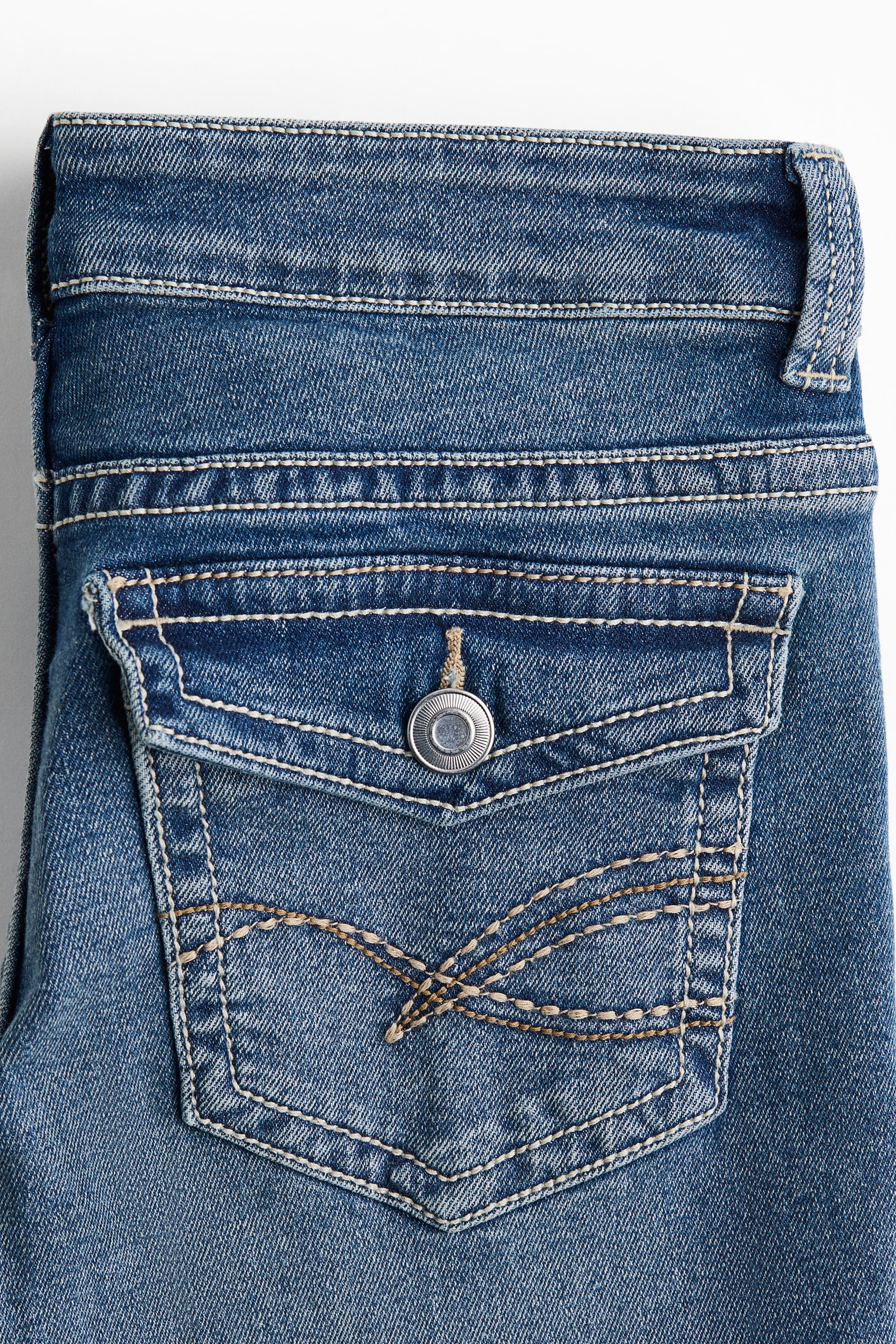 Jeans in denim with a slight stretch for good comfort. Flared leg with a slim fit from the waist to the thigh and a flared cut from the knee to the hem. Low waist with a zip fly and button, open front pockets and flap back pockets with a button. Longer length, designed to fall over the foot with a stacking effect. Style yours with everything from trainers to ankle boots.