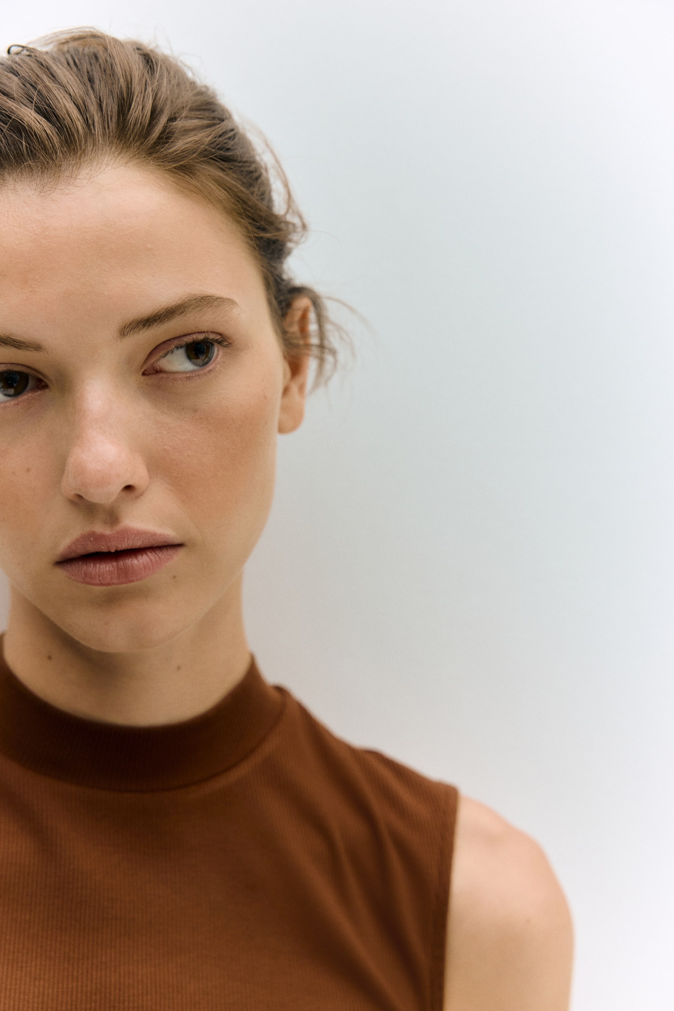 Fitted vest top in ribbed stretch jersey with a small stand collar.