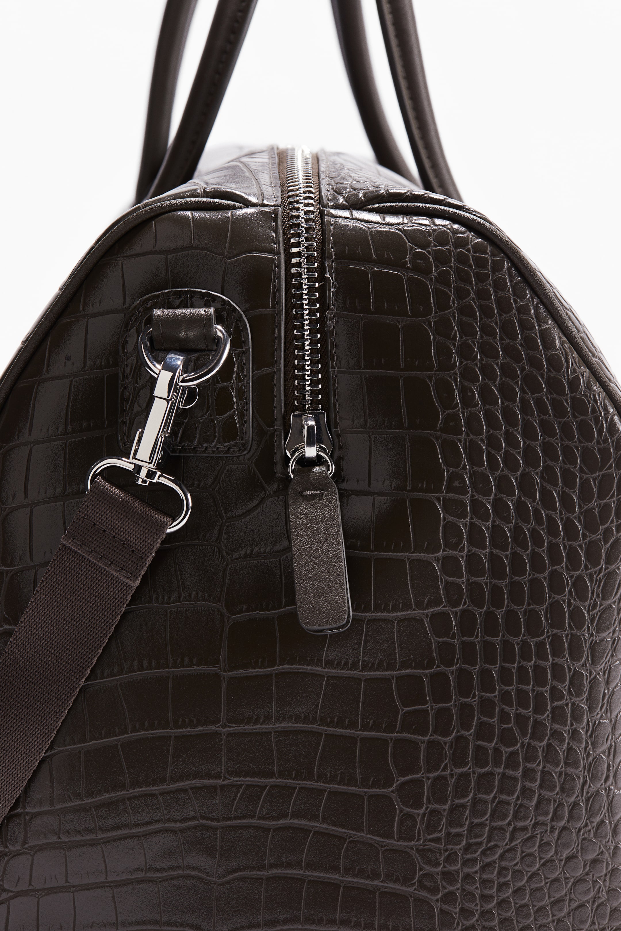 Weekend bag in coated fabric with two handles, a zip at the top and a detachable, adjustable shoulder strap. One zipped and one open inner compartment. Metal studs underneath. Lined.