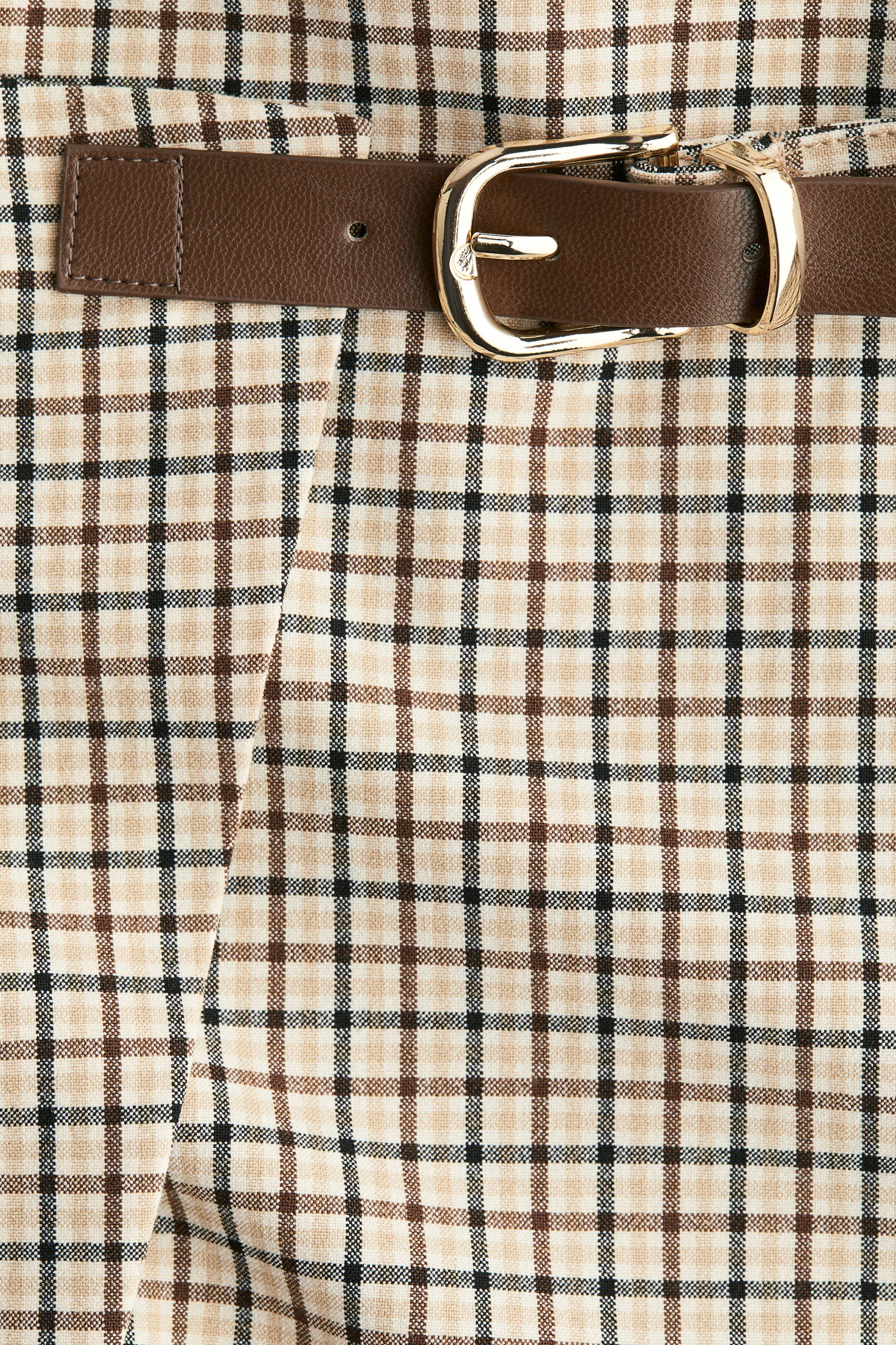 Short skort in woven fabric with a wrapover front featuring a coated belt detail with a metal buckle. Concealed zip and hook-and-eye fastener at one side. Lined.