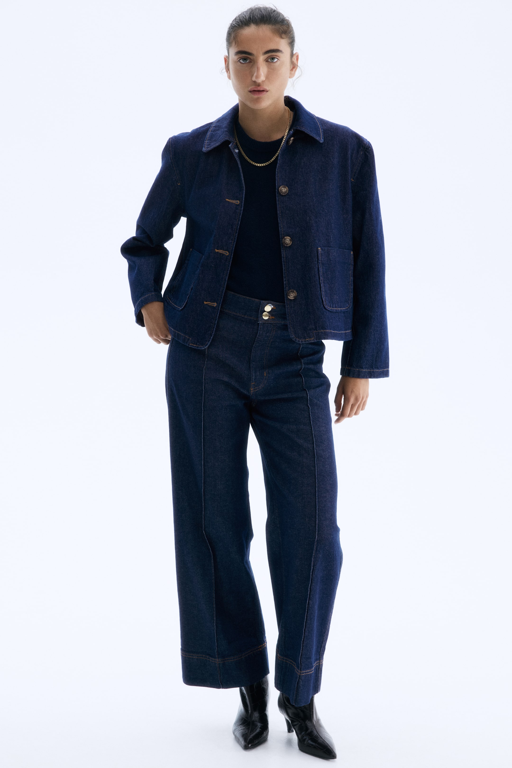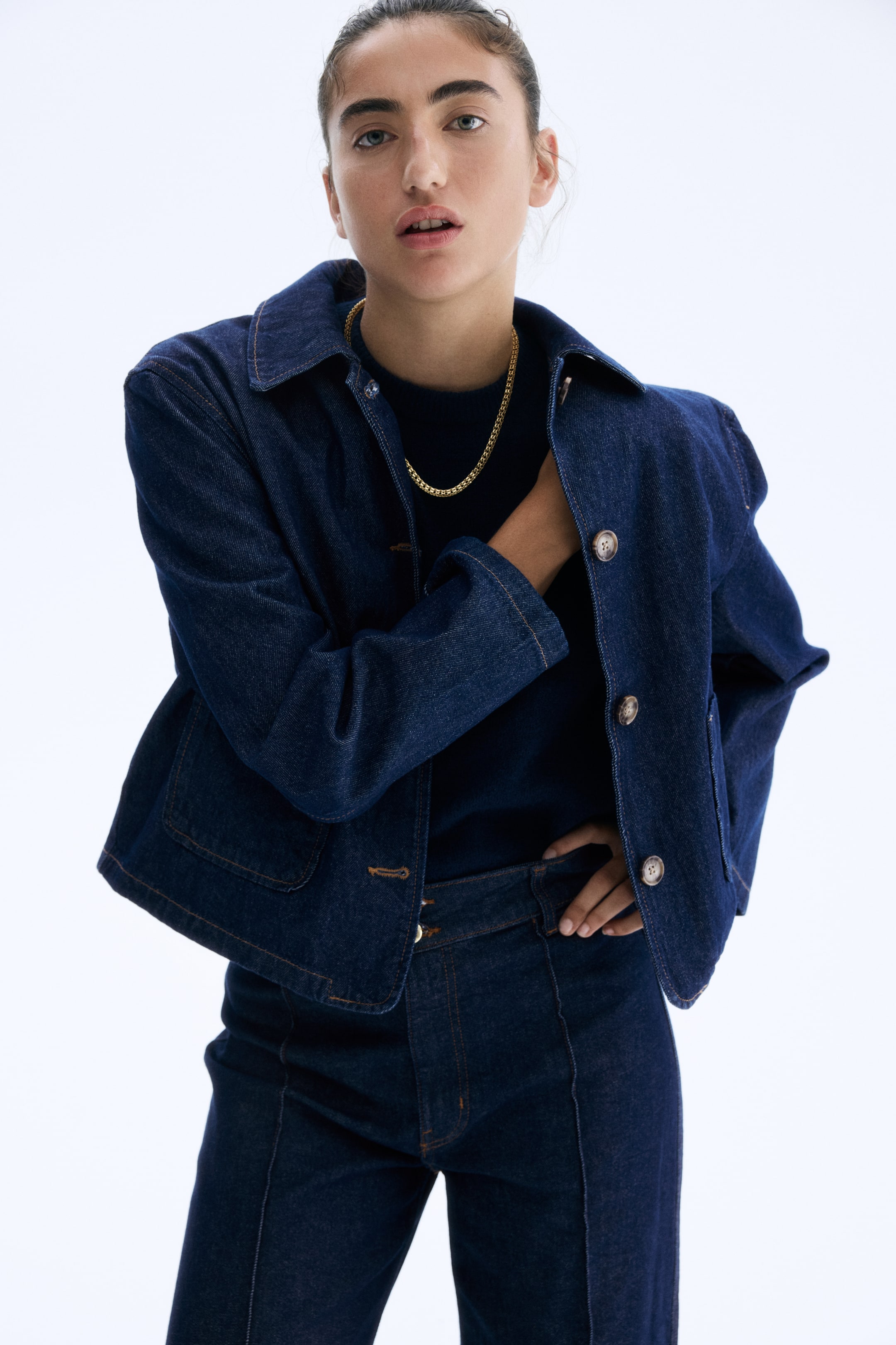 Jacket in rigid cotton twill with a collar, buttons down the front and patch front pockets.