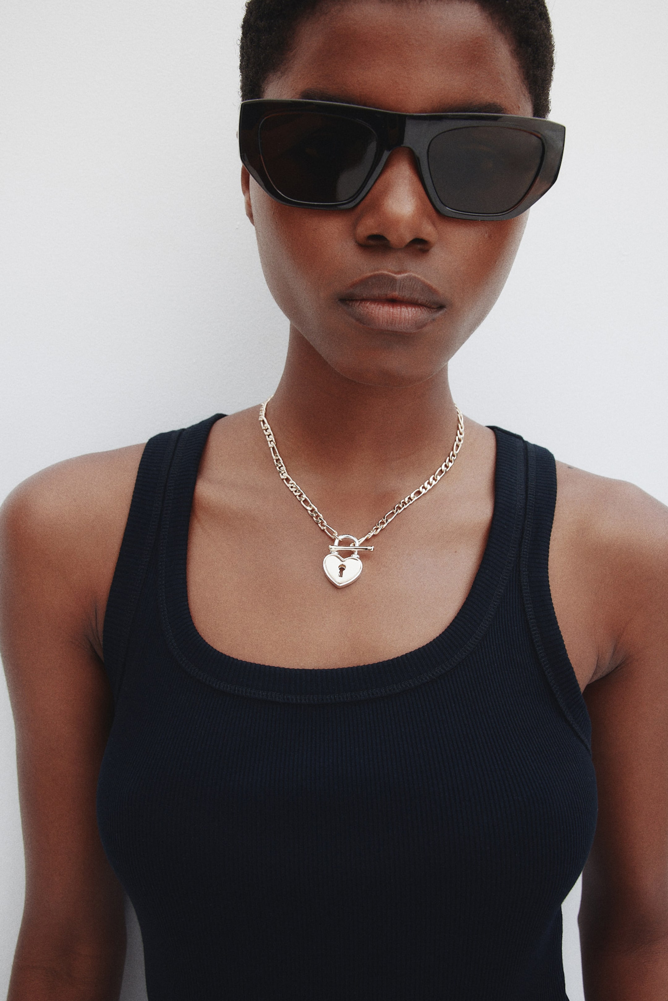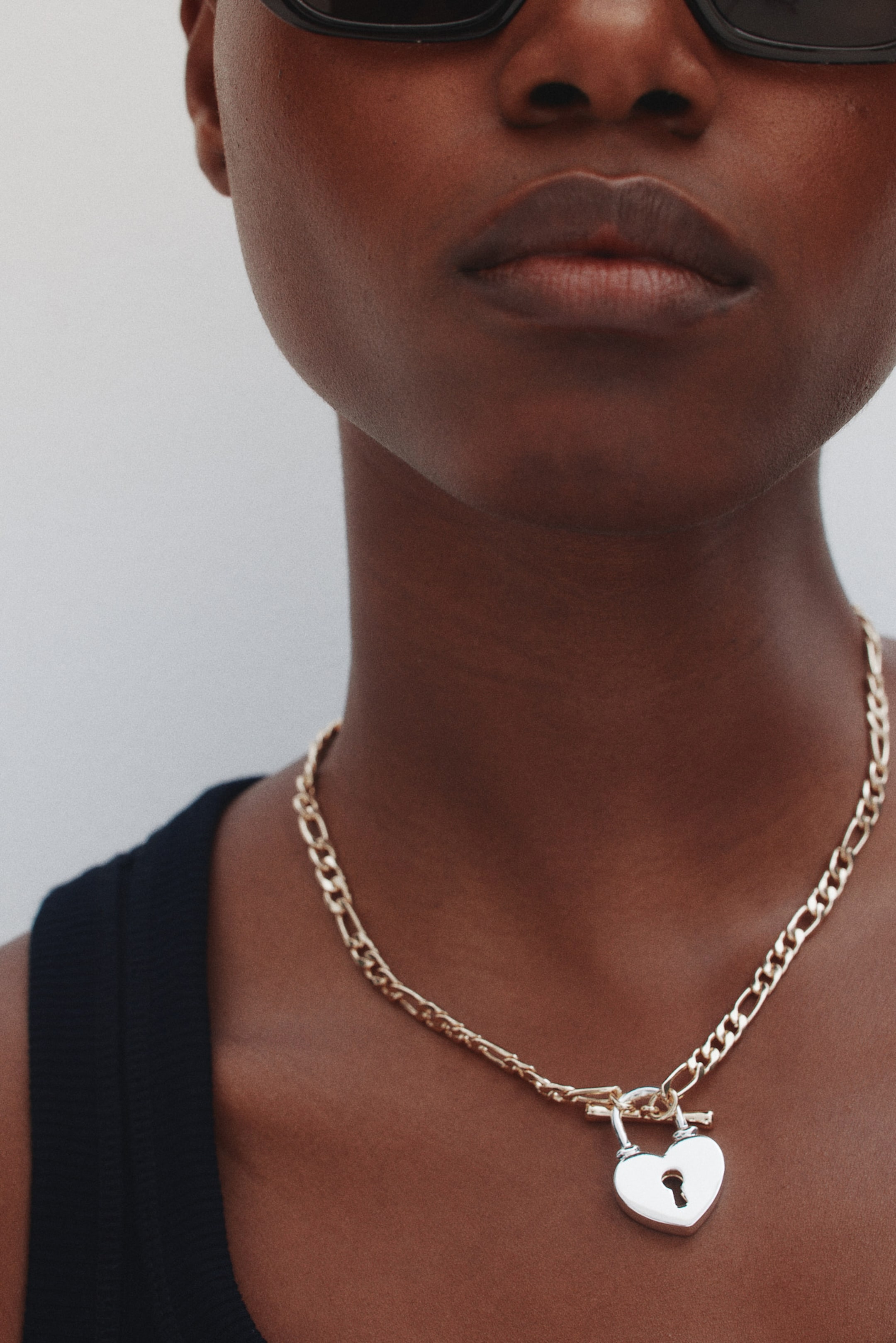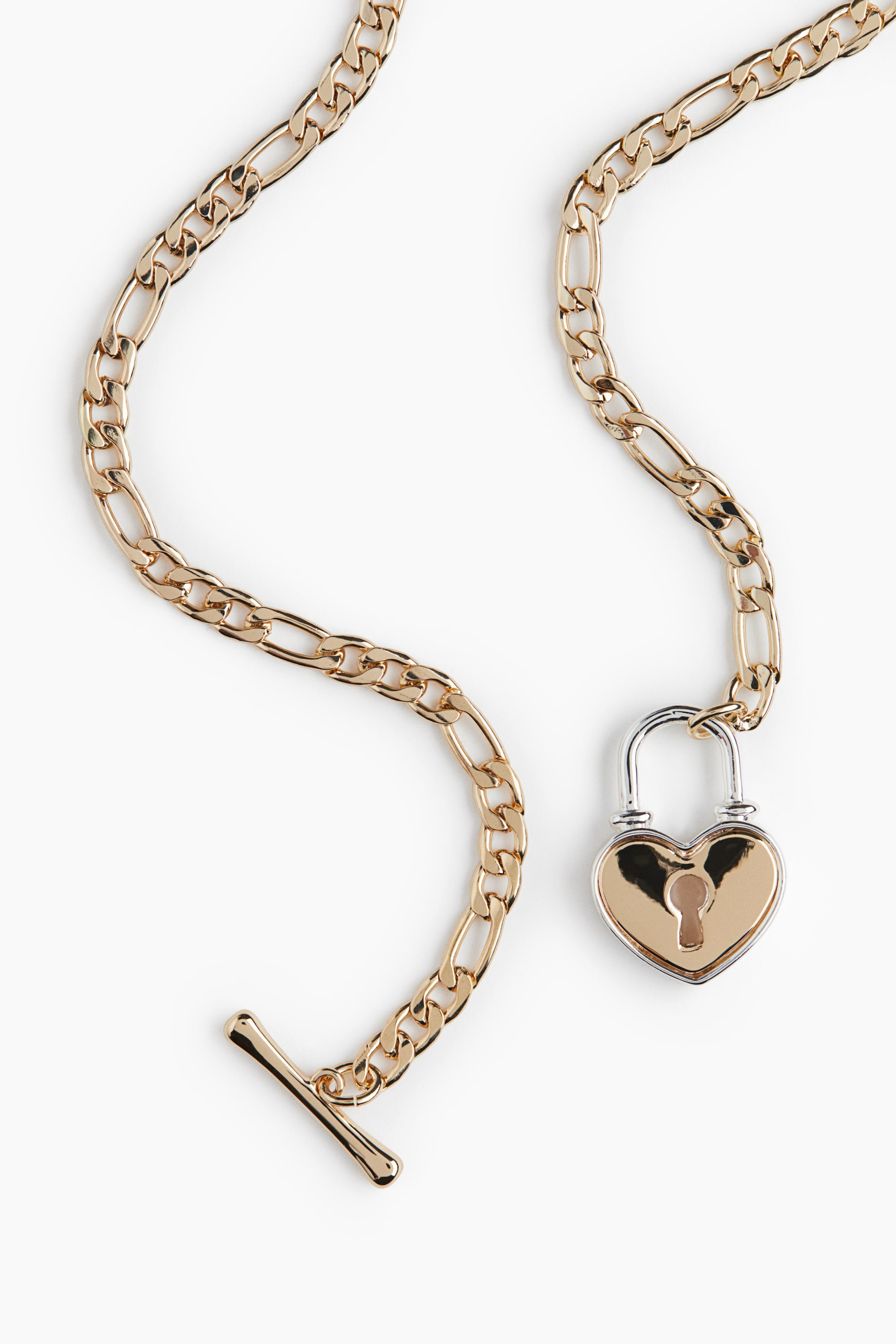 Metal necklace fashioned from a Figaro chain with a heart-shaped padlock pendant and a toggle clasp at the front.