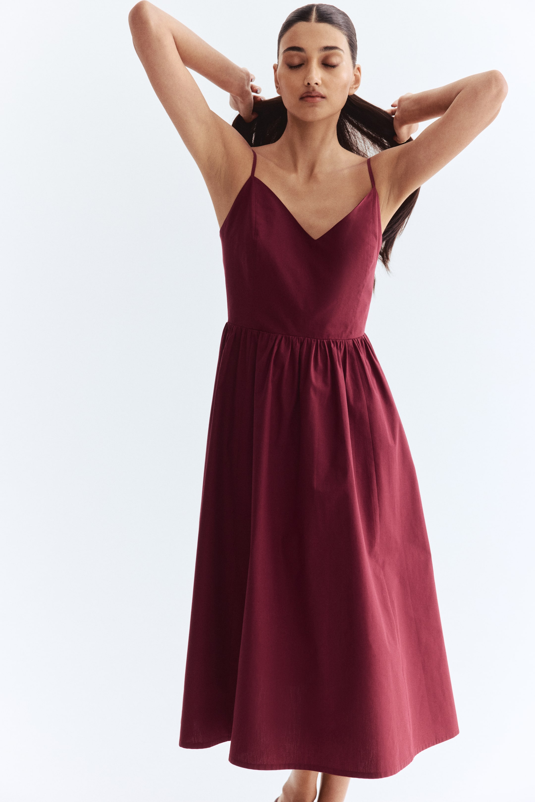 Calf-length dress in crisp cotton poplin featuring adjustable spaghetti shoulder straps and a fitted bodice with a V-neckline and a smocked section at the back. Narrow elastication at the back of the waist and a flared skirt. Lined at the top.