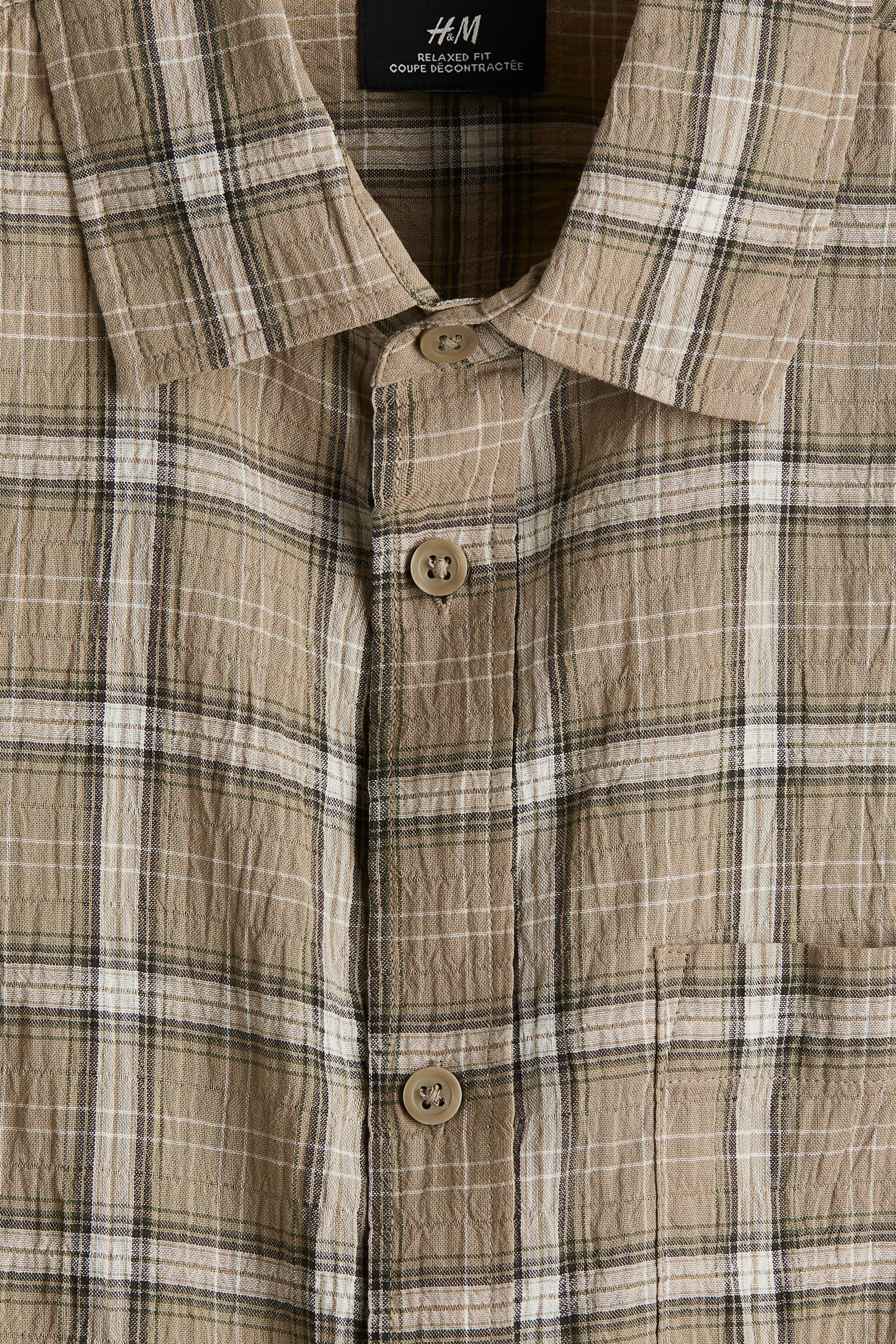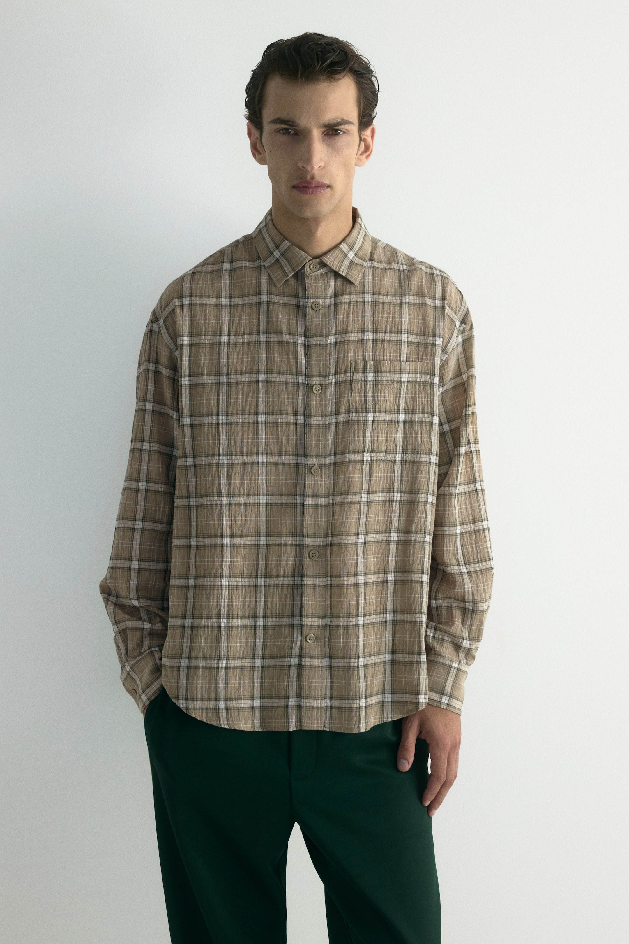 Shirt in soft crinkled cotton featuring a turn-down collar, classic front, yoke at the back, and an open chest pocket. Long sleeves with adjustable buttoning at the cuffs and a sleeve placket with a link button. Gently rounded hem. Loose fit for a generous but not oversized silhouette.