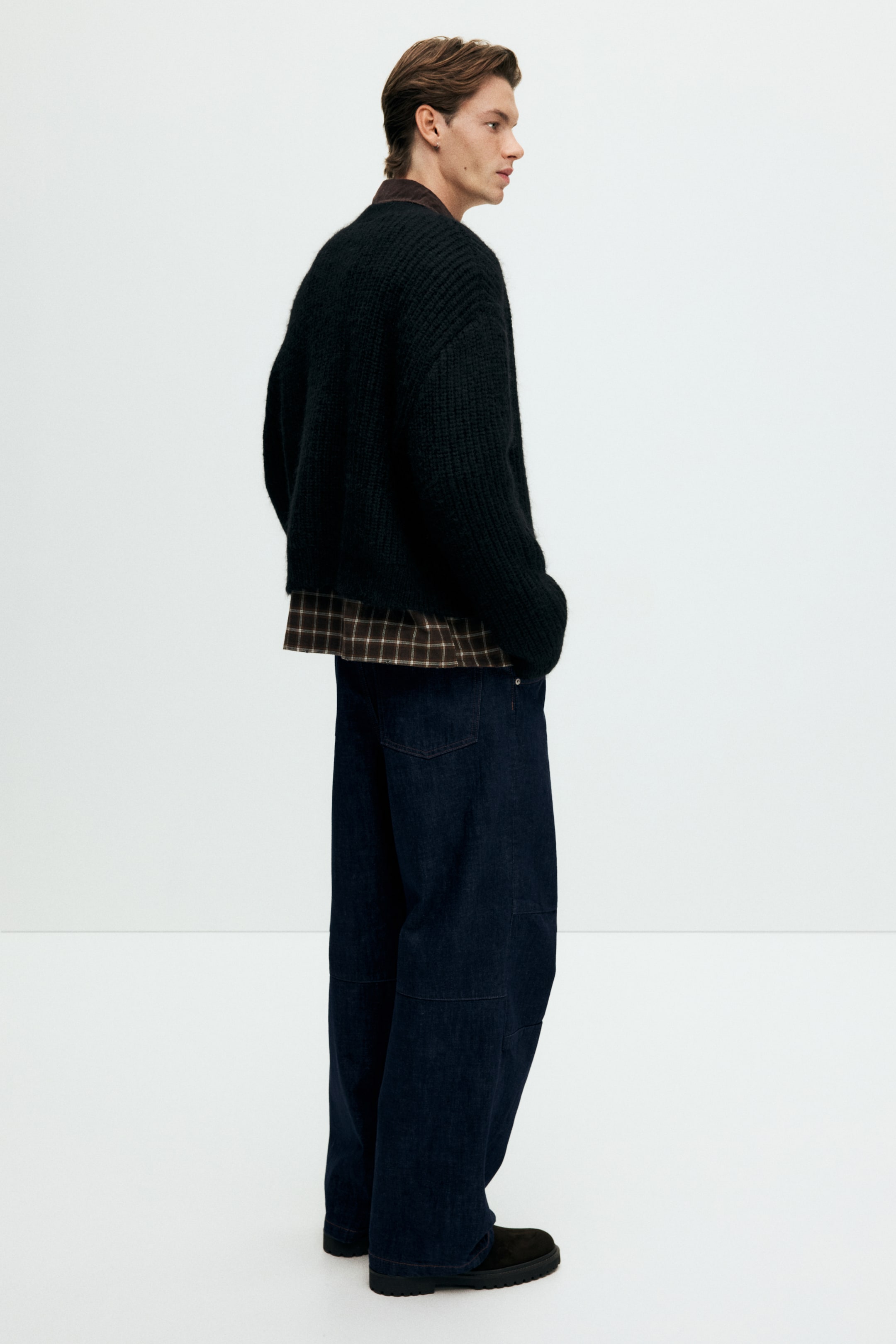 Baggy 5-pocket jeans in rigid cotton denim. Rounded leg and a baggy fit from the seat to the hem with plenty of room around the whole leg and darts at the knee for added volume. Dropped crotch and stacked at the ankle. Regular waist and a zip fly.
