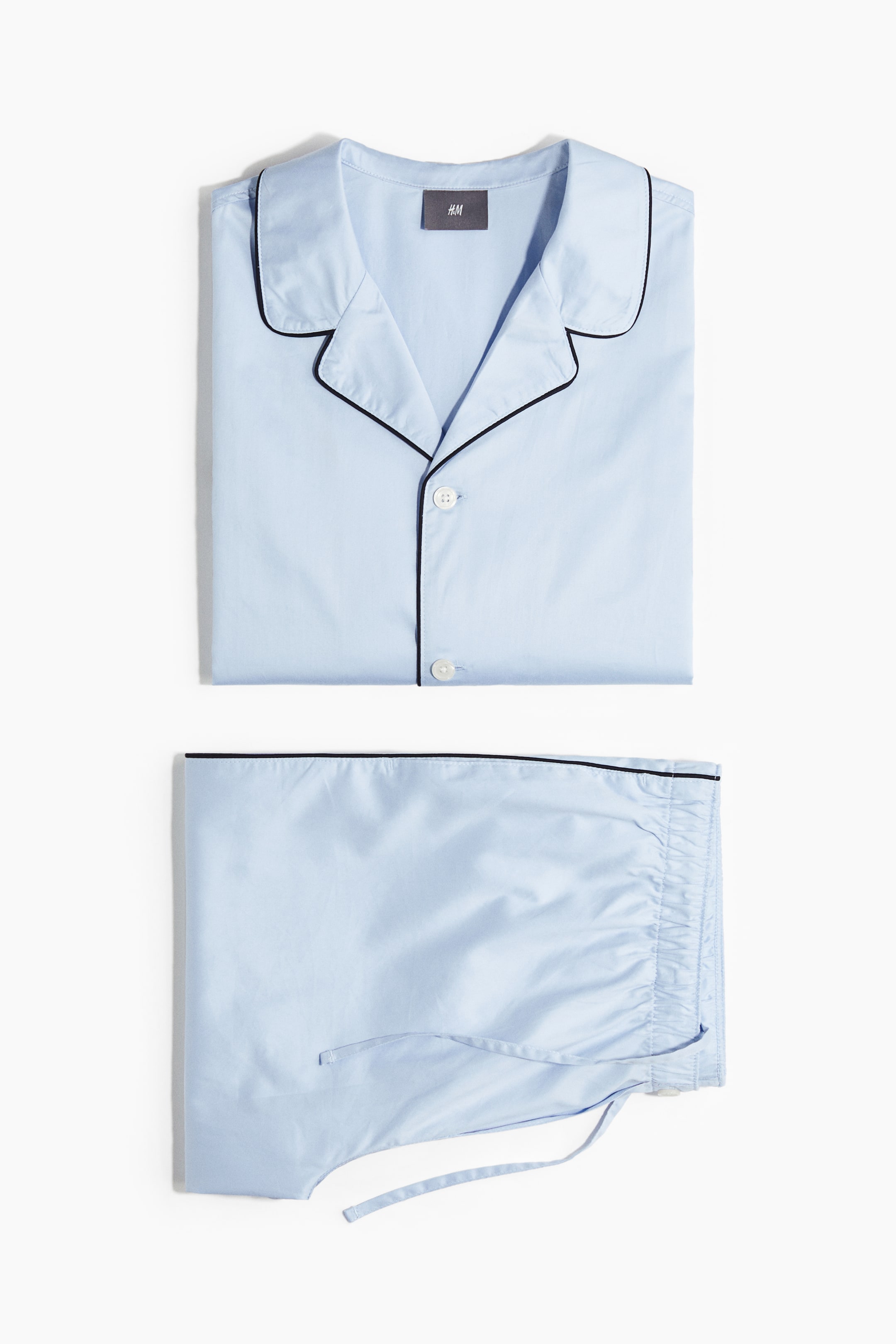Pyjamas with a shirt and bottoms in a soft cotton satin with accent-colour piping. Long-sleeved shirt with a resort collar, buttons down the front and patch front pockets. Straight-cut hem. Bottoms with an elasticated waist and internal drawstring, a fake fly and discreet side pockets.