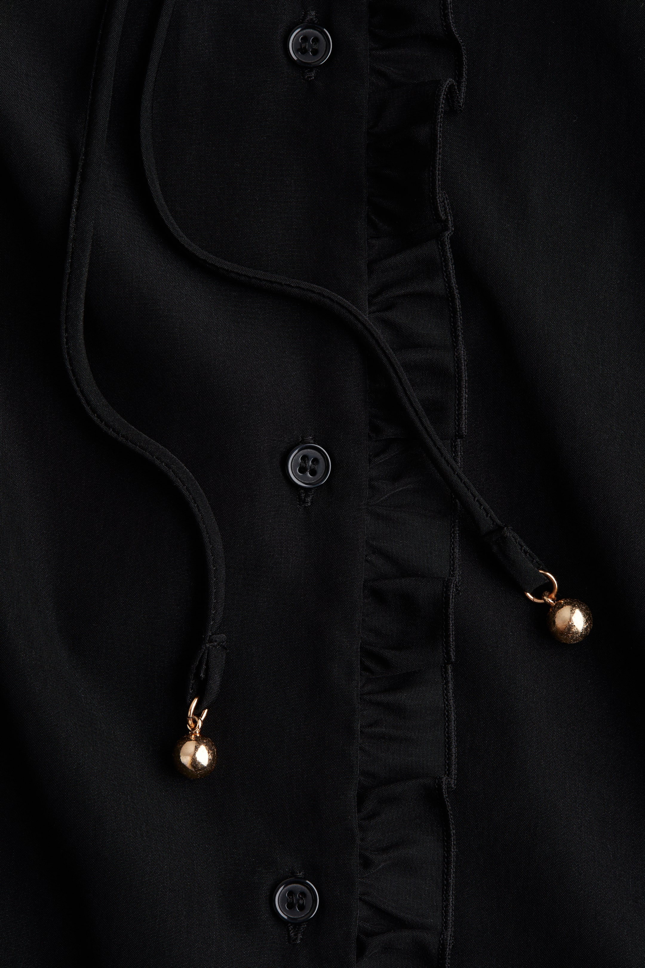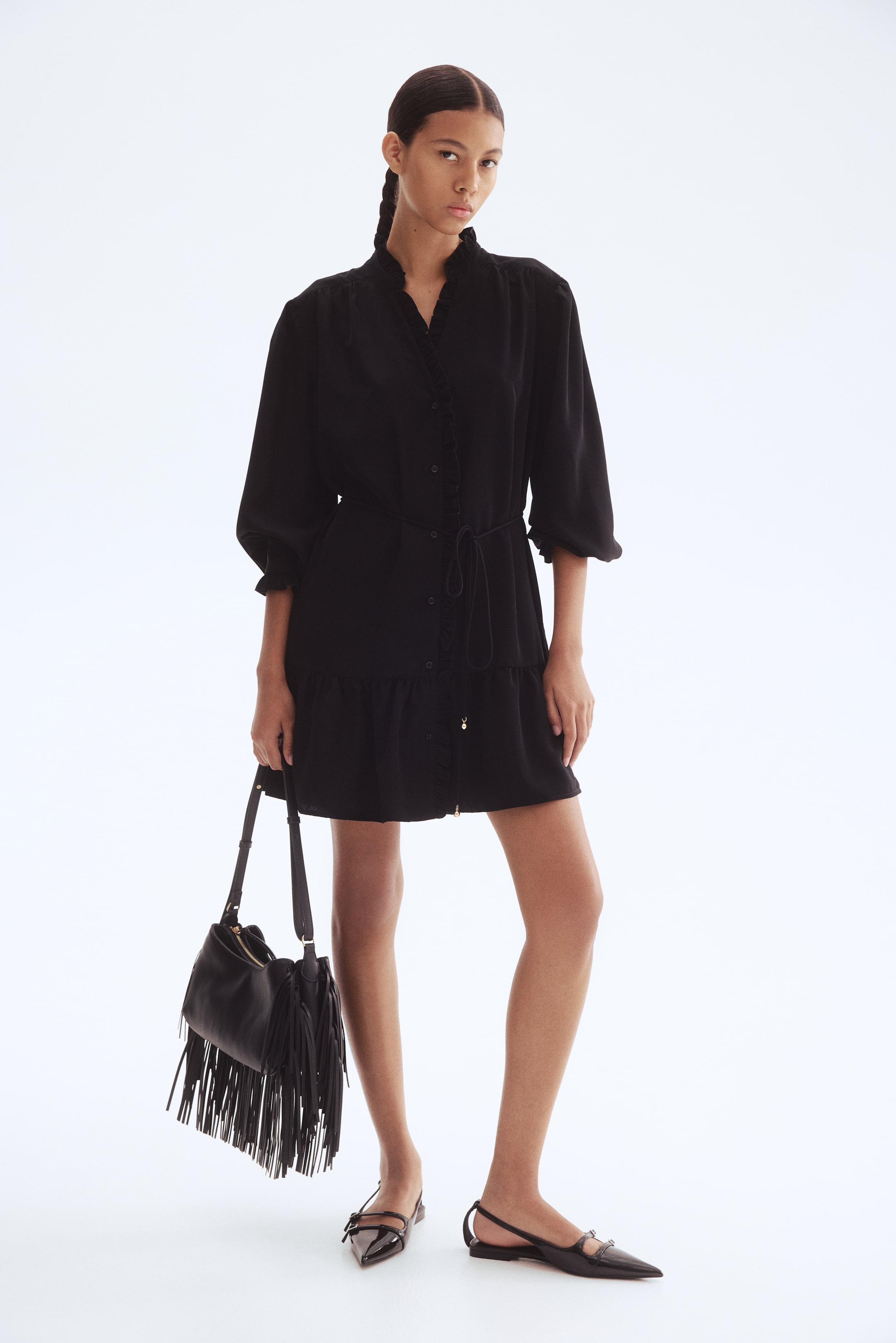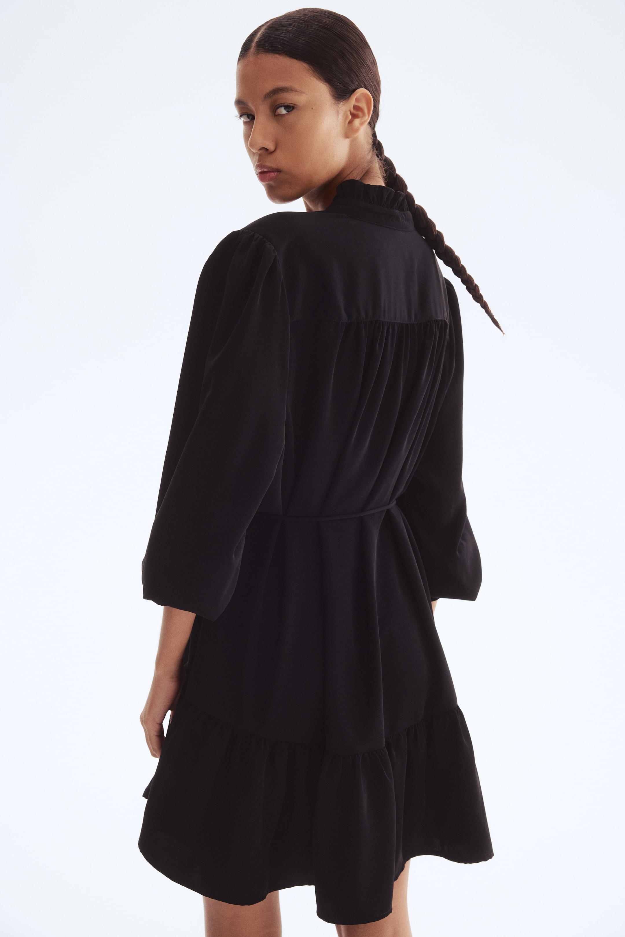 Short, loose-fit dress in woven fabric with a frilled collar and frill-trimmed button placket down the front. Yoke with gathers on the shoulders and at the back and long sleeves with frill-trimmed, buttoned cuffs. Detachable spaghetti tie belt at the waist and a flared skirt with a gathered tier. Unlined.