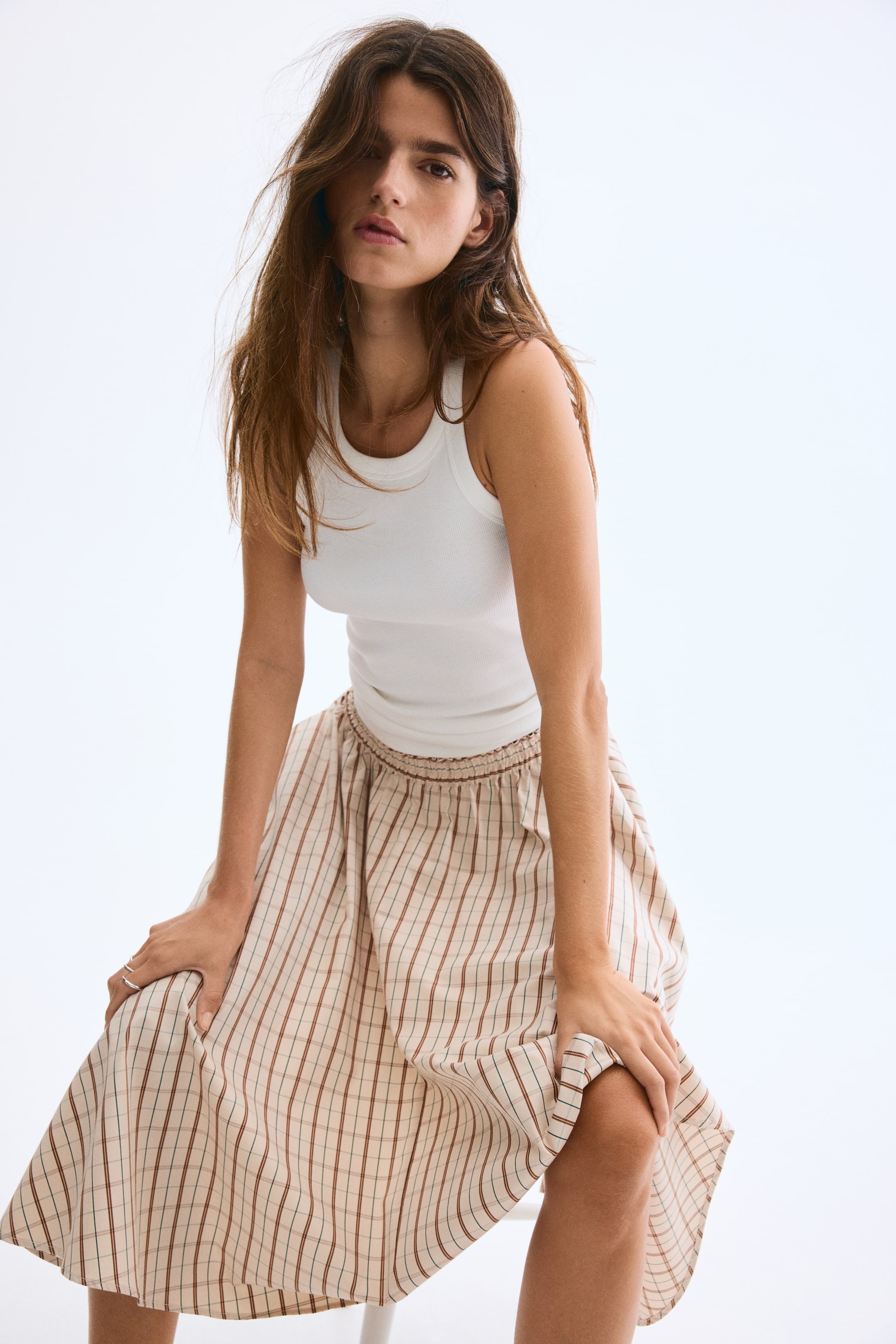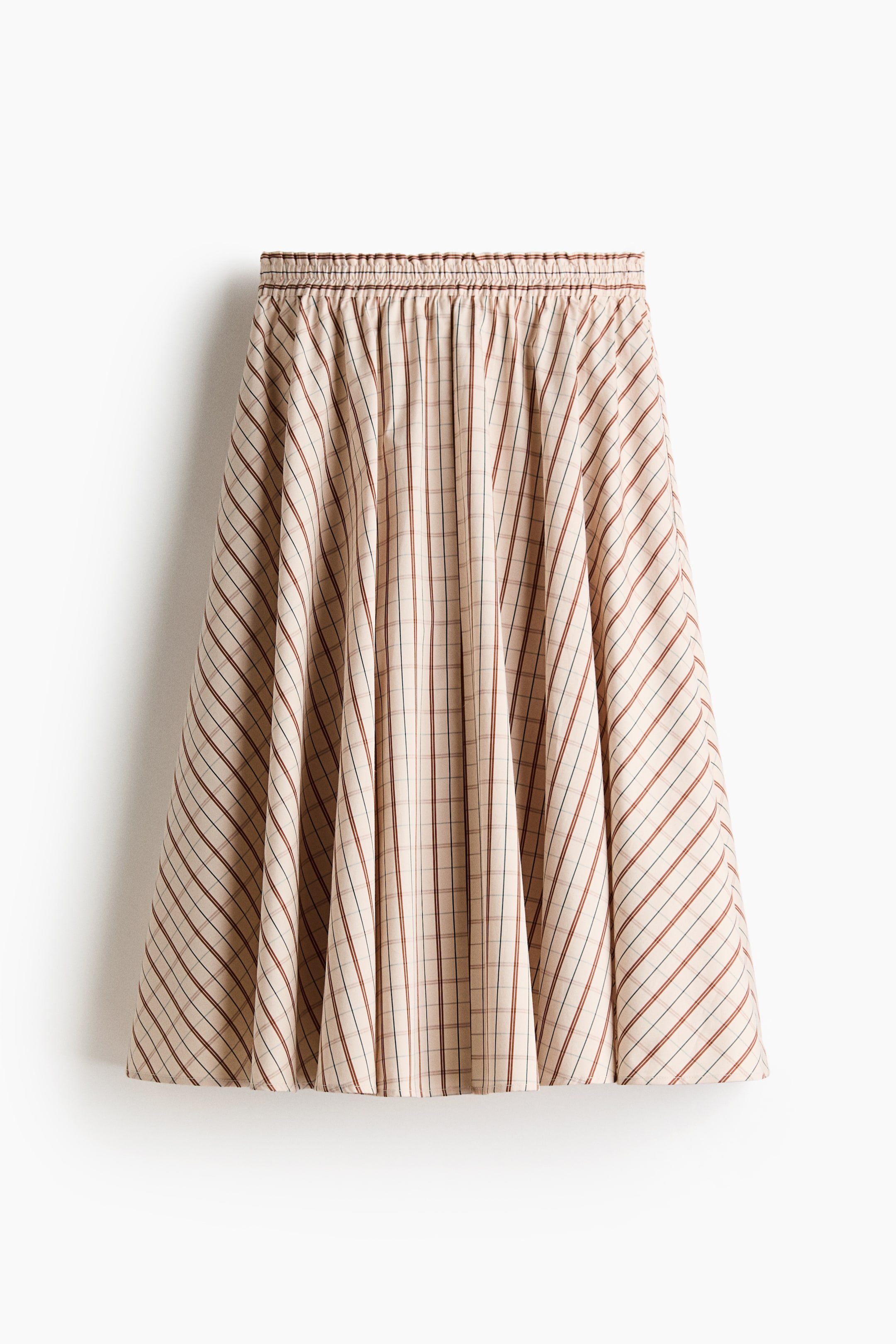 Calf-length, circular skirt in a cotton dobby weave with smocked elastication at the waist and discreet side pockets. Unlined.
