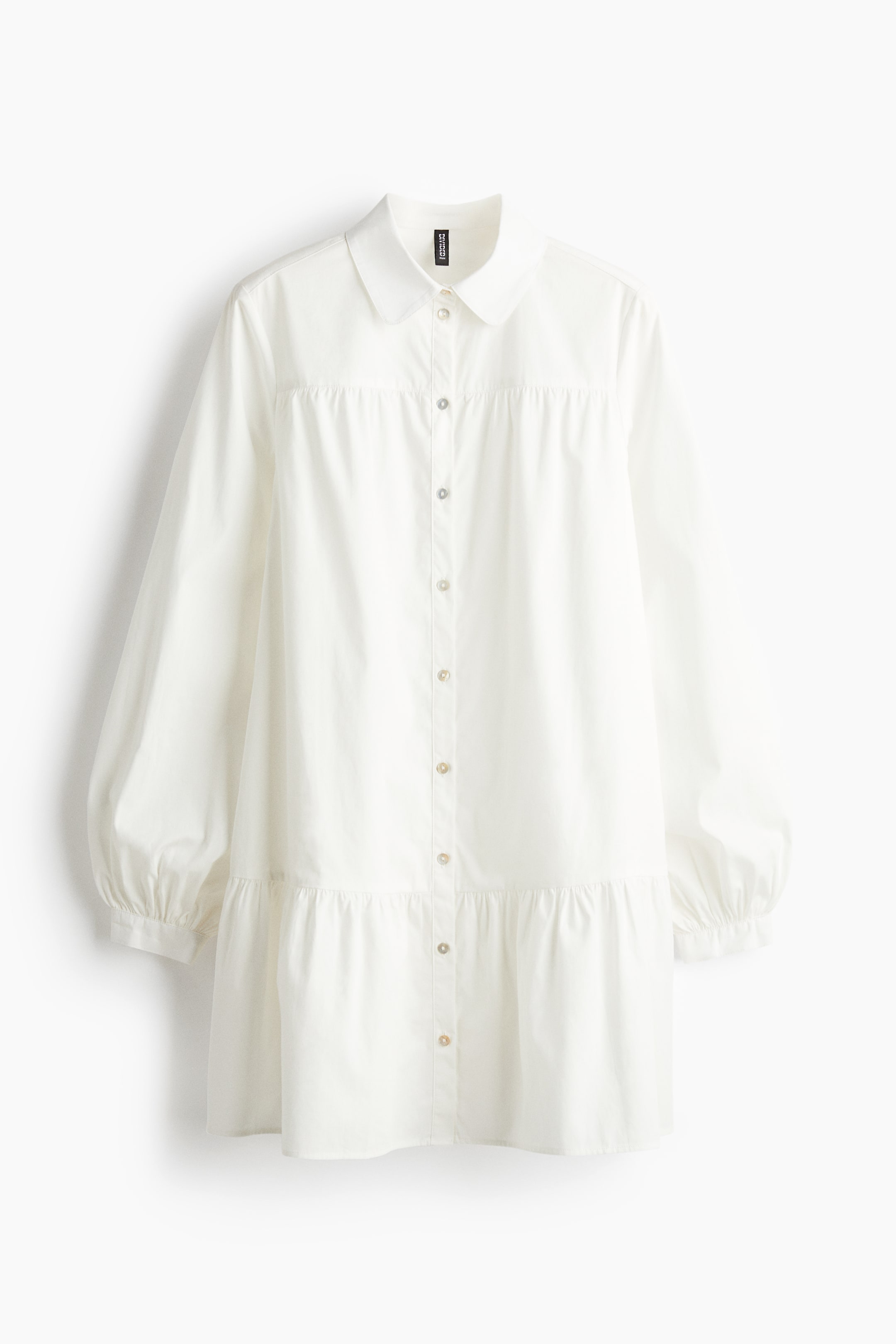 Short, loose-fit dress in crisp cotton poplin with a collar and buttons down the front. Yoke with gathers at the front and back and long balloon sleeves with buttoned cuffs. Gathered tier around the hips for added volume. Unlined.