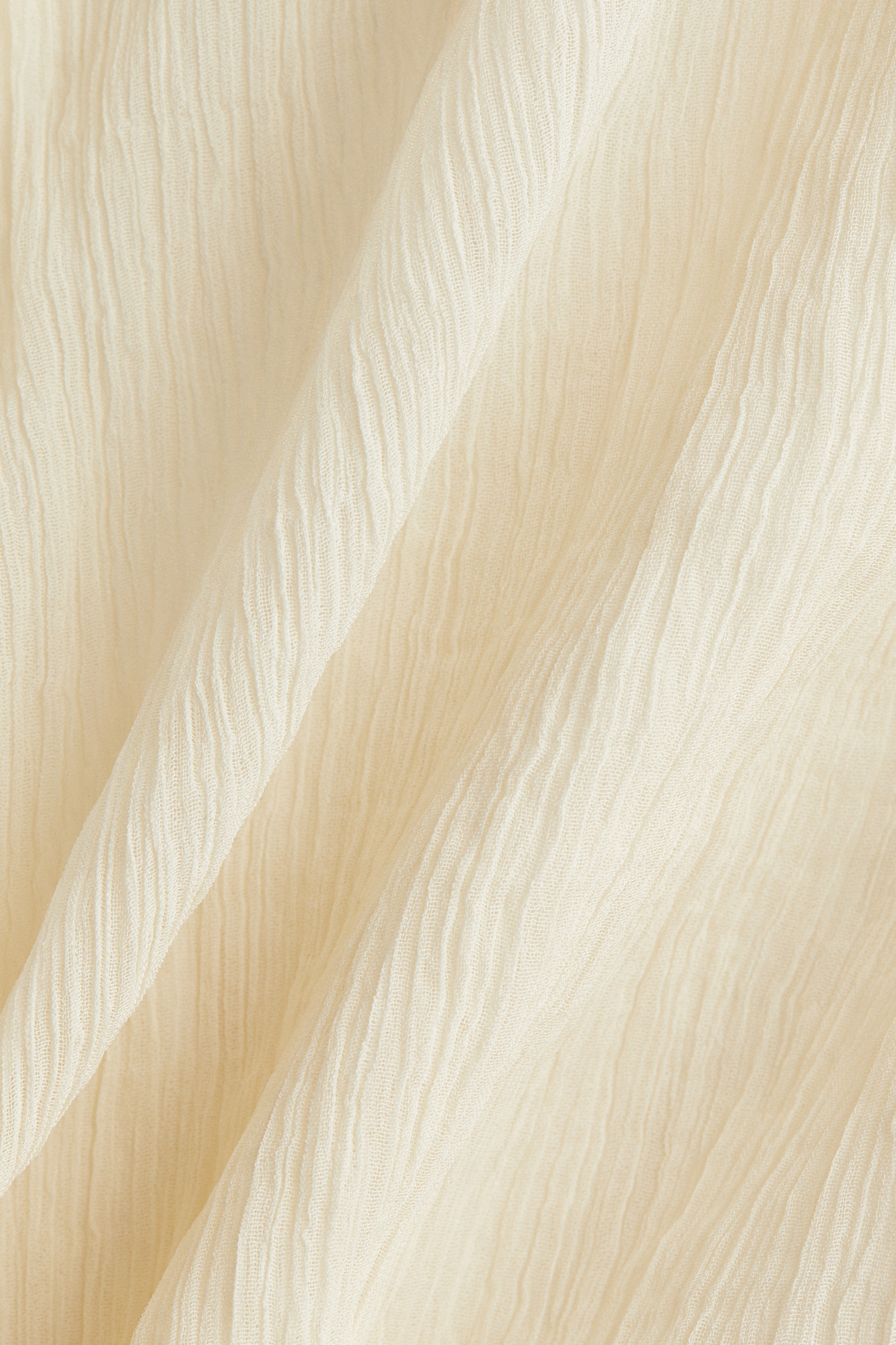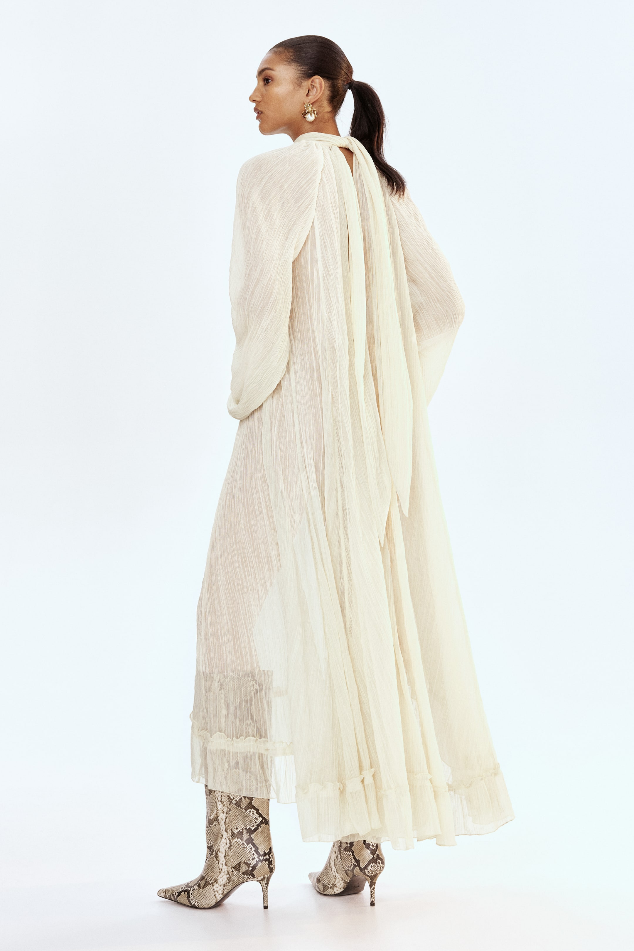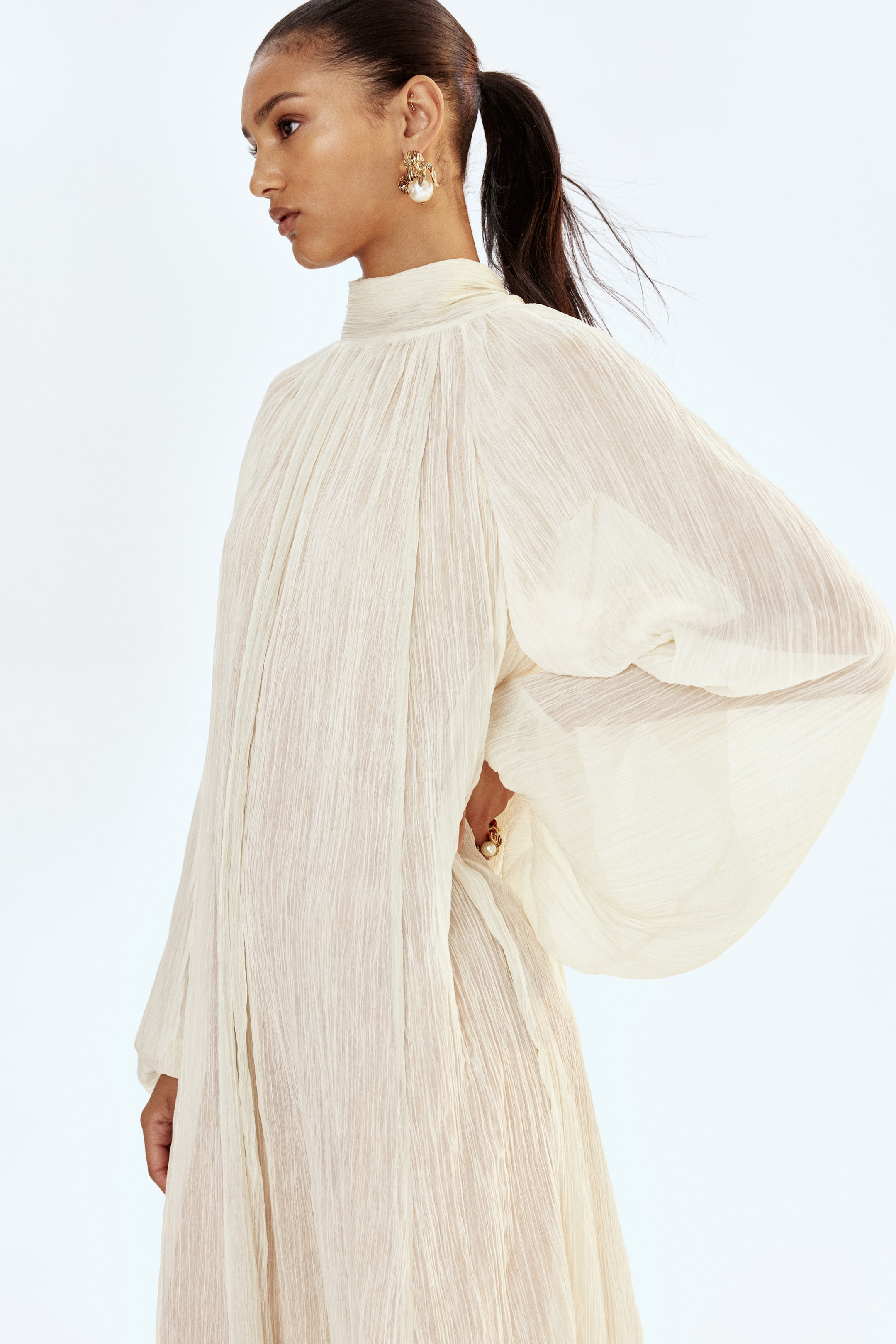 Oversized maxi dress in a crinkled weave with a draped stand collar flowing into long ties at the back. Long, raglan balloon sleeves with binding at the cuffs and an overall voluminous silhouette with a frilled hem. Unlined.