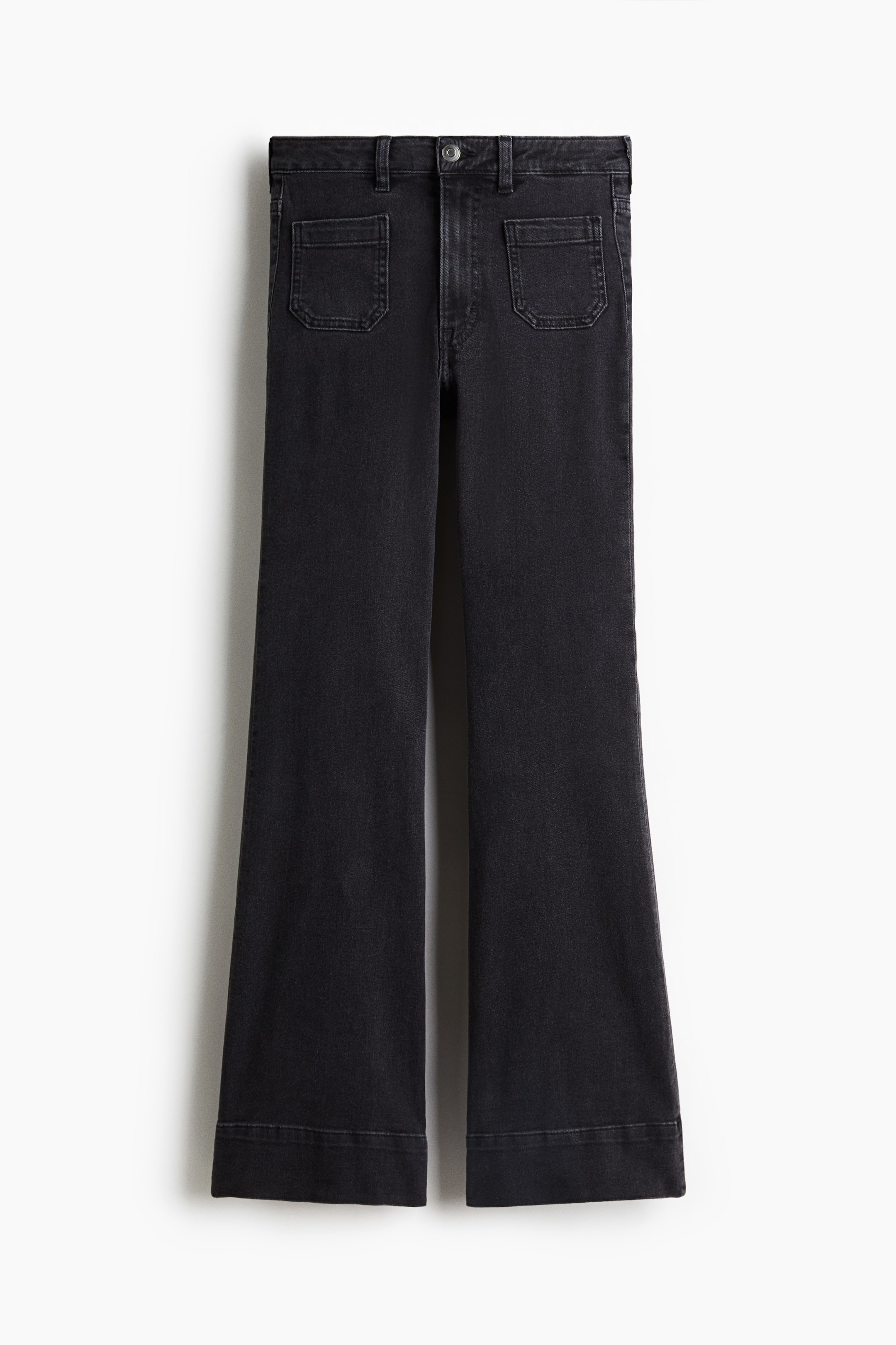 Jeans in denim with a slight stretch for good comfort. Bootcut leg with a slim fit from the waist to the thigh, kicking out from the knee to the hem. High waist with a zip fly and button, and patch front pockets. Longer length, designed to fall over the foot with a stacking effect. Flared, flattering, fabulous.