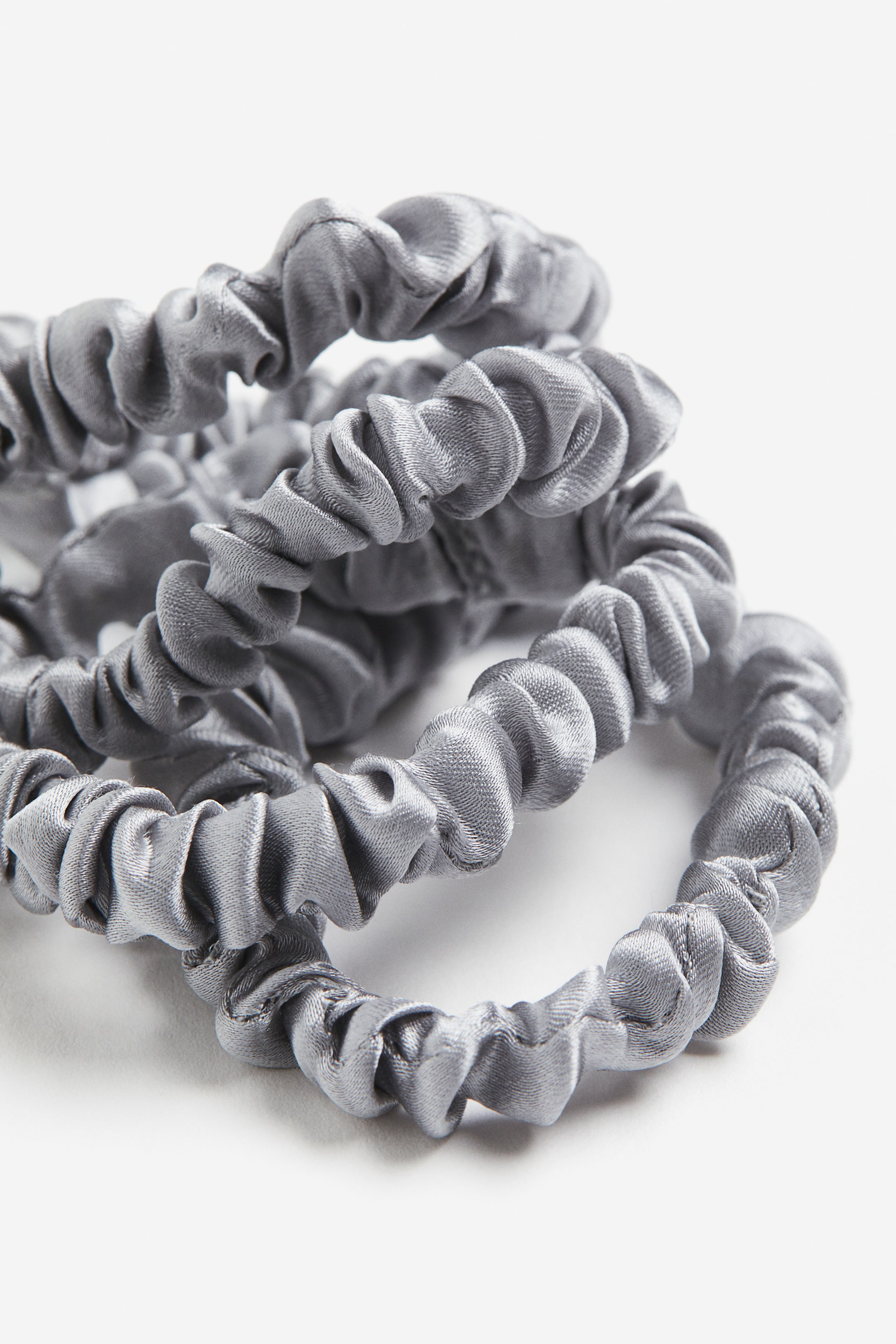Elasticized scrunchies in mulberry silk for reduced damage to hair.