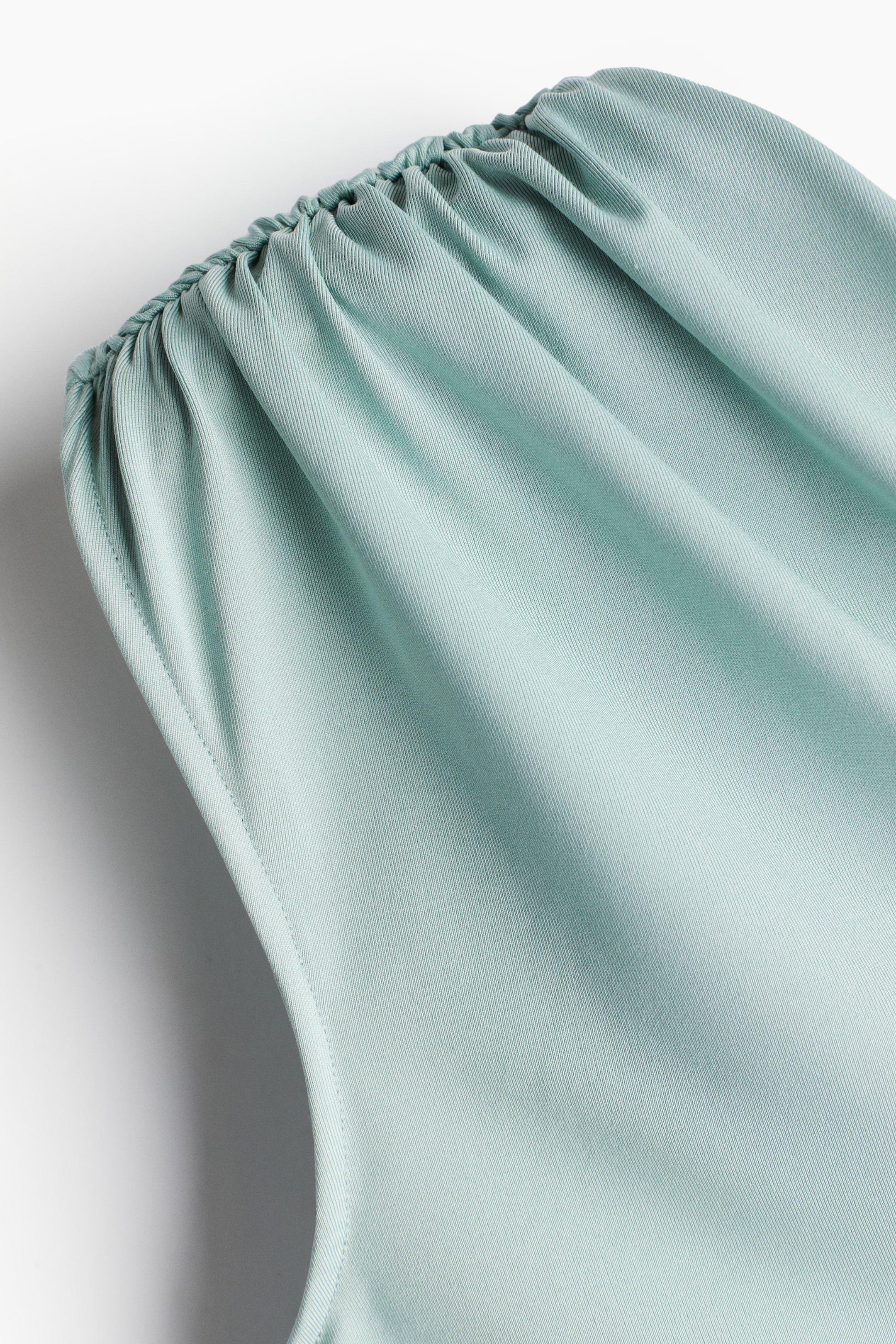 Short, fitted, one-shoulder dress in soft jersey with an asymmetric neckline. Gathered seams on shoulders and at one side of waist for a gently draped effect.