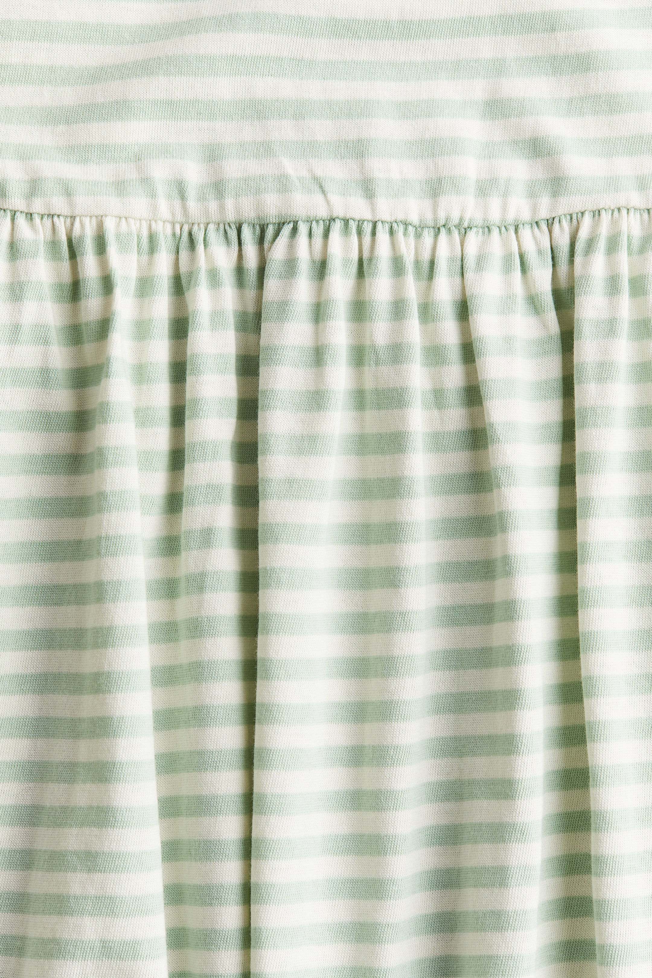Dress in soft cotton jersey with narrow shoulder straps. Gathered seam above a gently flared skirt.