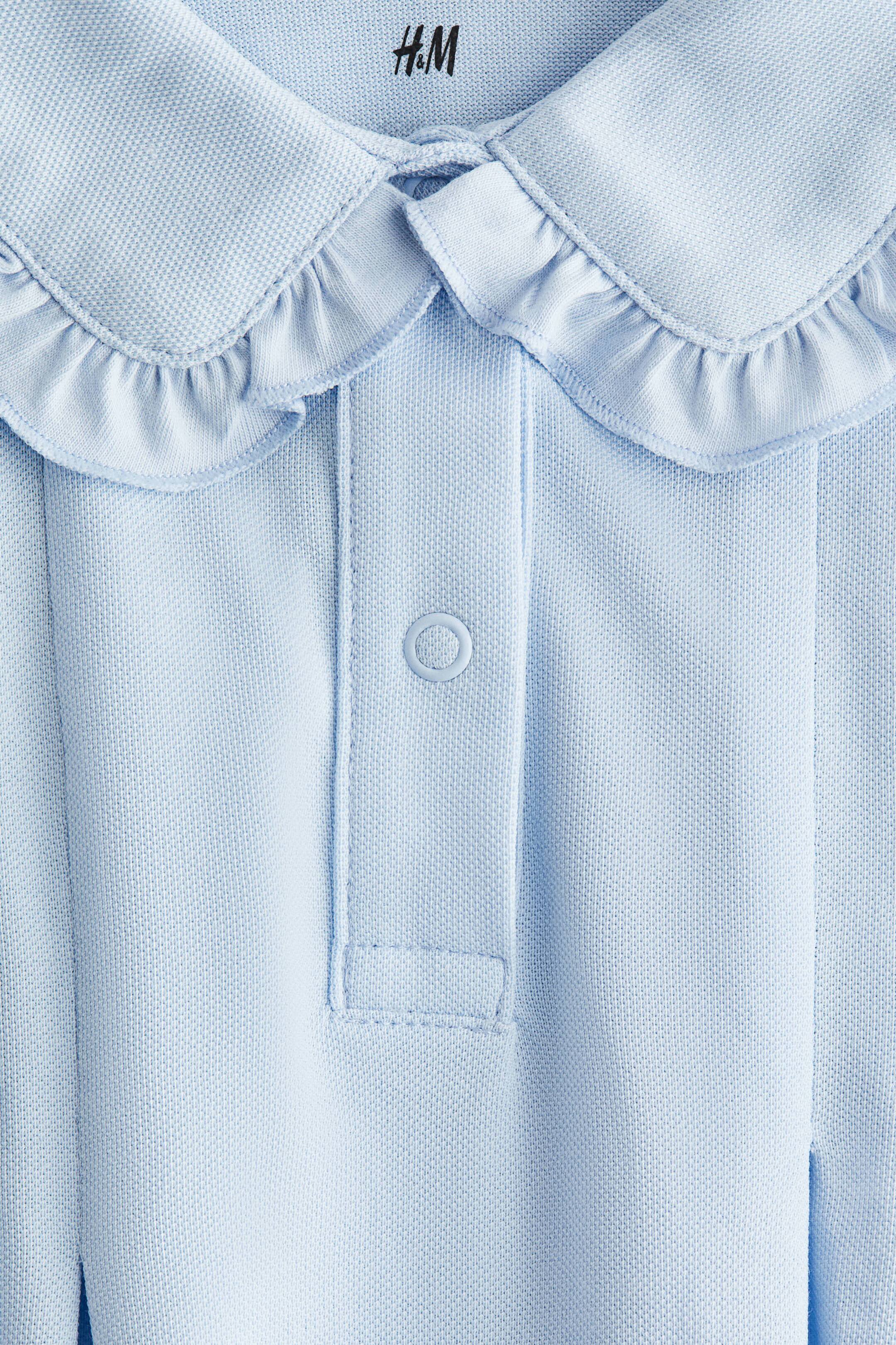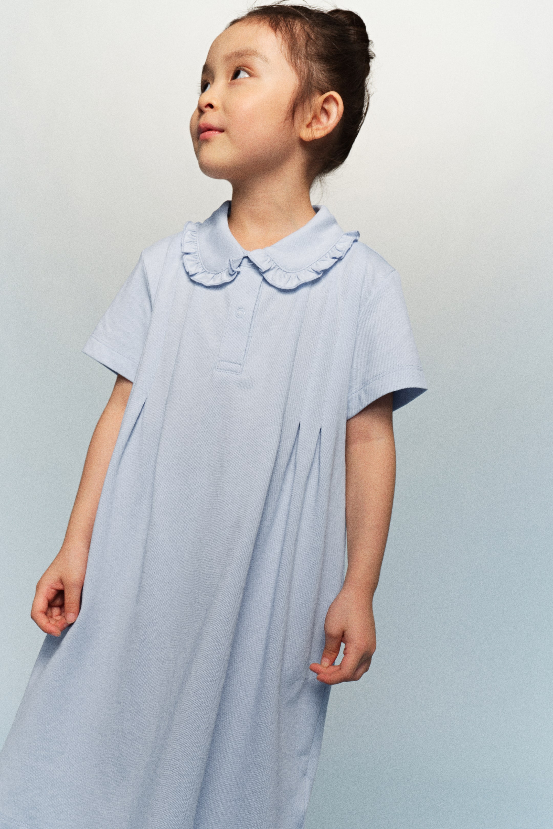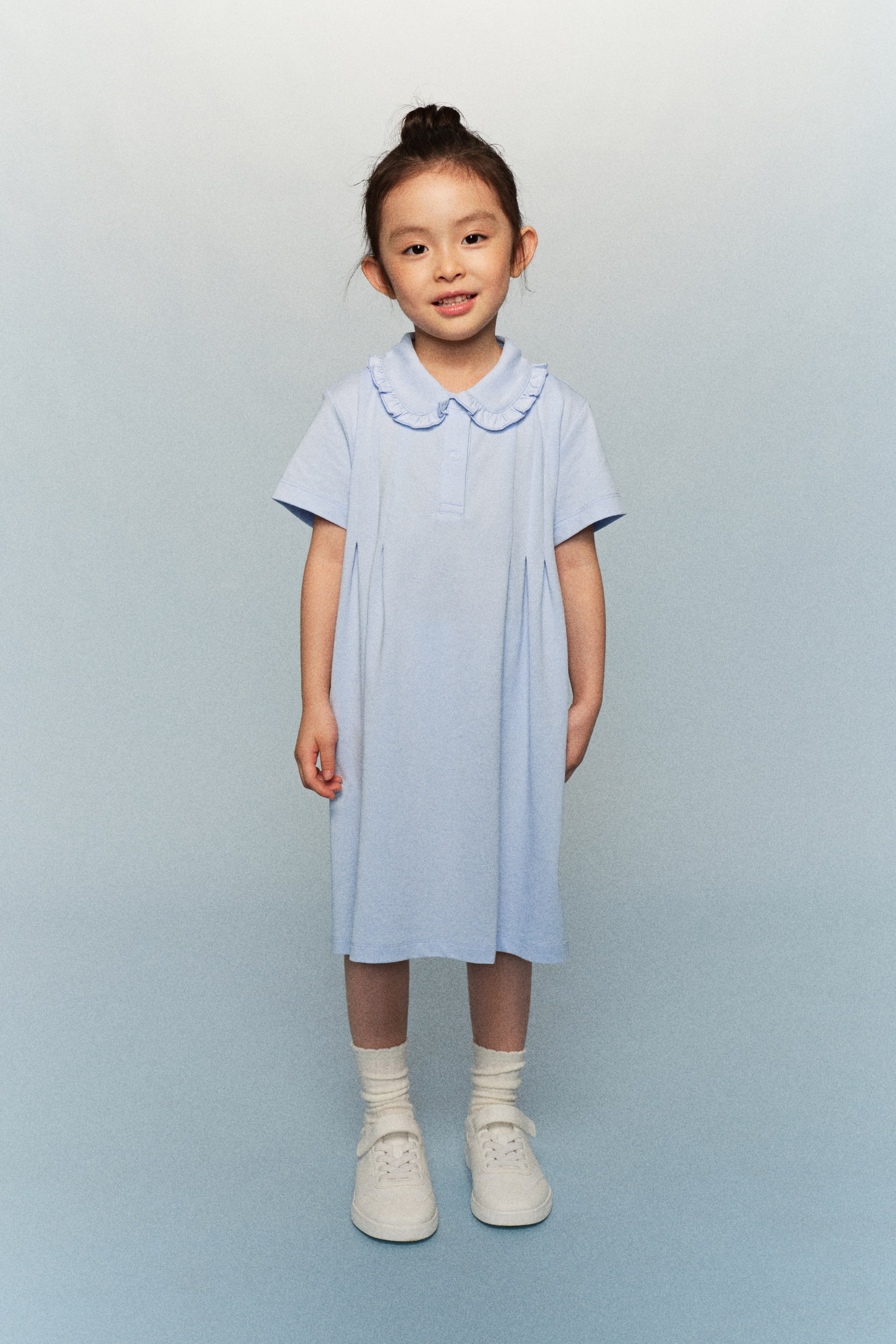 Short-sleeved dress in soft piqué. Ruffle-trimmed collar, placket with snap fasteners, and pleats at top. Made with COOLMAX® fiber – an engineered channelled fiber that wicks moisture away from the body to the fabric surface.