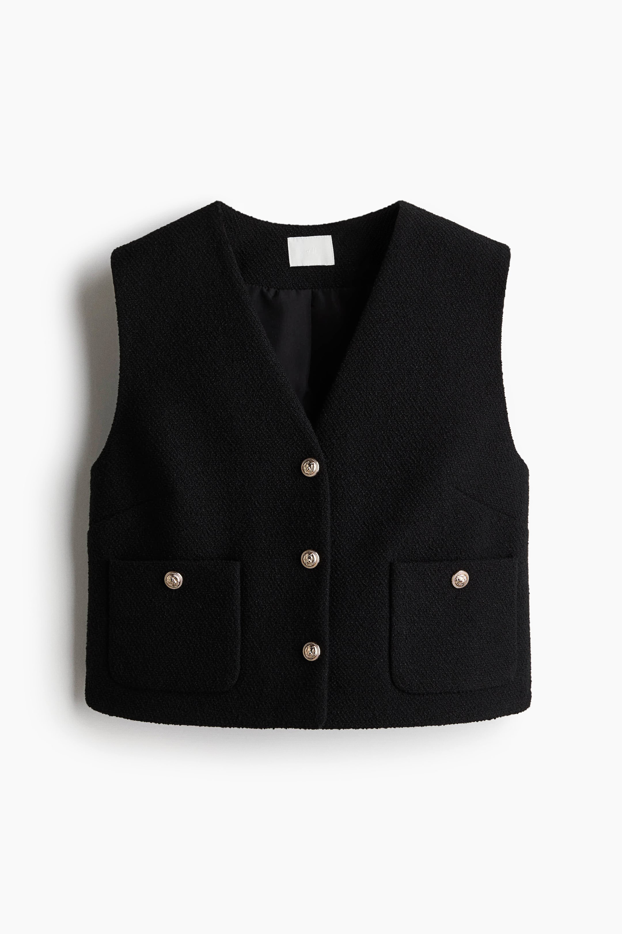 Tailored, fitted vest in woven bouclé fabric. V-neck, buttons at front, darts at bust, and patch front pockets with button. Straight-cut hem with gently curved side vents. Lined.