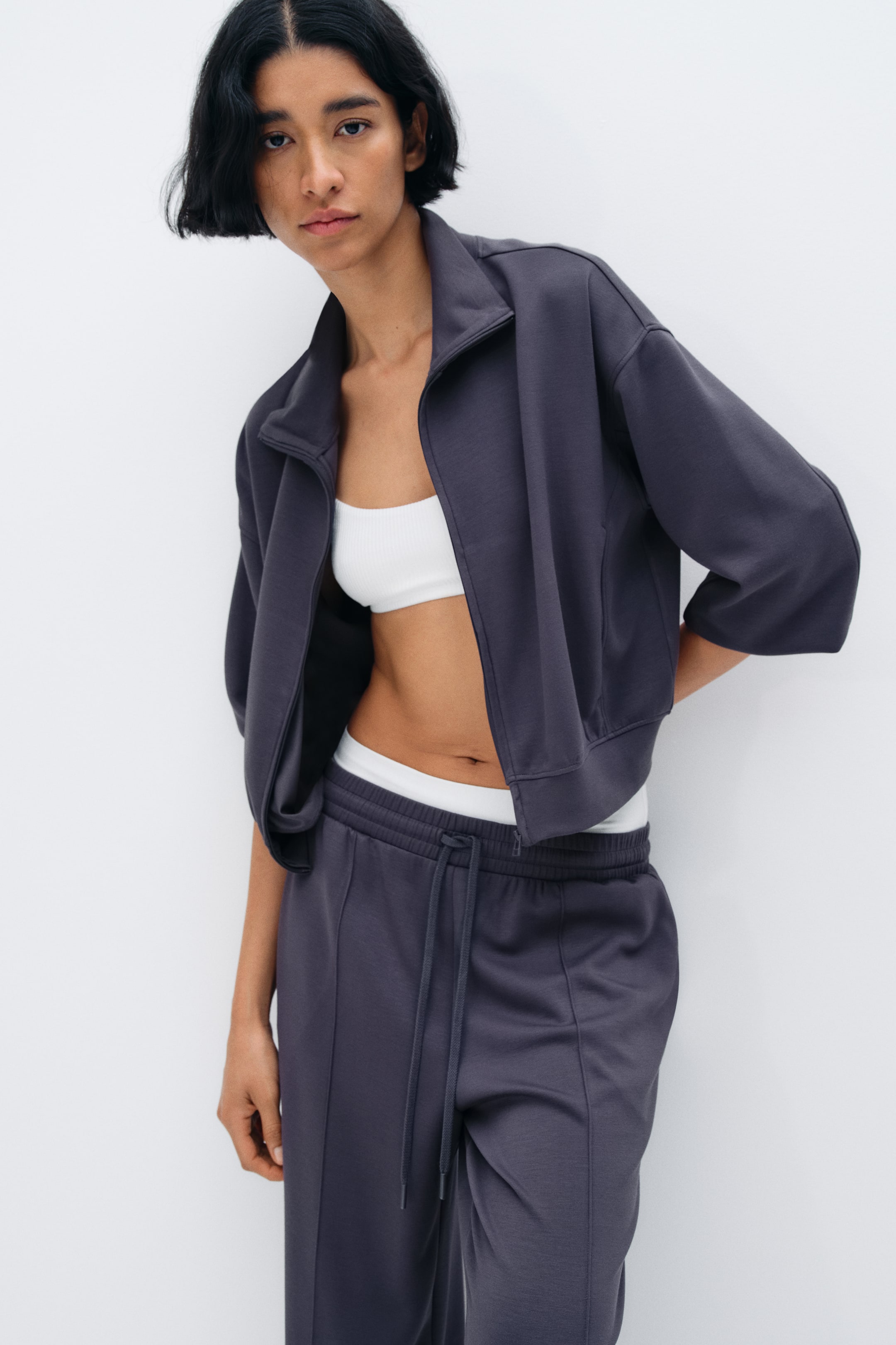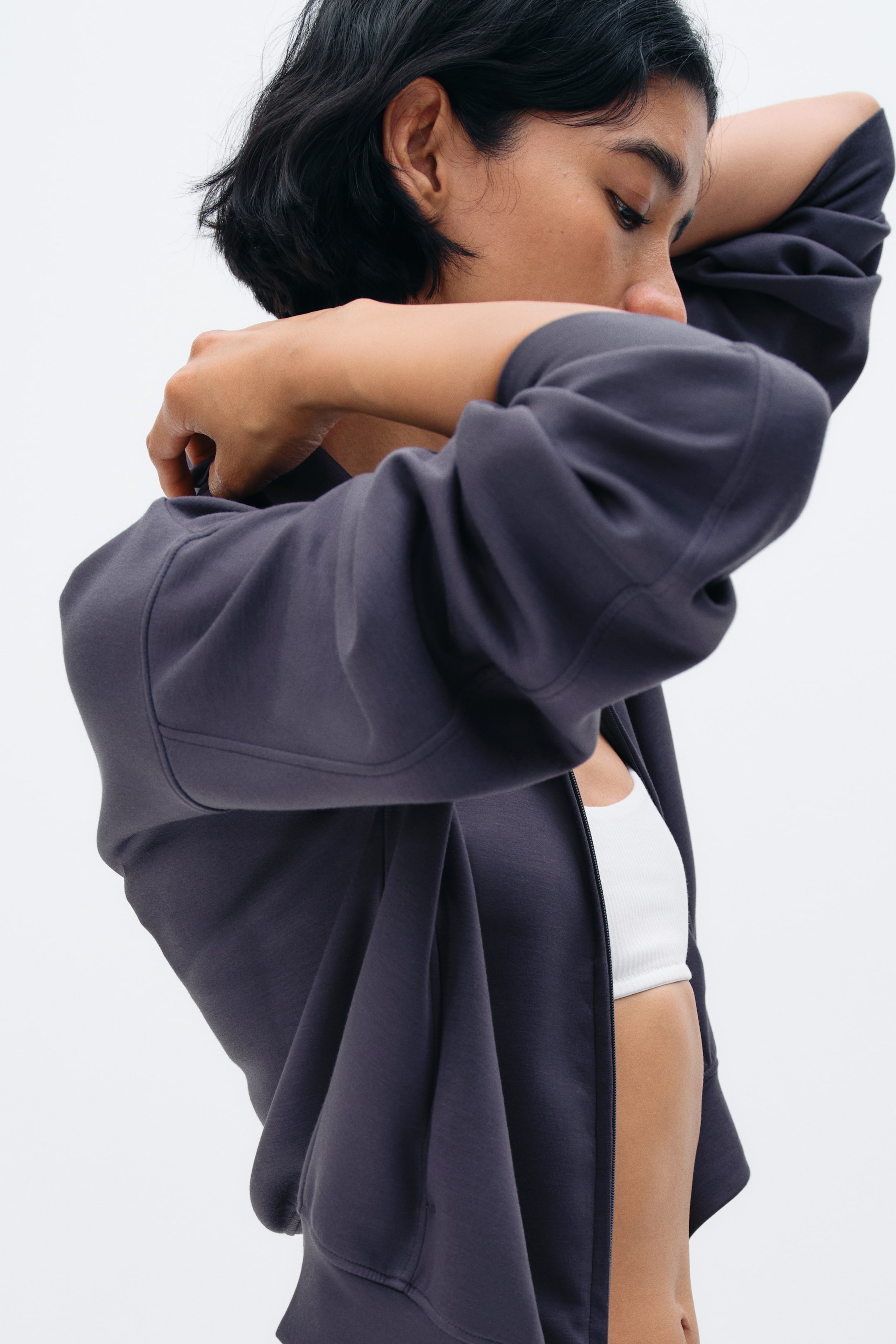 Jacket in supersoft jersey. Stand-up collar, concealed zipper at front, dropped shoulders, and long sleeves with cuffs. Forward-facing side seams with discreet side pockets.