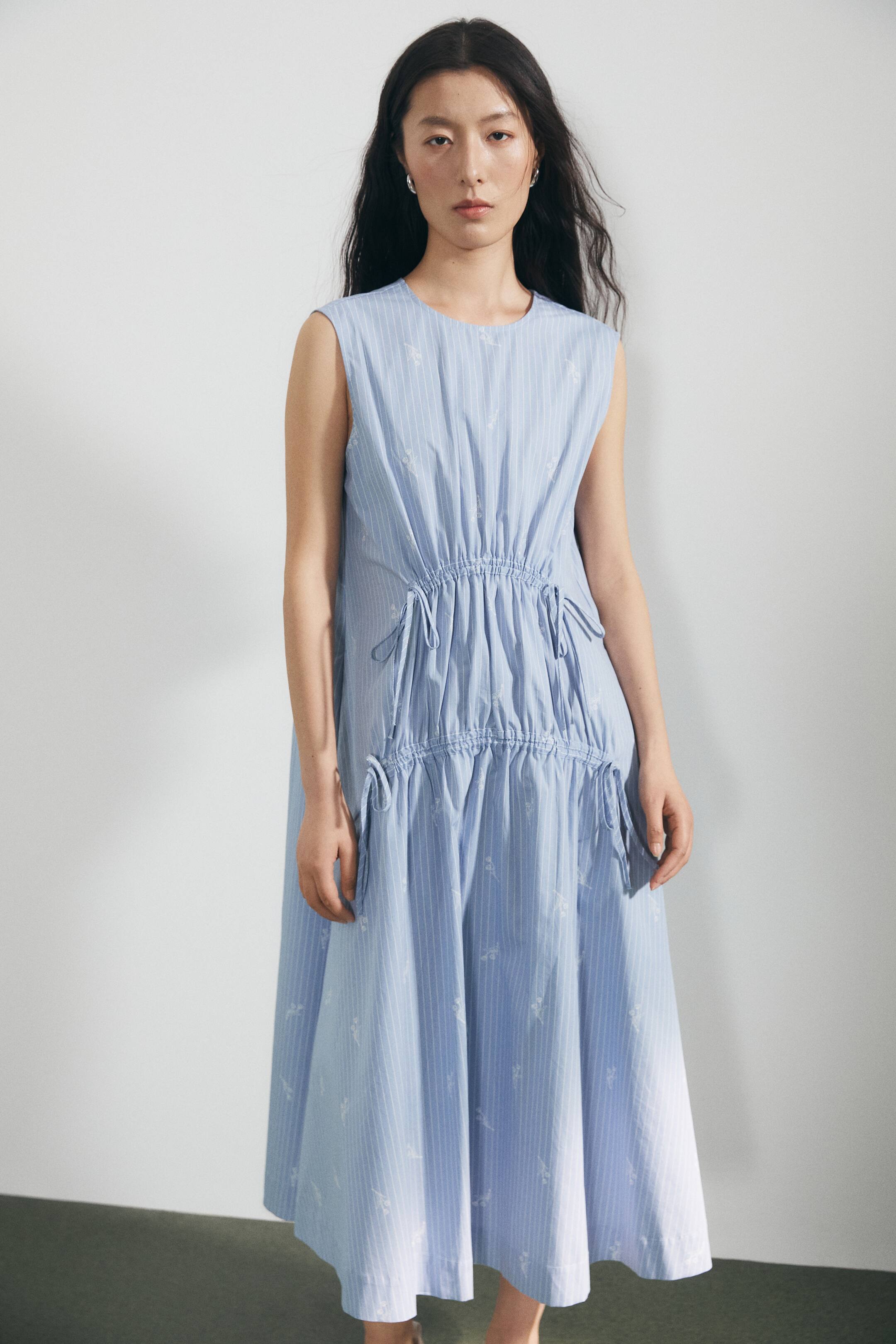 Loose-fit, sleeveless, calf-length dress in woven cotton. Round neckline, keyhole opening at back with a button, and discreet side pockets. Two sets of drawstrings at front for a gathered effect. Unlined.