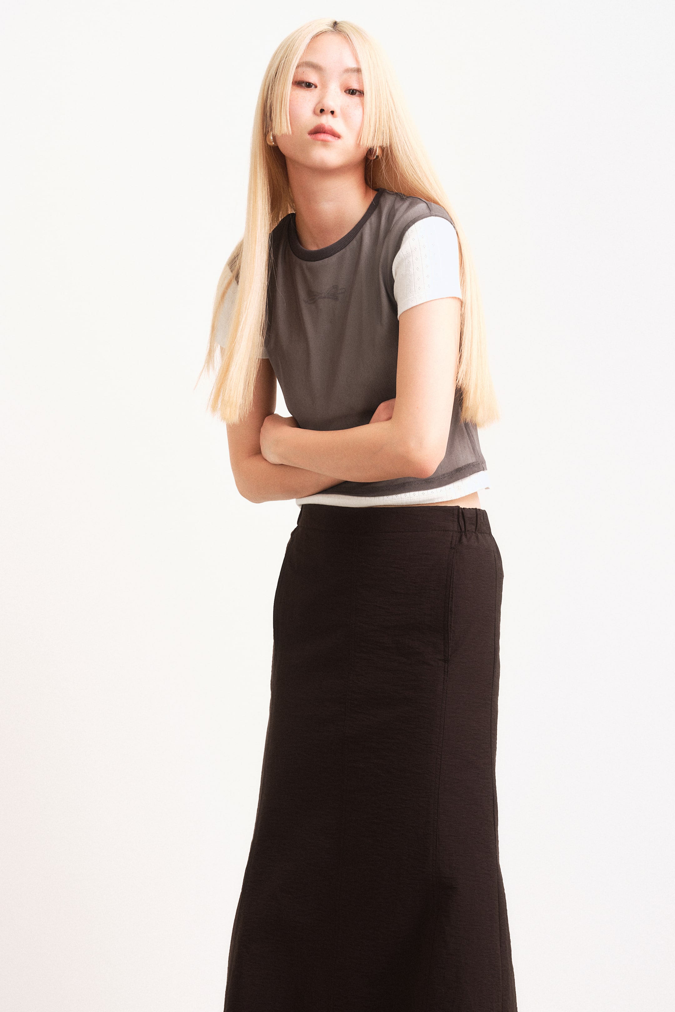 Crewneck T-shirt in ribbed jersey with a printed motif at front. T-shirt is layered under a cap-sleeved top in mesh.