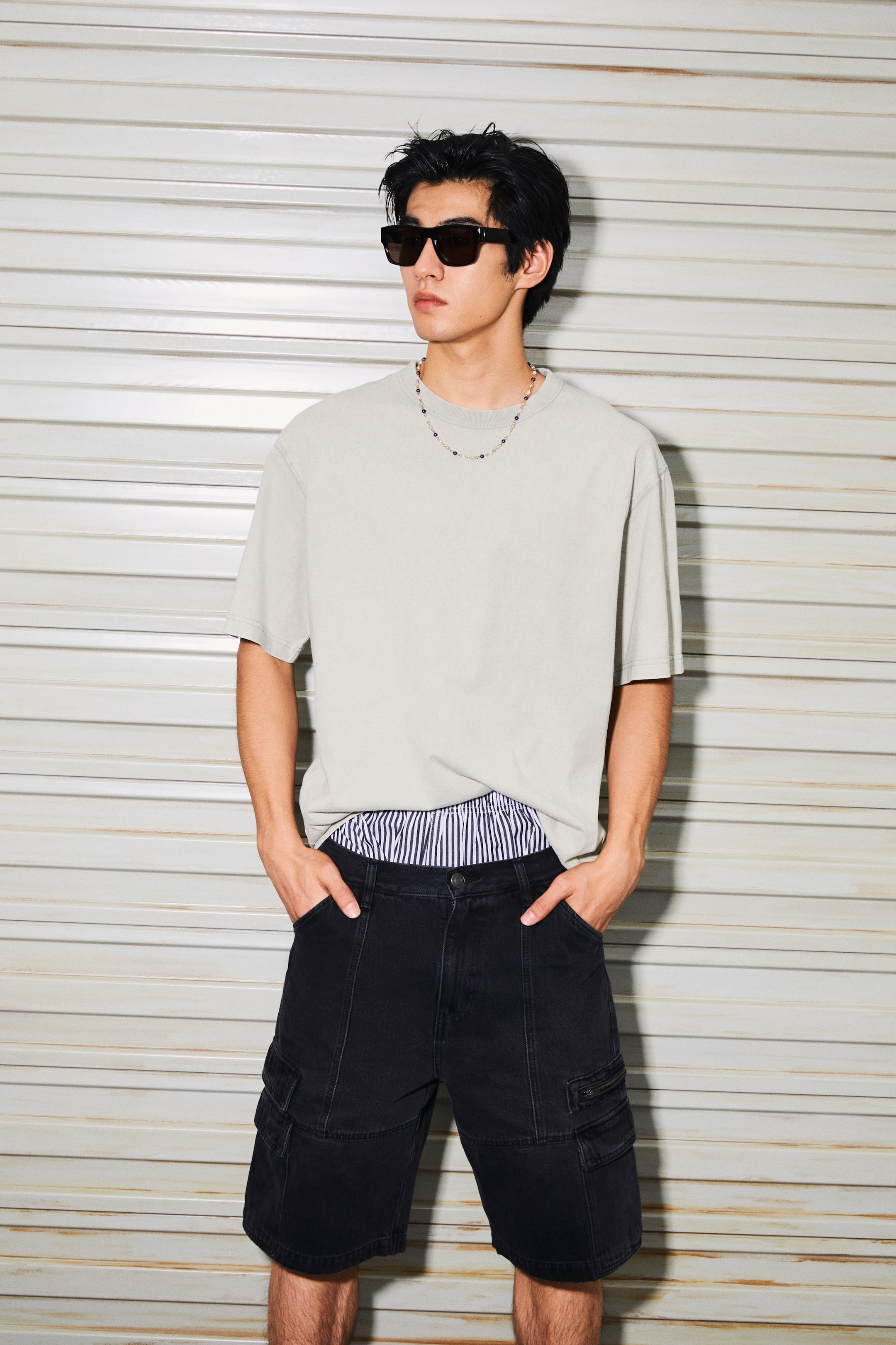 Boxy, loose-fit T-shirt in soft, washed-look heavyweight cotton jersey with a generous but not oversized silhouette. Round, ribbed neck, dropped shoulders, and a straight-cut hem.