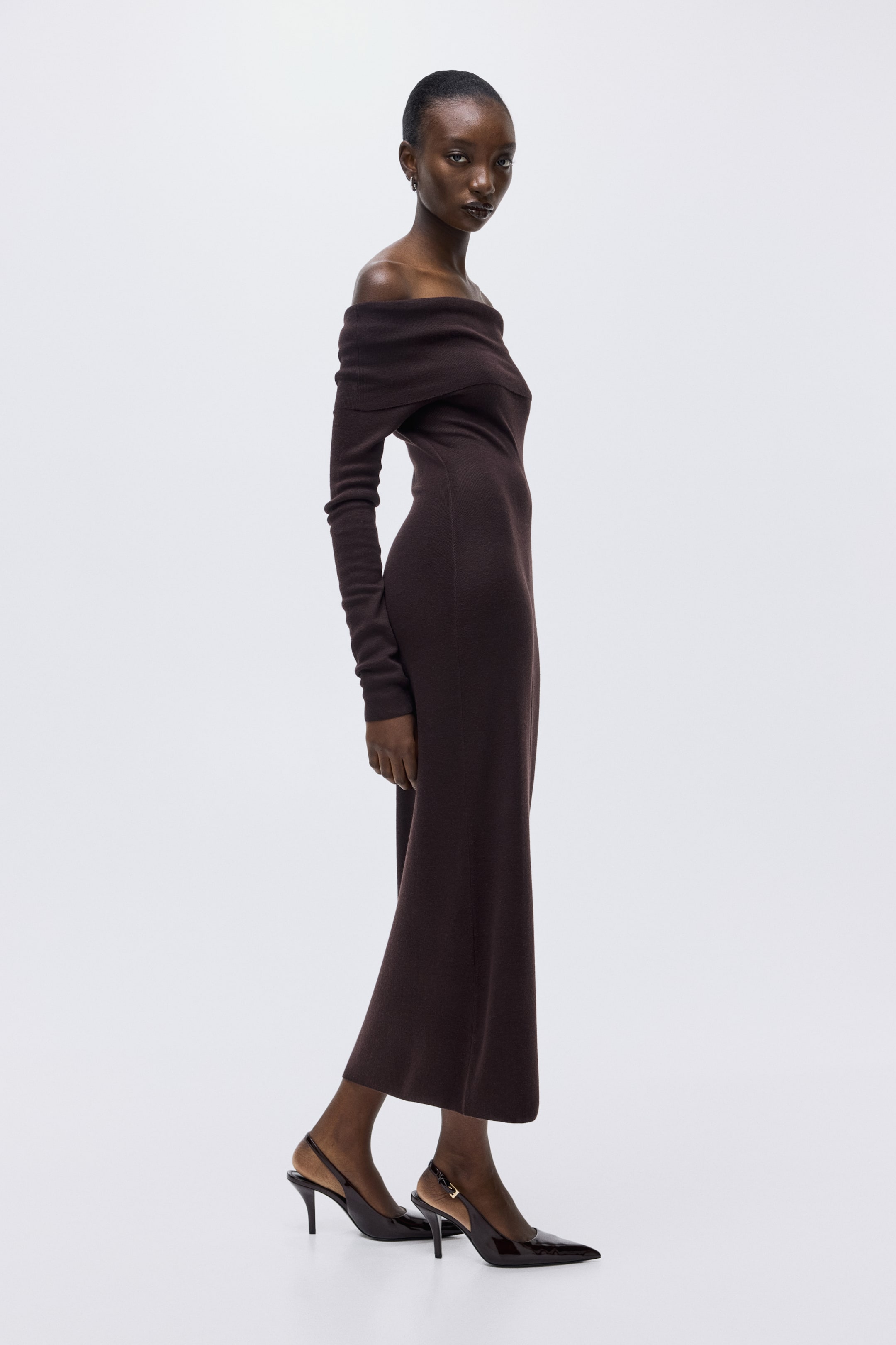 Fitted, ankle-length dress in a soft, fine knit. Wide foldover upper edge and long sleeves.