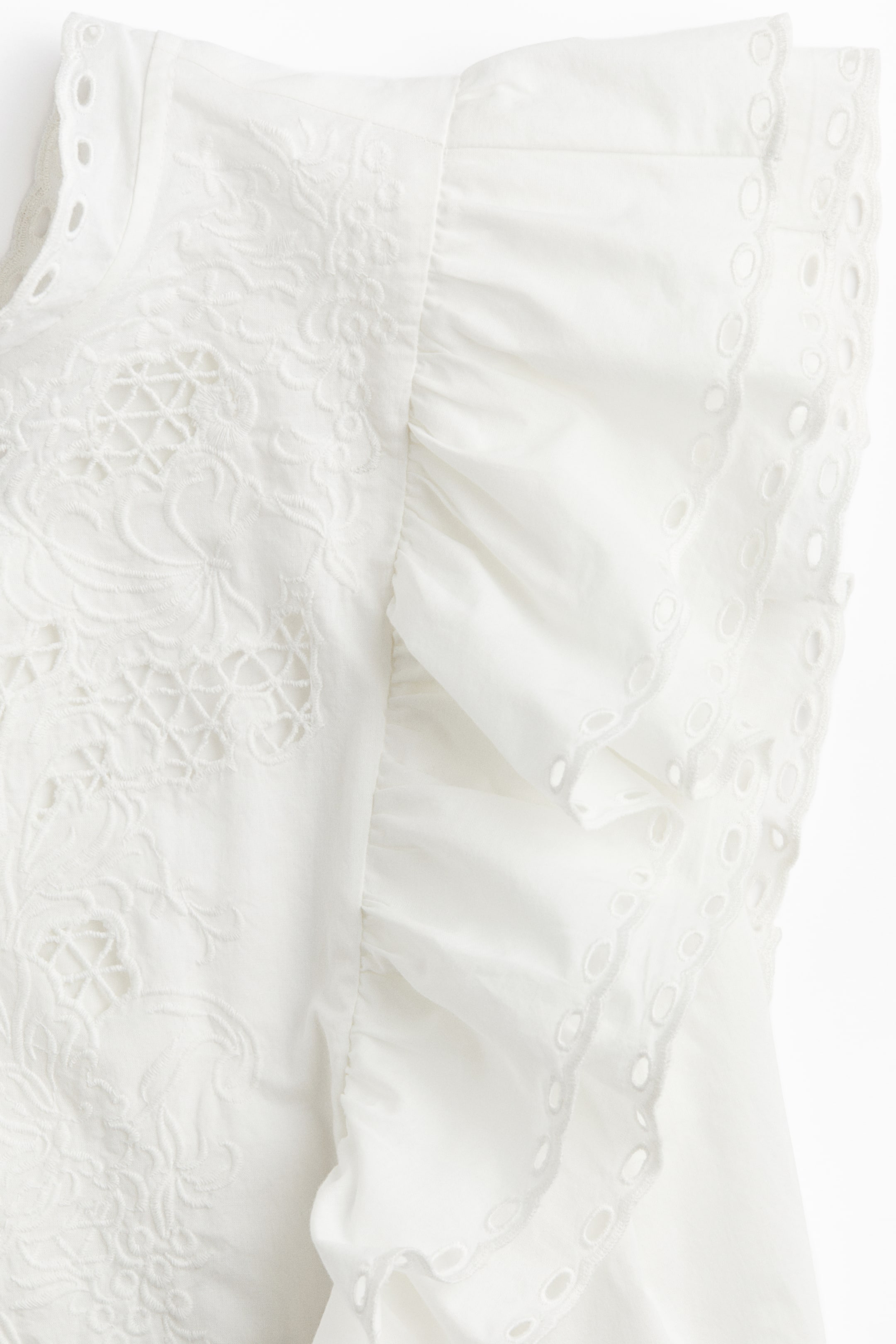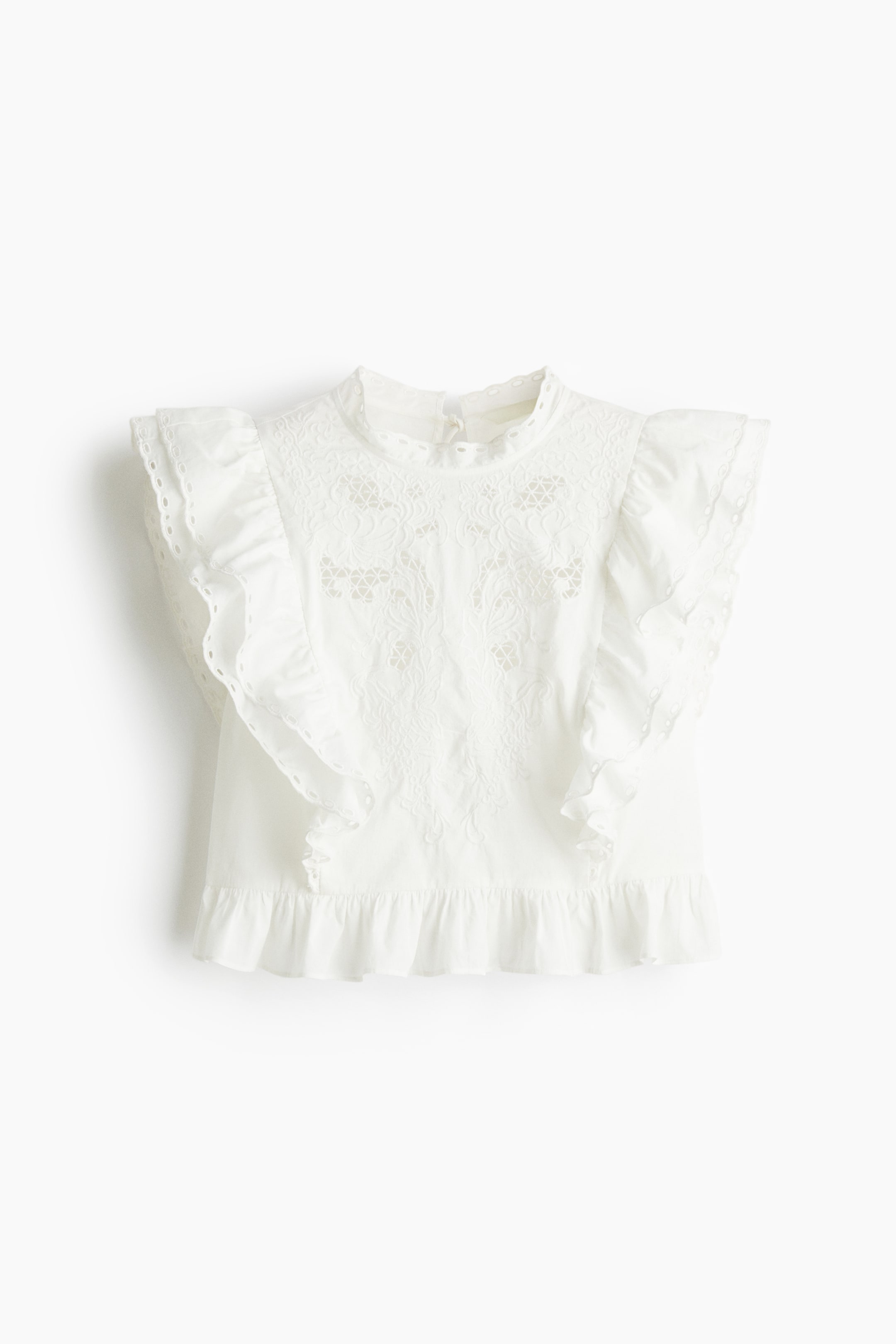Blouse in woven cotton with eyelet embroidery at front. Round, ruffle-trimmed neckline, double-layered ruffle trim at front extending over shoulders to back, and a slit at back with two pairs of narrow ties. Ruffle-trimmed hem.