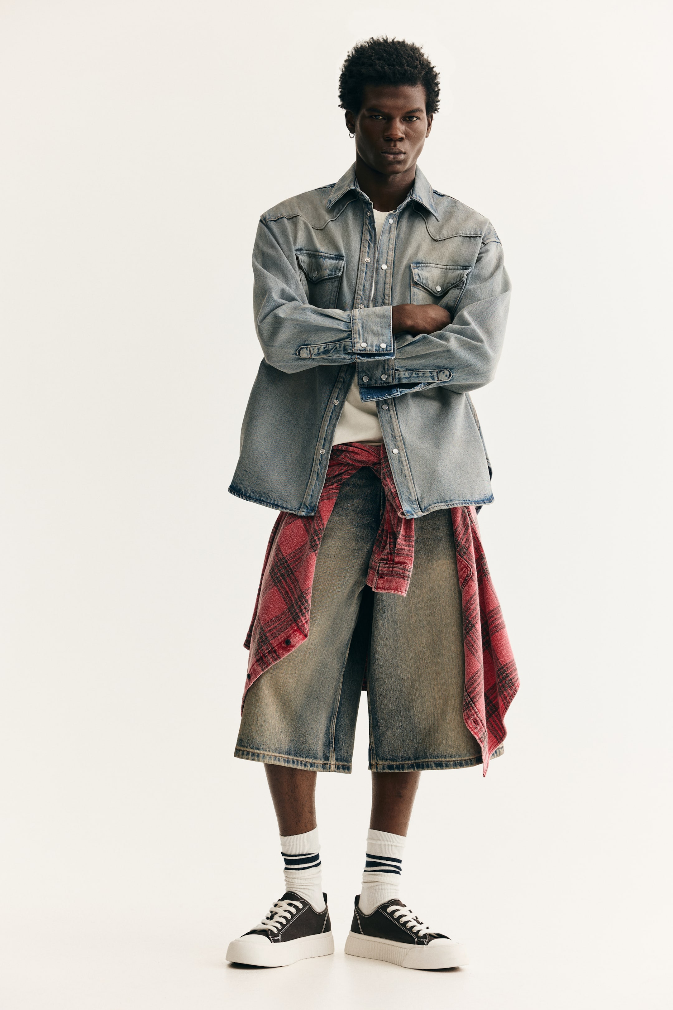 Oversized, Western-inspired shirt in rigid cotton denim with an extra-loose silhouette. Collar, snap fasteners at front, and yoke at front and back. Chest pockets with flap and snap fastener, long sleeves, sleeve placket, and snap fastener at cuffs. Rounded hem.
