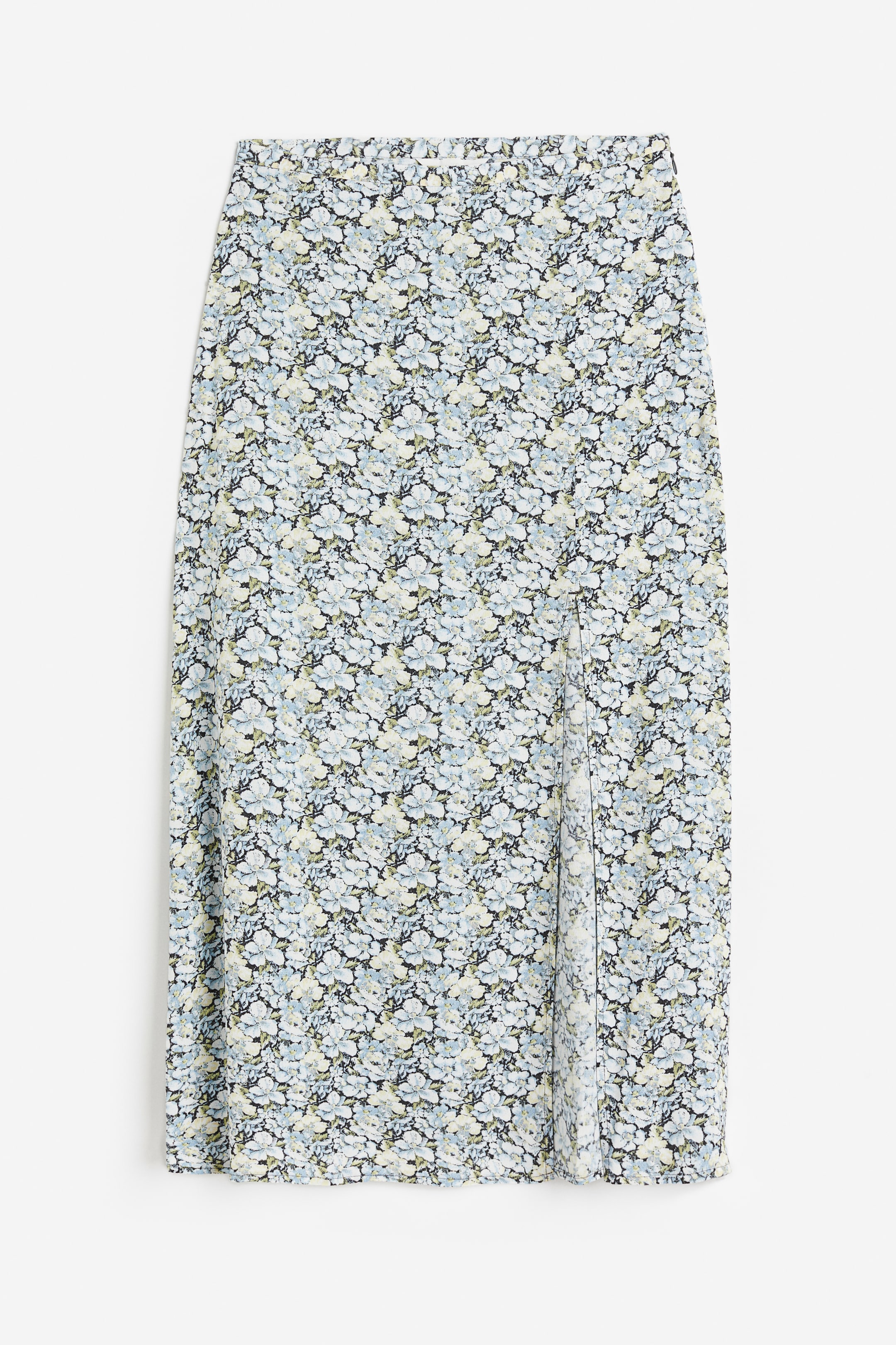 Calf-length, fitted skirt in a crêpe viscose weave with a high waist, and a concealed zip and hook-and-eye fastening at one side. High slit at the front. Unlined.